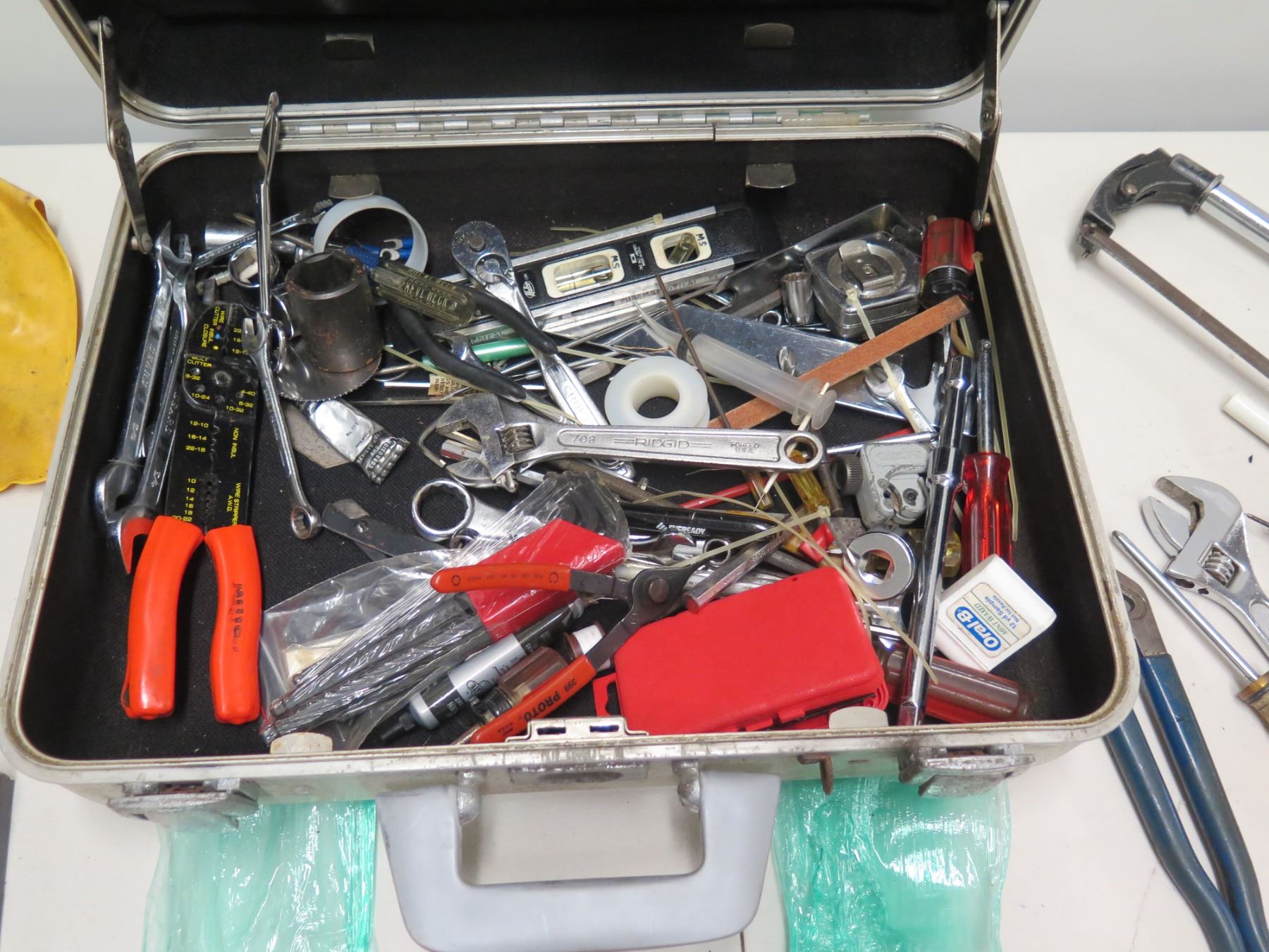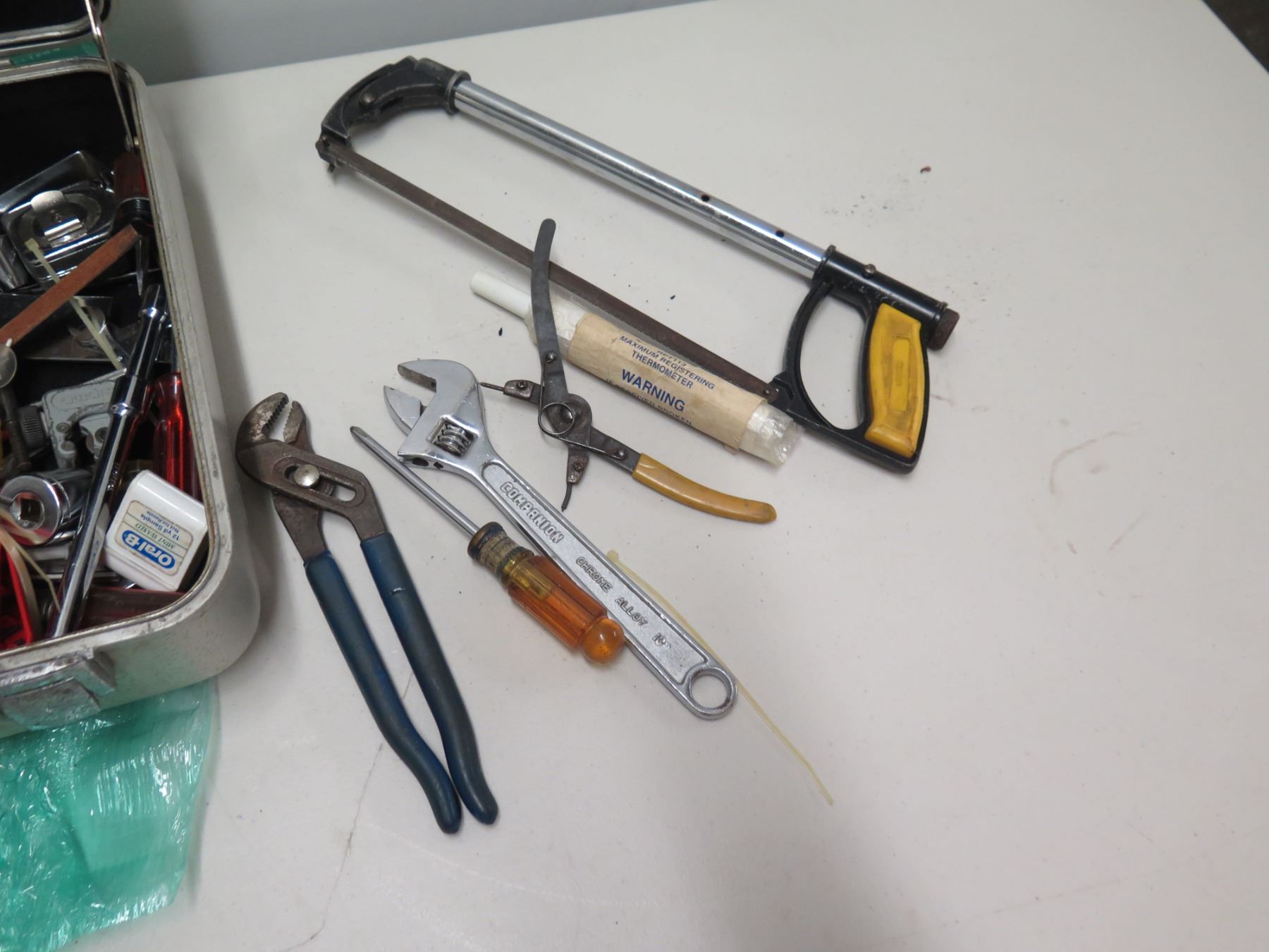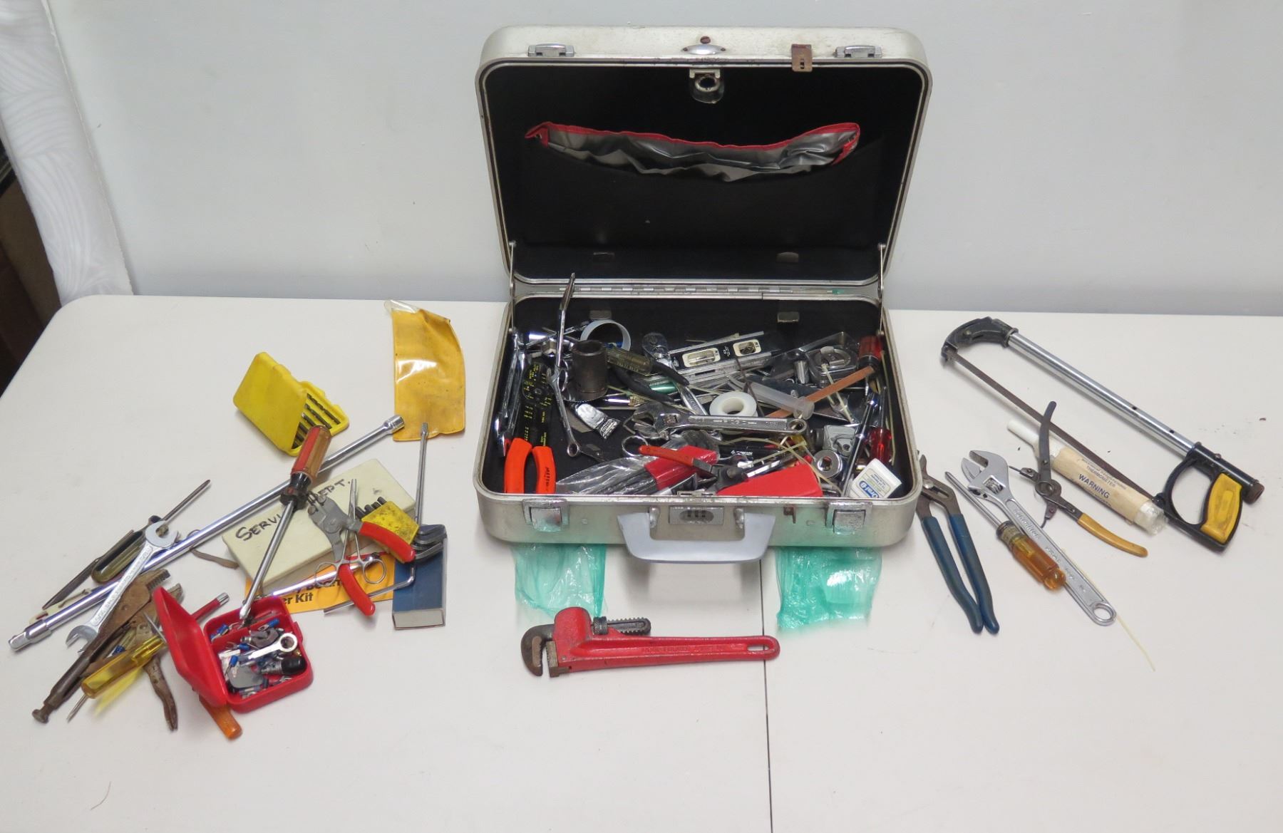 Multiple Hand Tools: Saw, Wrenches, Screwdrivers, Pliers, etc in Metal Case
