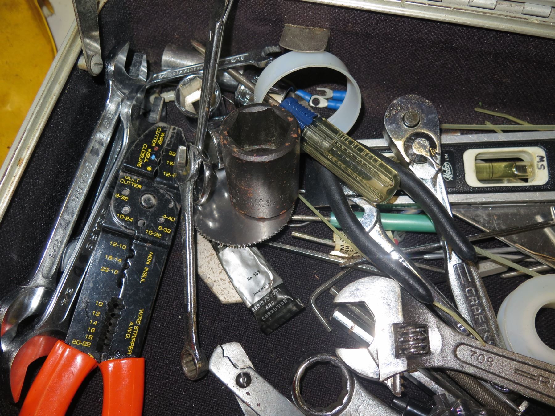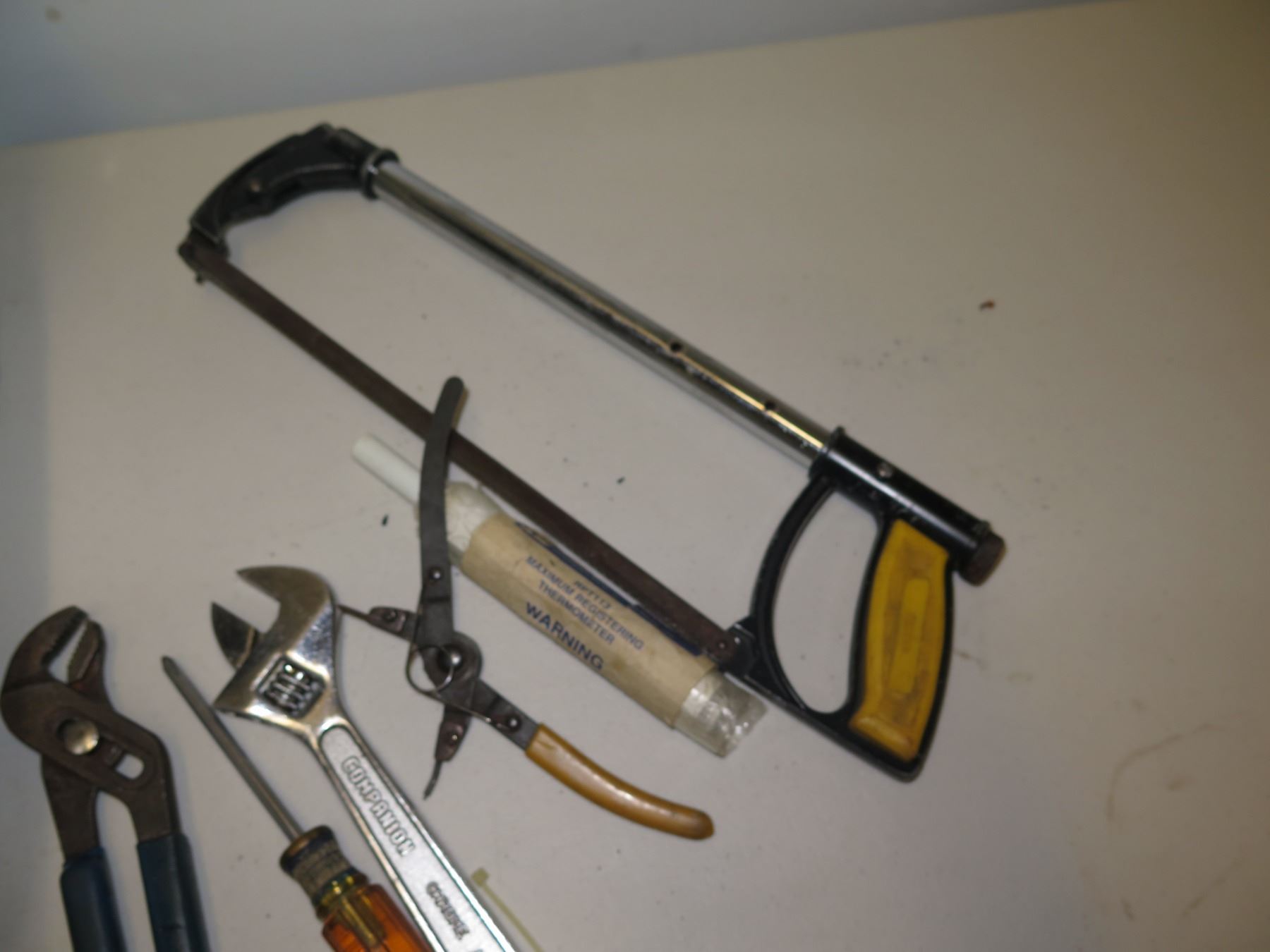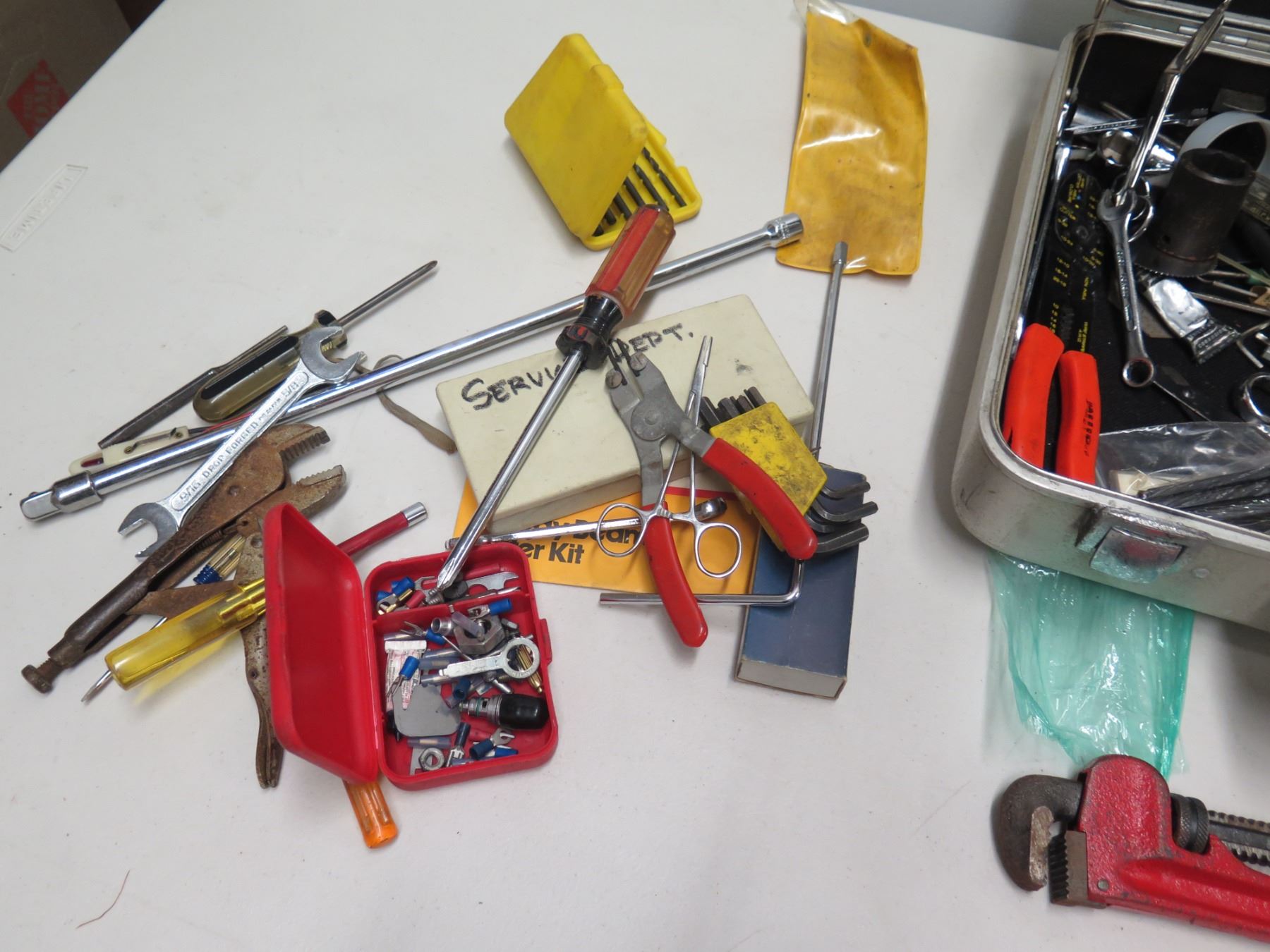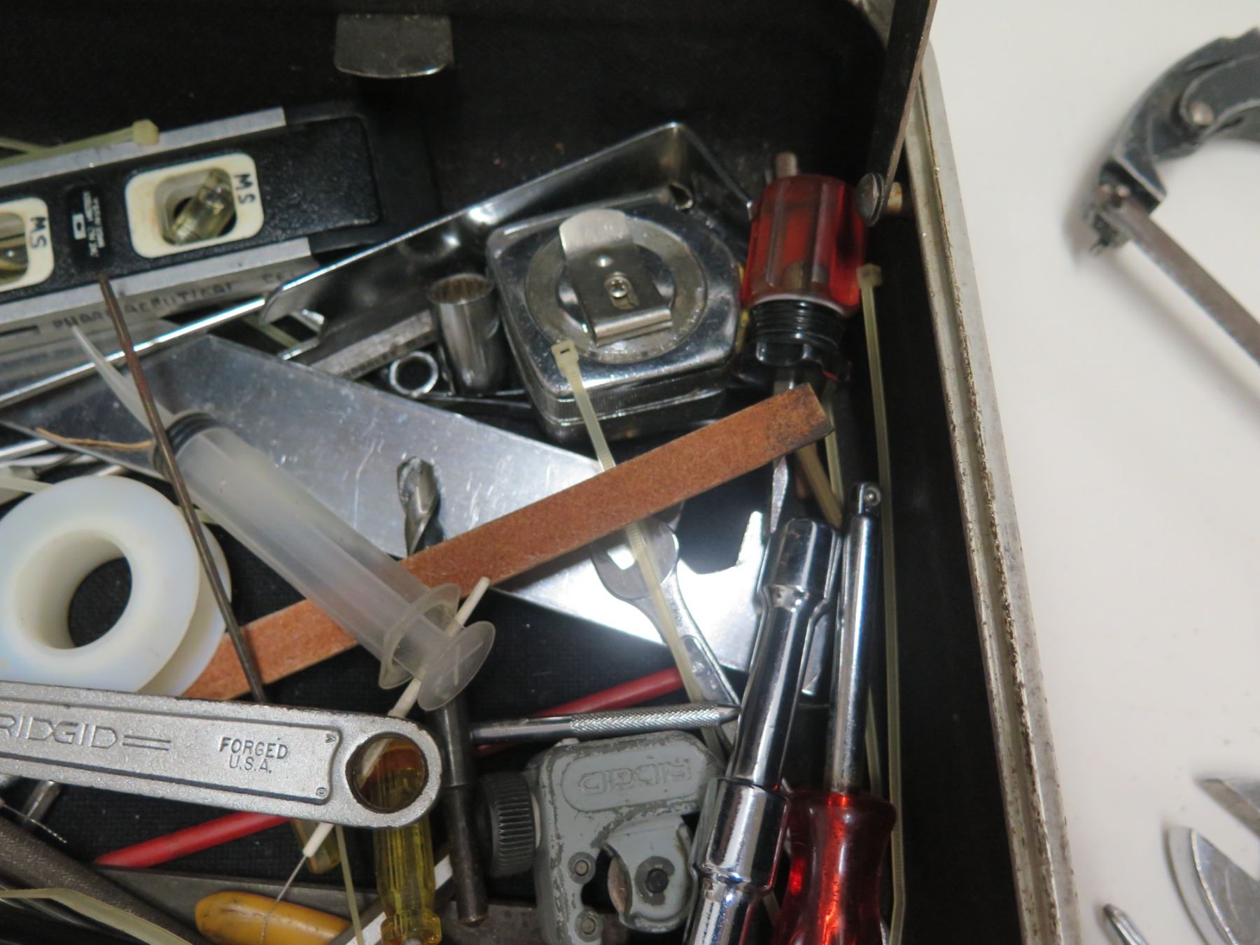 Multiple Hand Tools: Saw, Wrenches, Screwdrivers, Pliers, etc in Metal Case