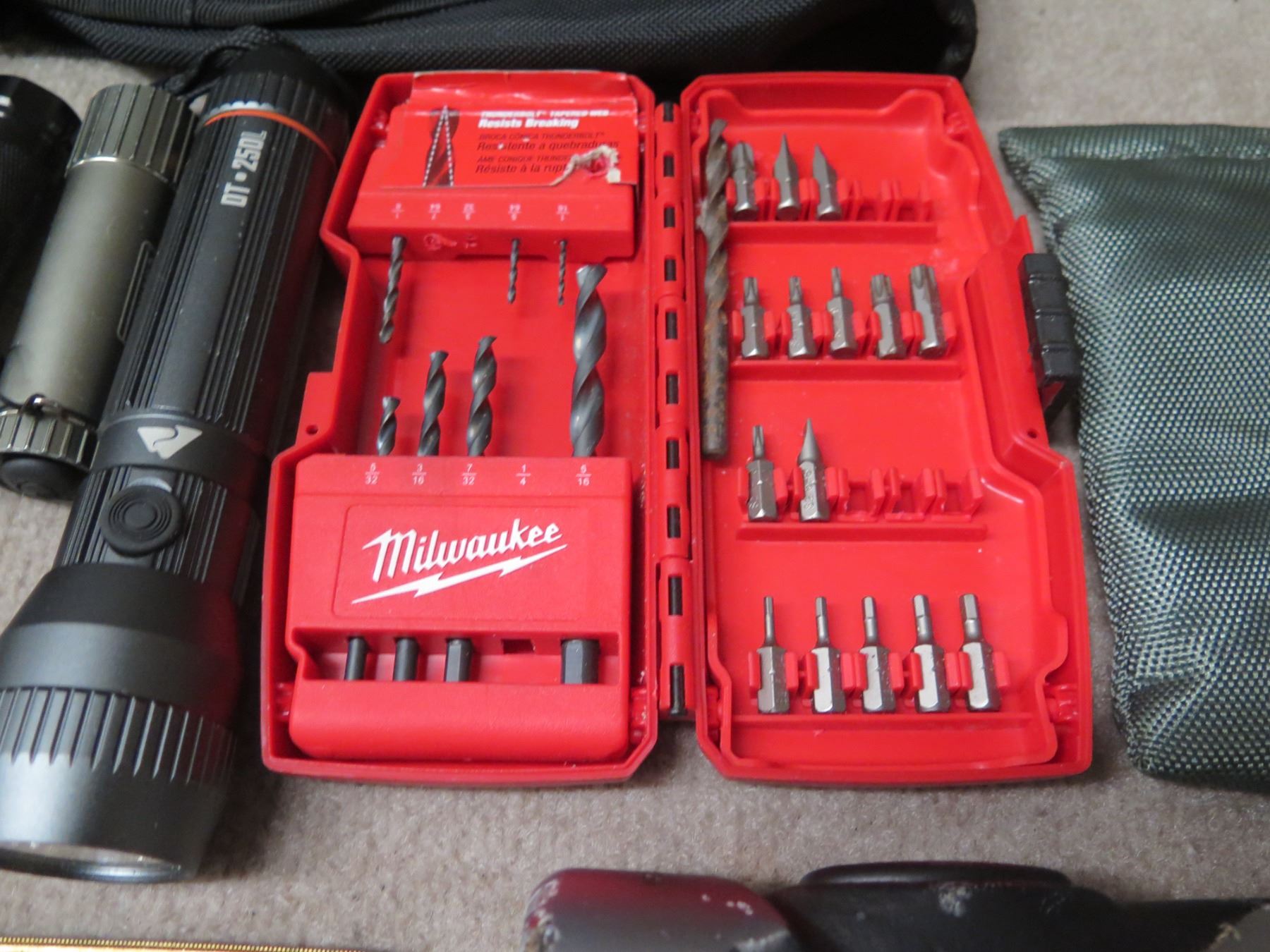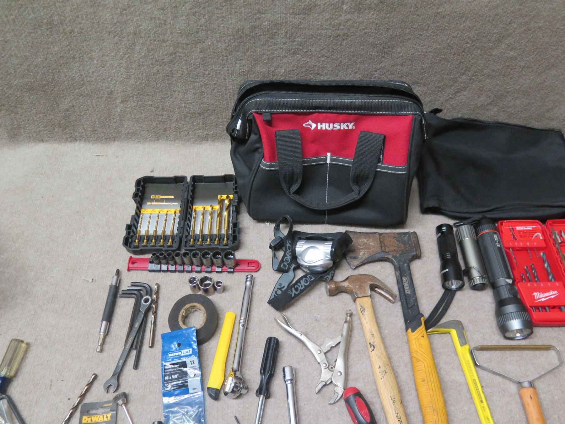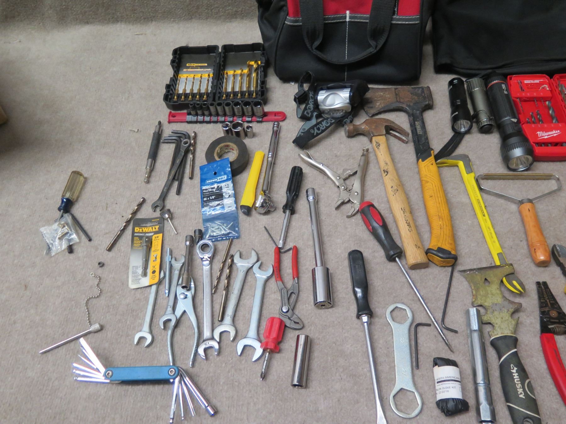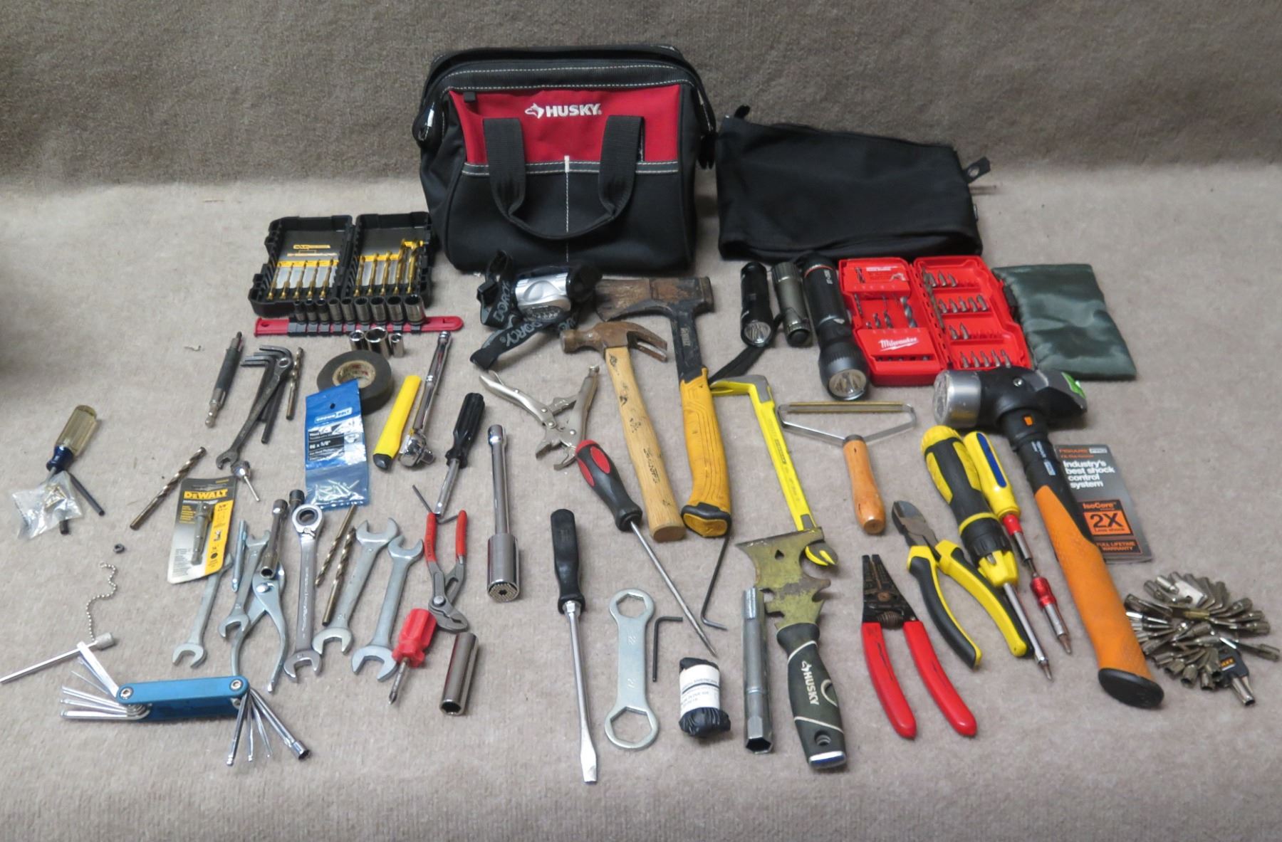 Multiple Hand Tools: Wrenches, Pliers, Hammers, Lights, Bits, etc in Case