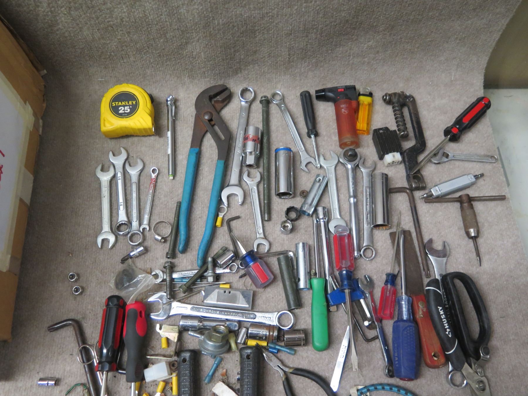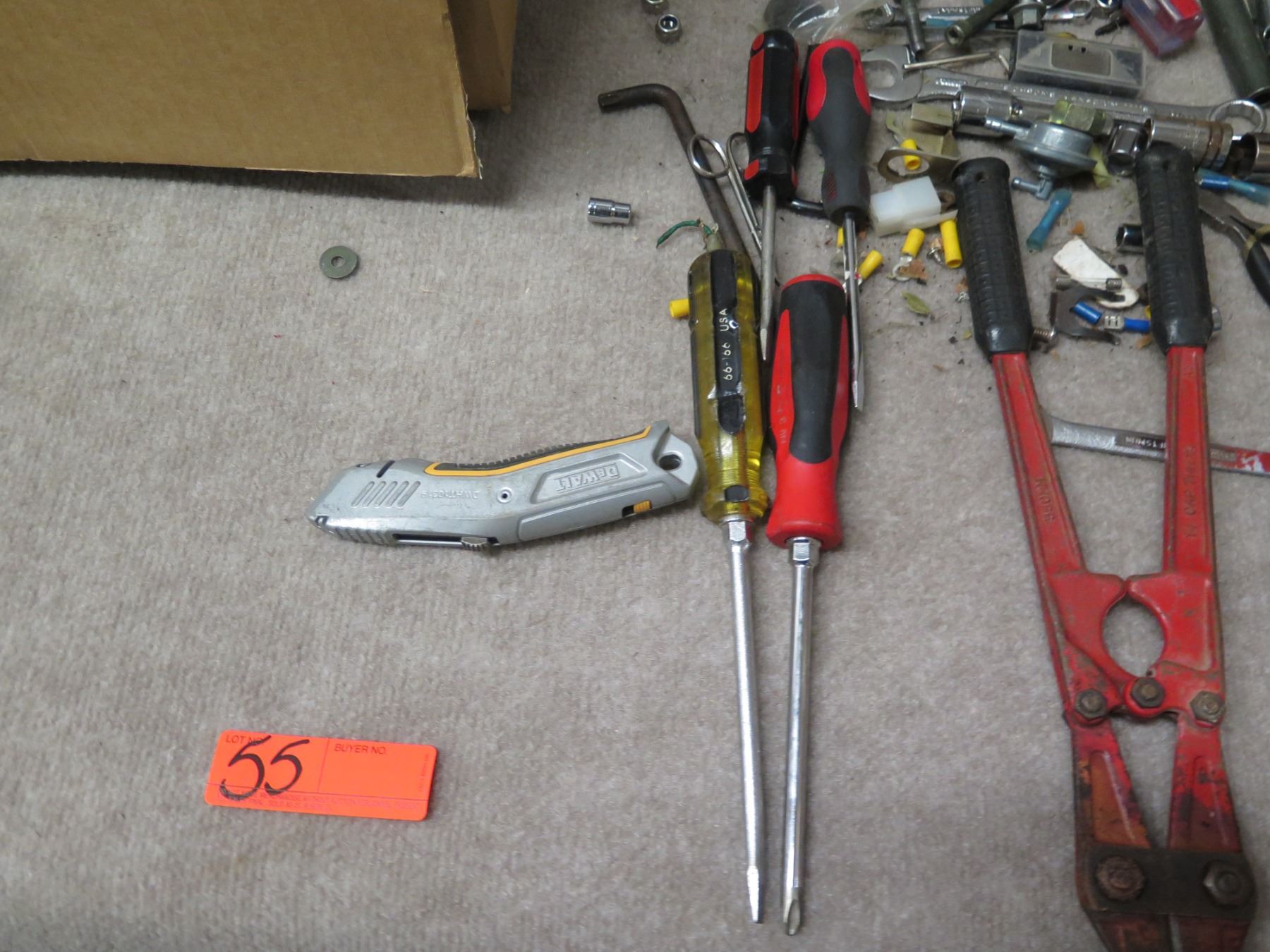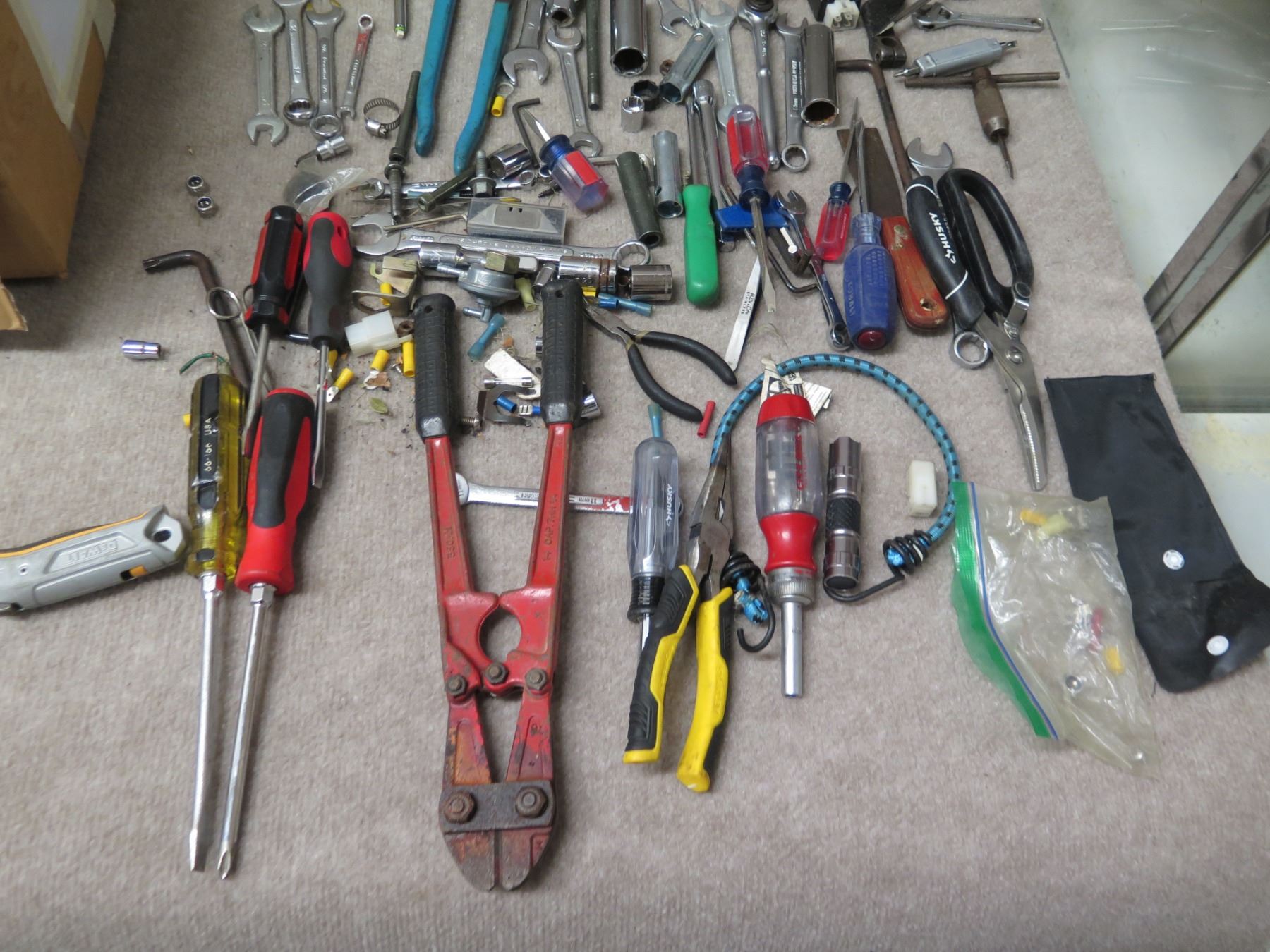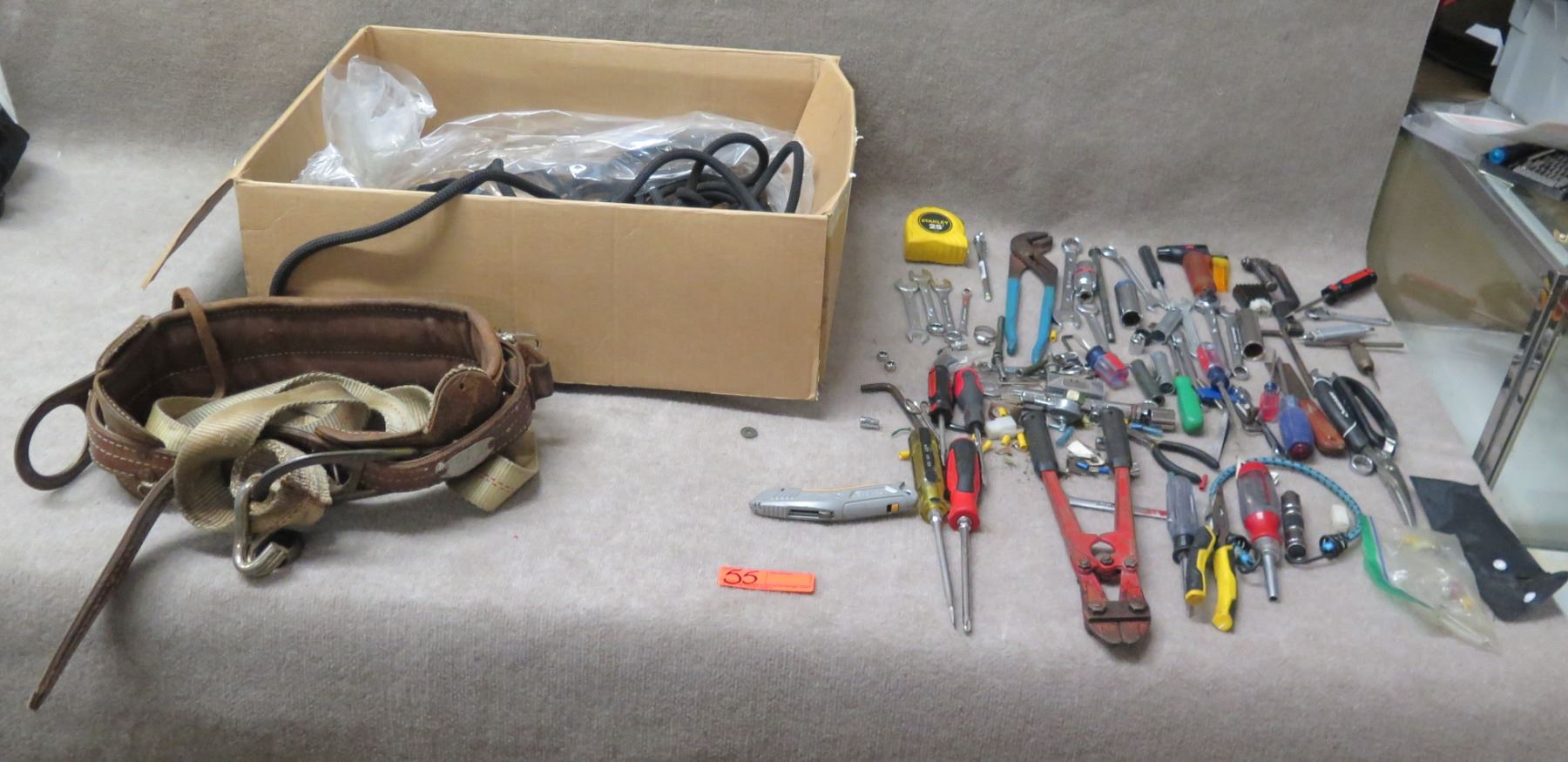 Multiple Hand Tools: Wrenches, Screwdrivers, Bolt Cutters, etc & Box Black Rope