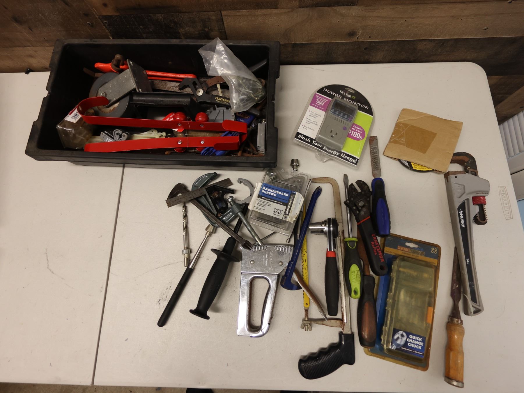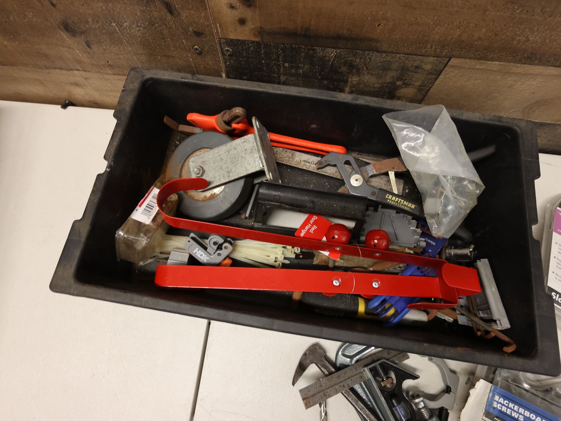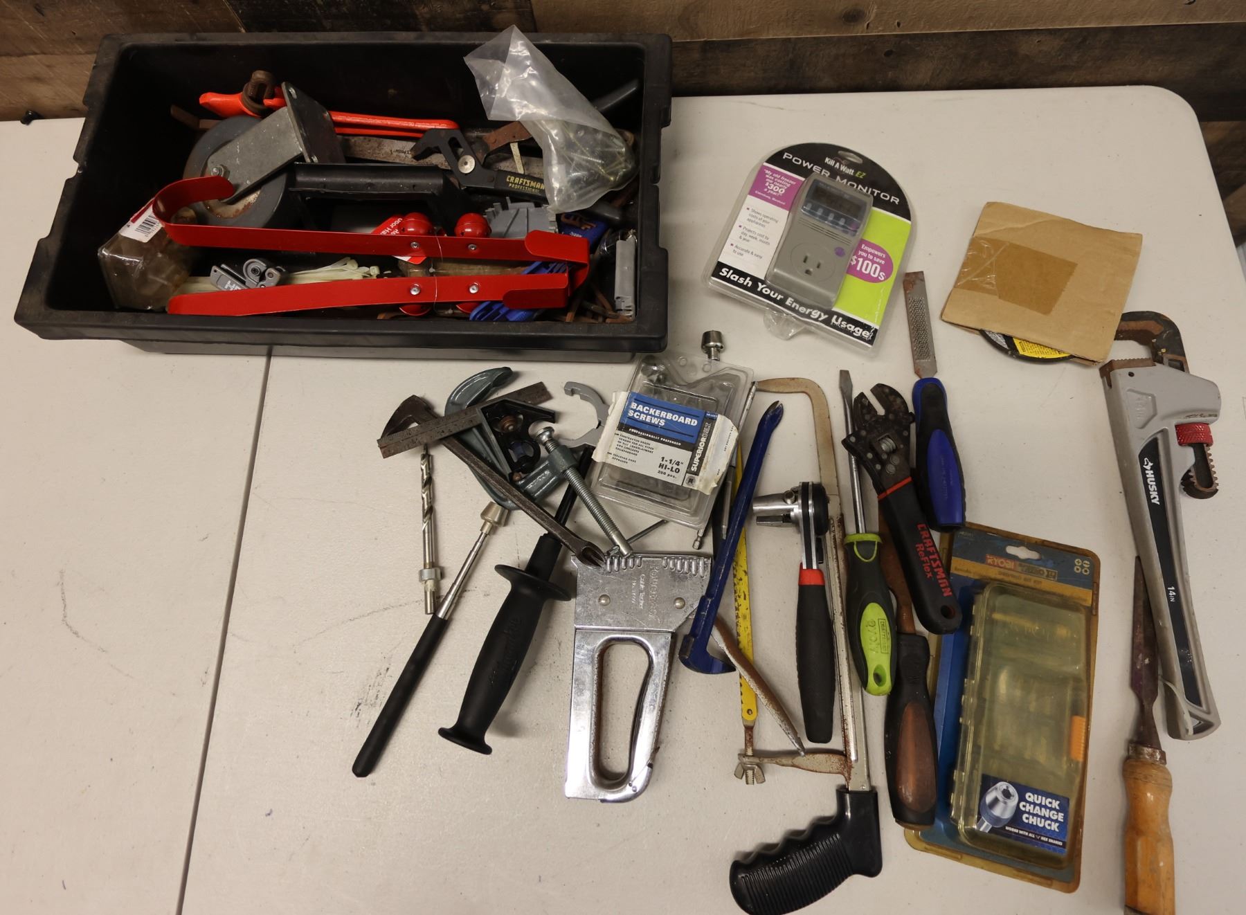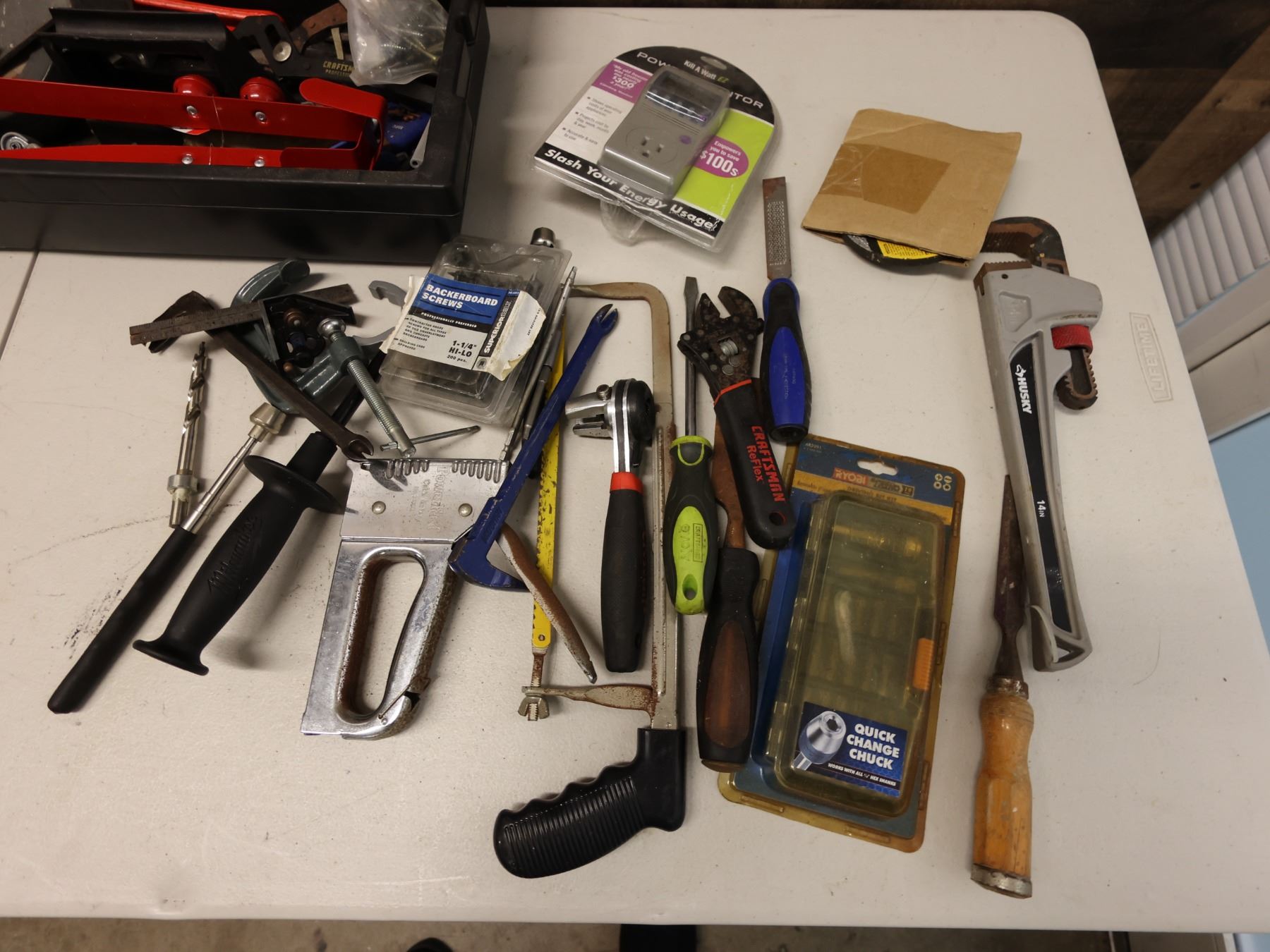 Multiple Hand Tools in Tray: Stapler, Quick Change Chuck, Wrenches, Power Monitor, etc