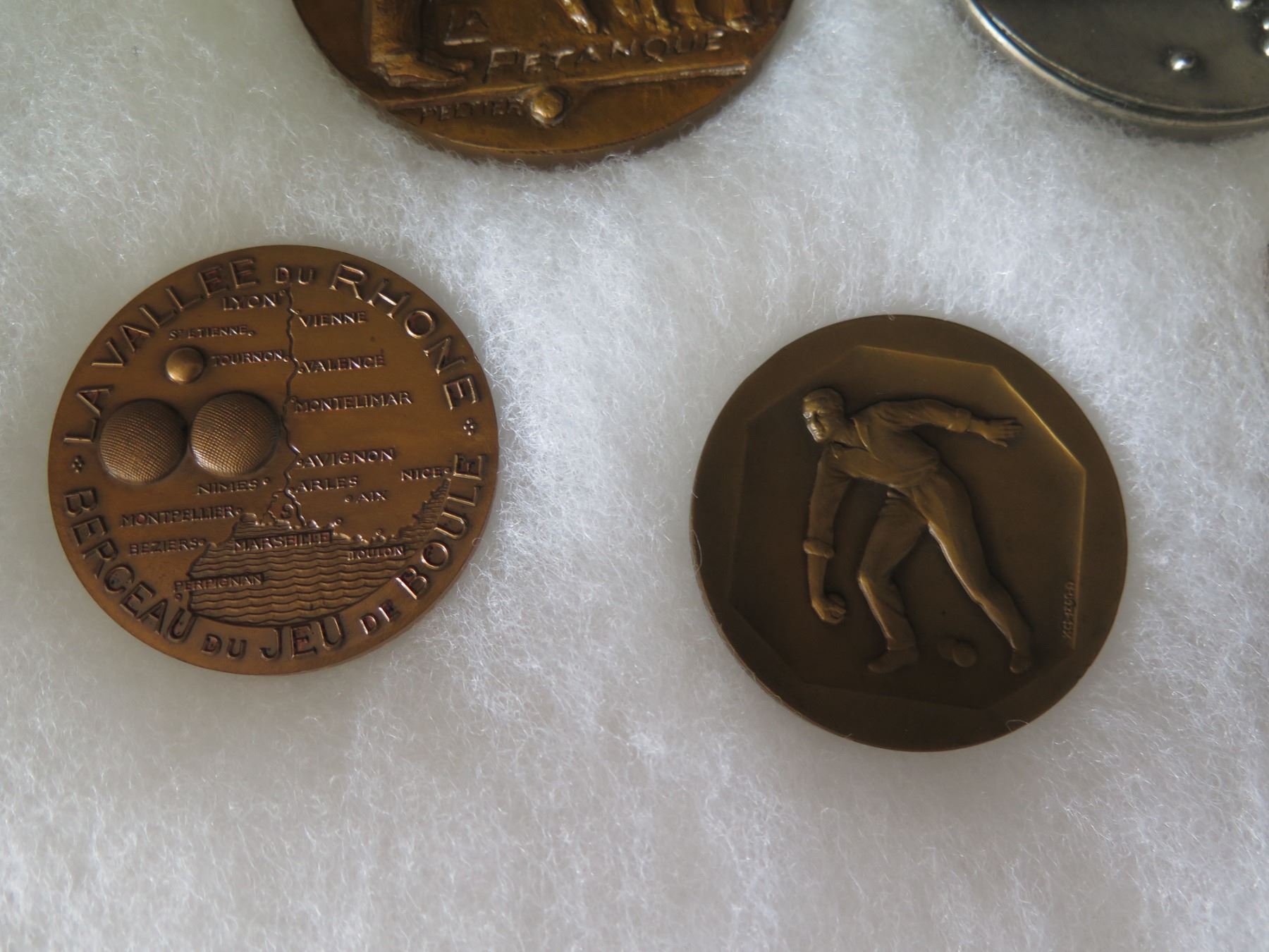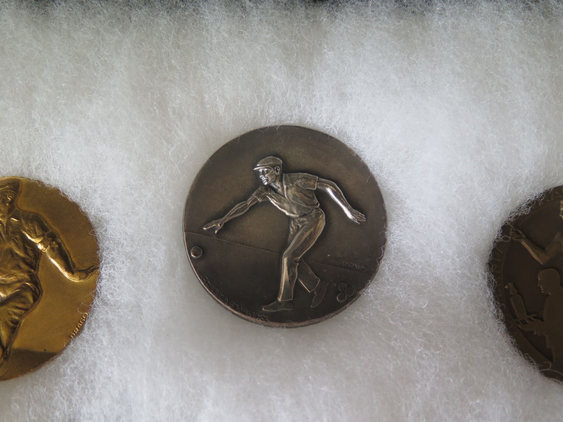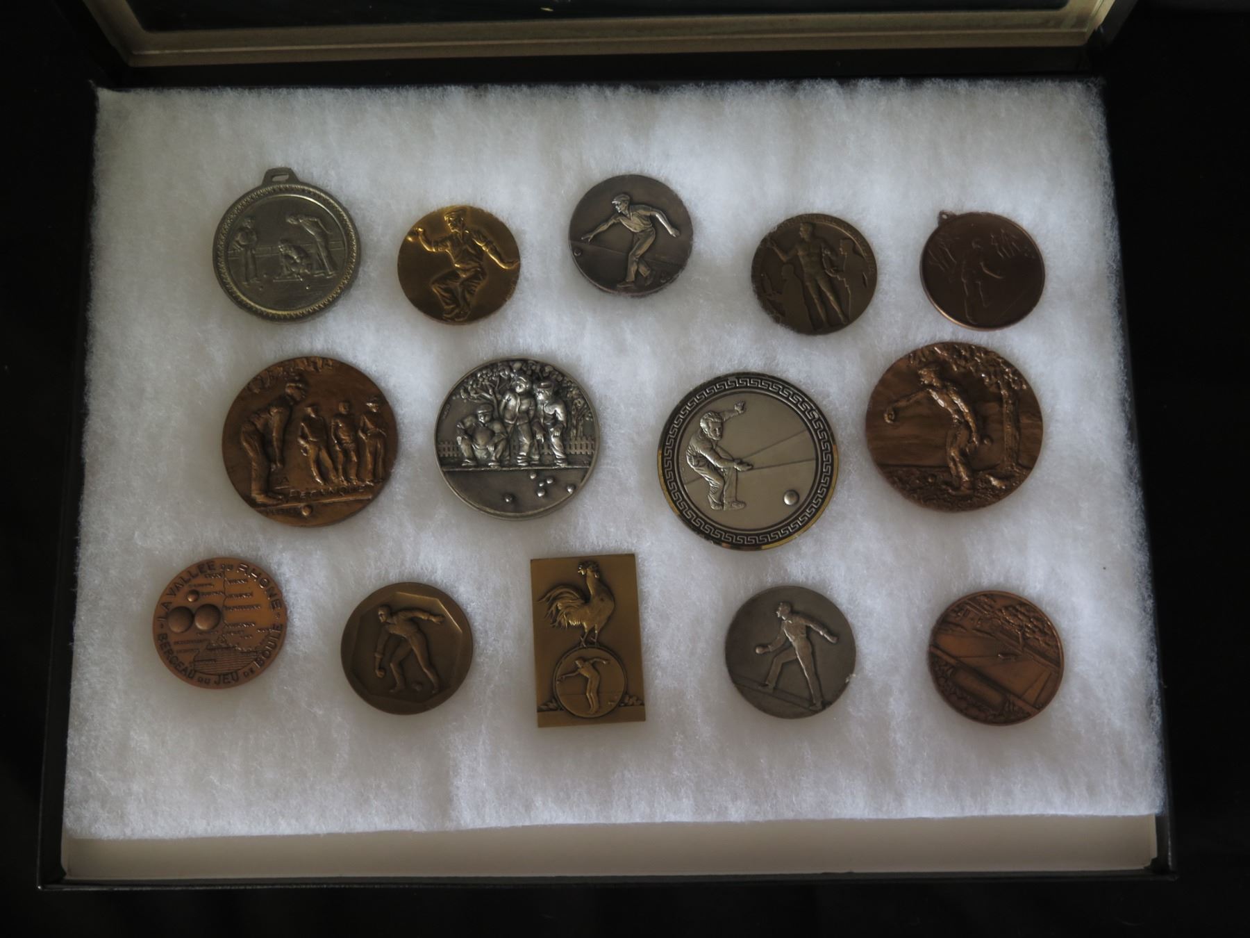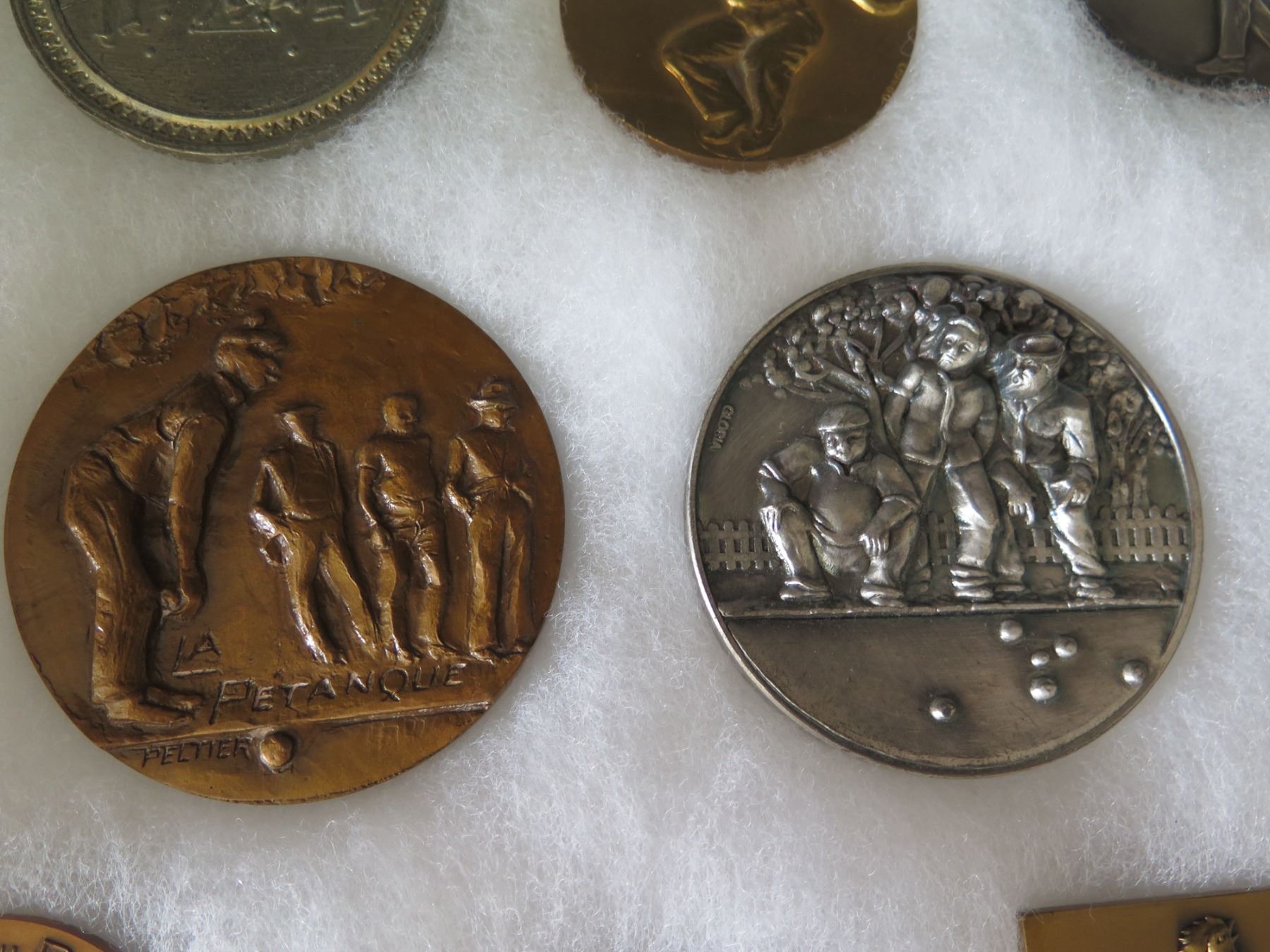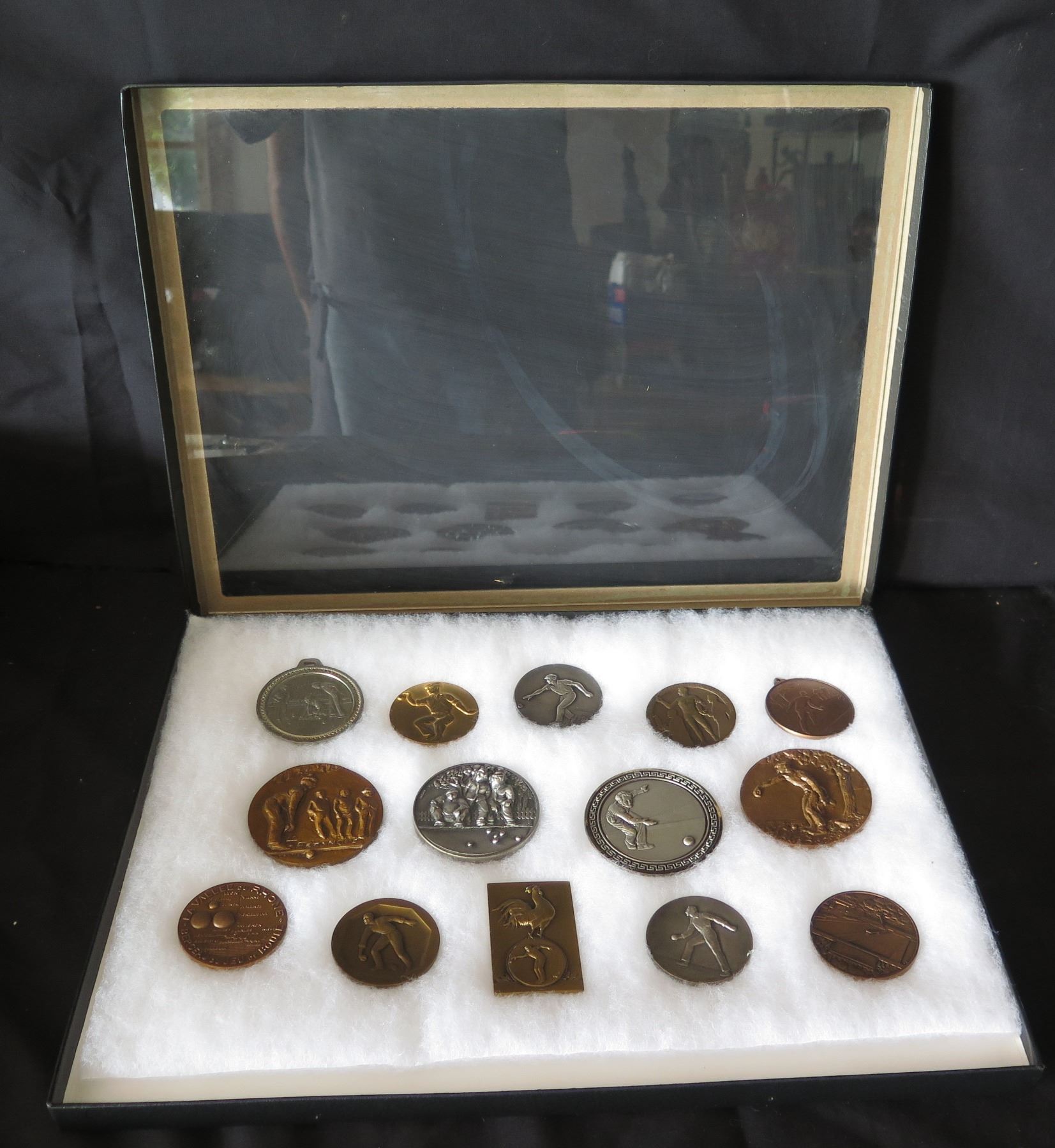 Multiple Medals & Coins: Athletes, La Vallee du Rhone, Prix Cinzano, etc in Display Case 16"L