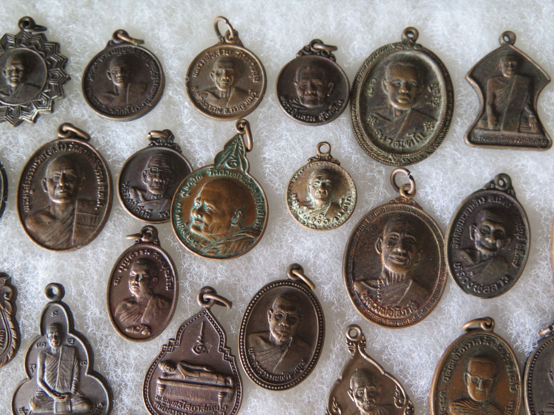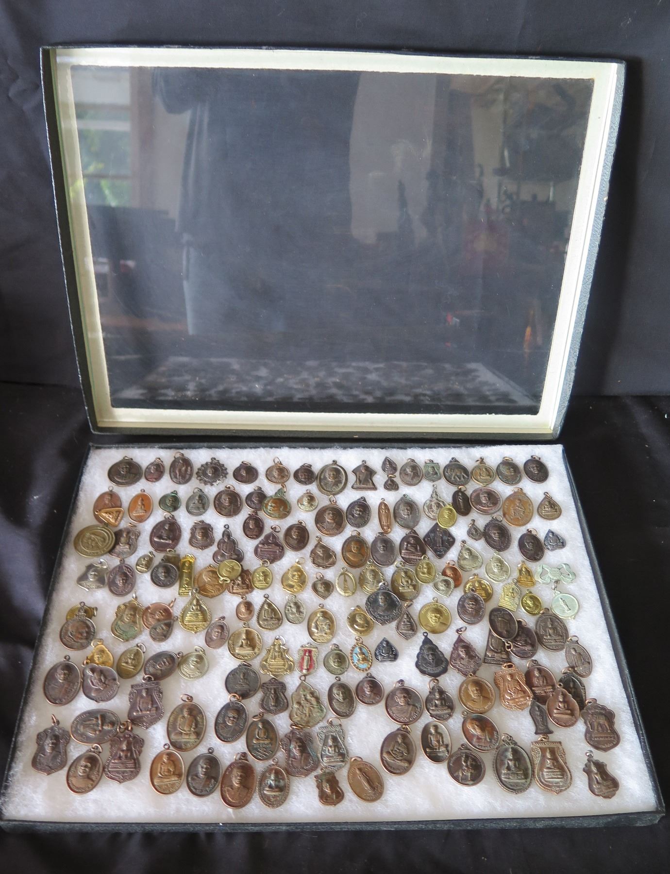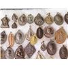 Multiple Medals & Pendants: Buddha, Elephants, Temples & Asian Theme, etc in Display Case 16"L
