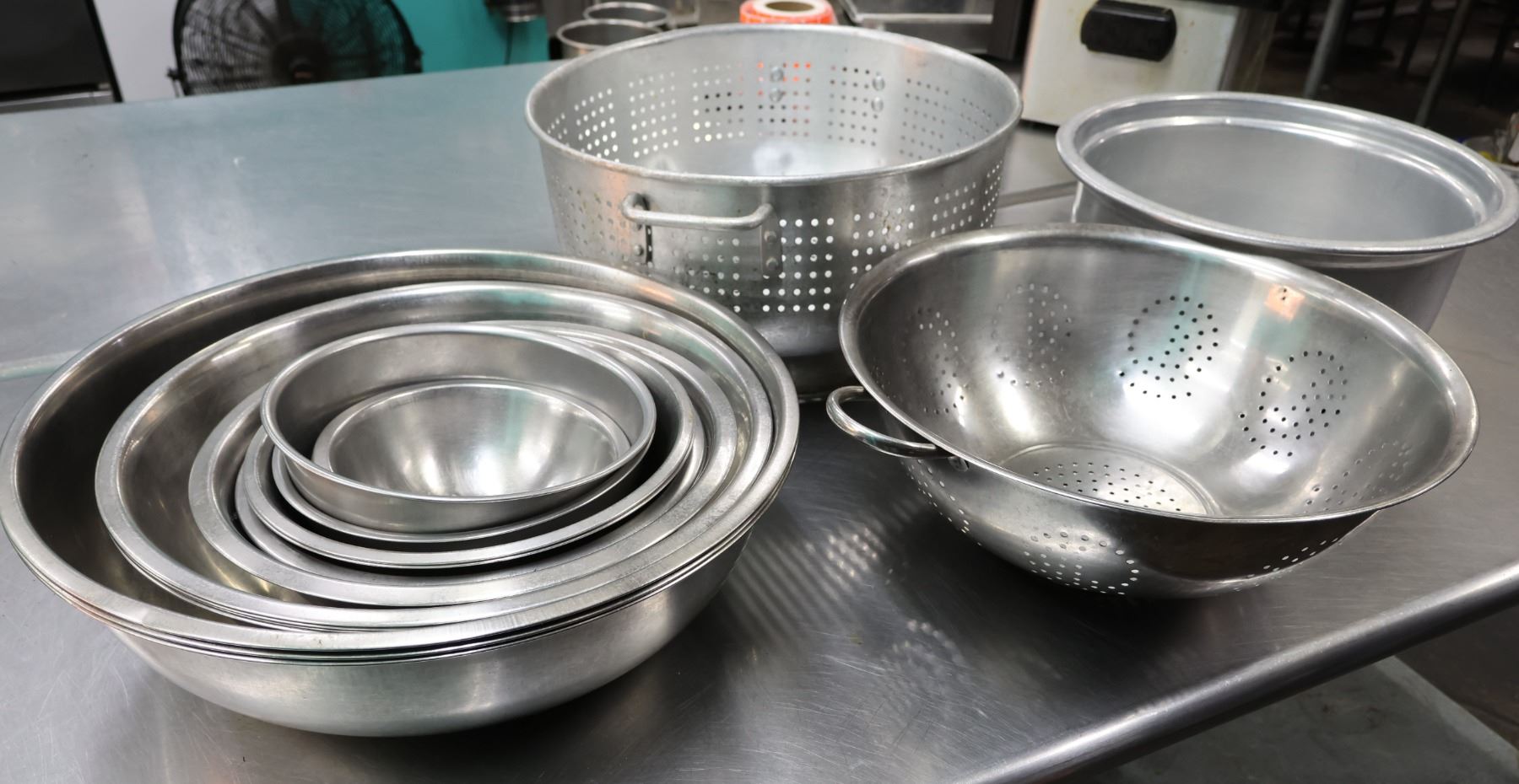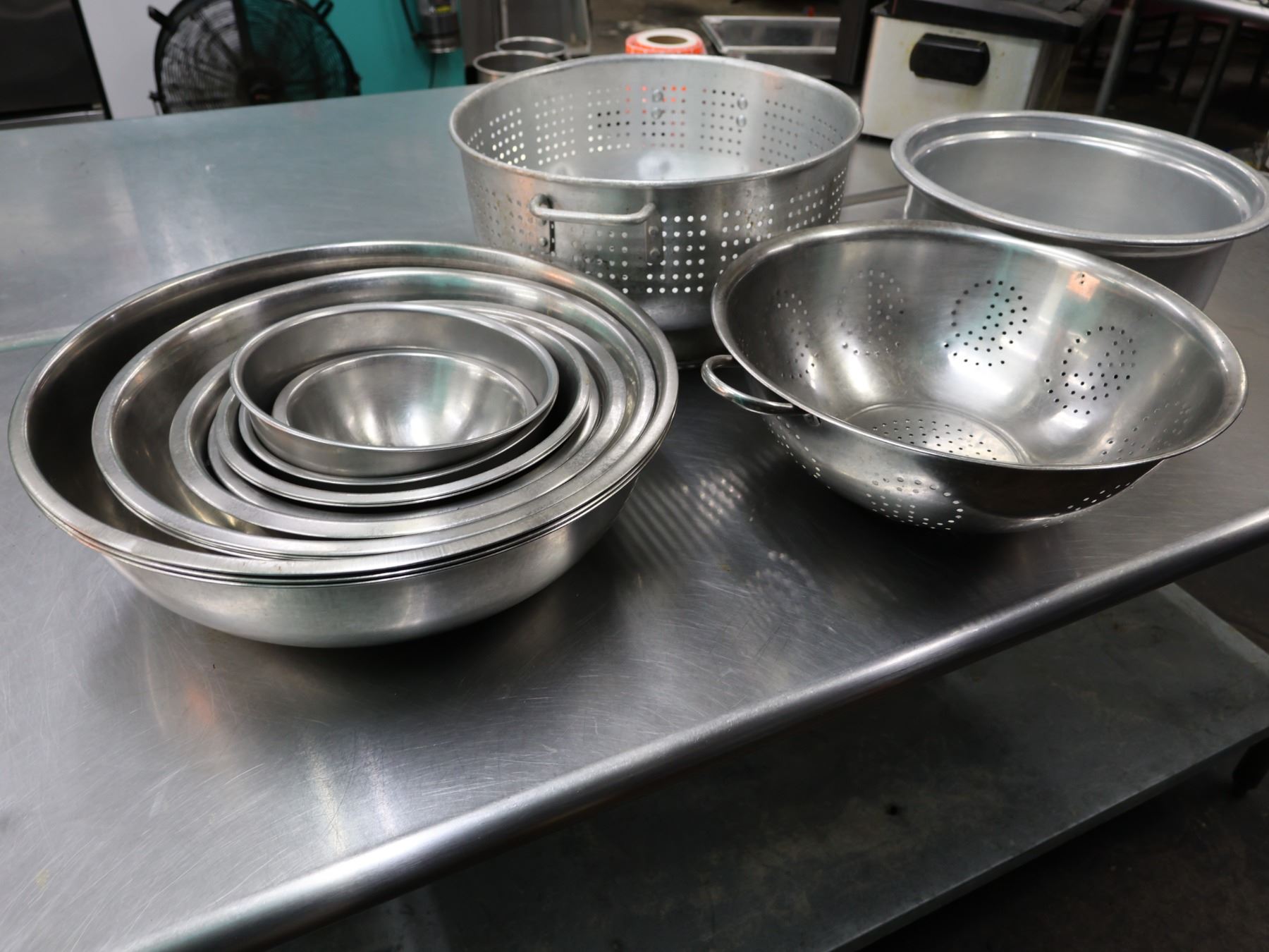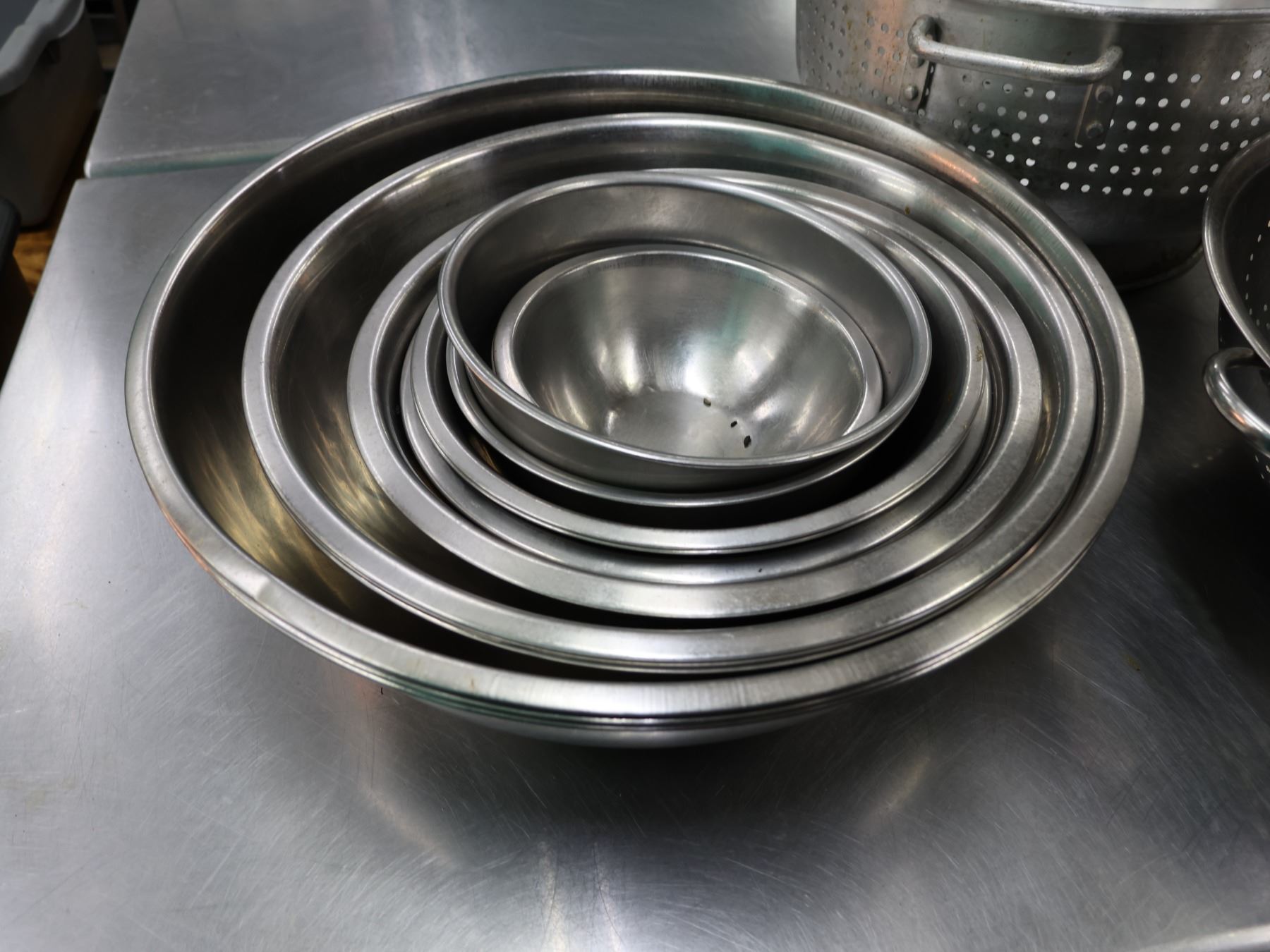 Multiple Metal Mixing Bowls & Strainers, Misc Sizes.
