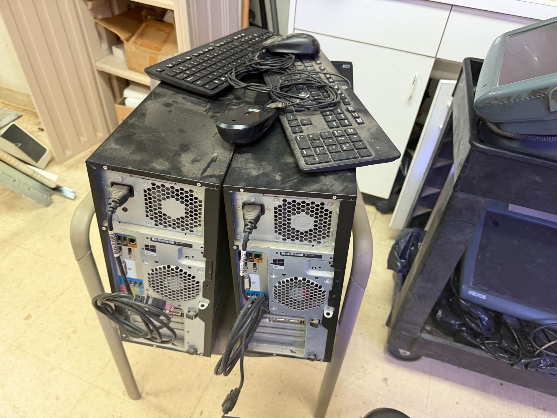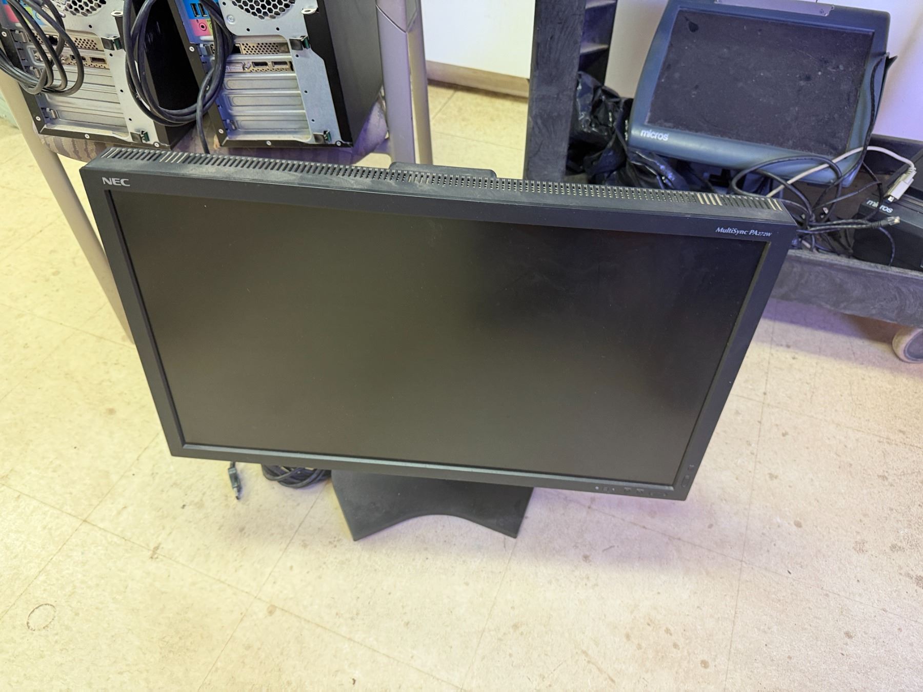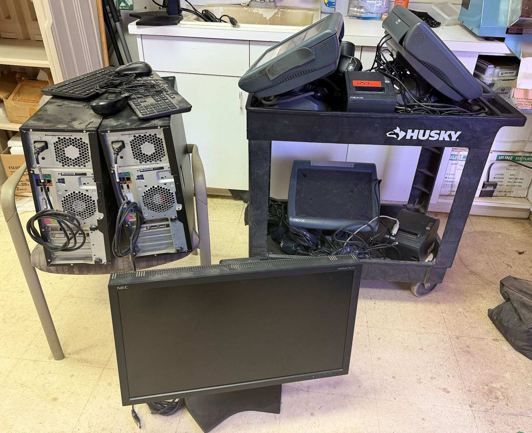 Multiple Micros POS System Parts, 2 Tower Computers, NEC MultiSync Monitor, etc (cart not included). Untested - As Is.