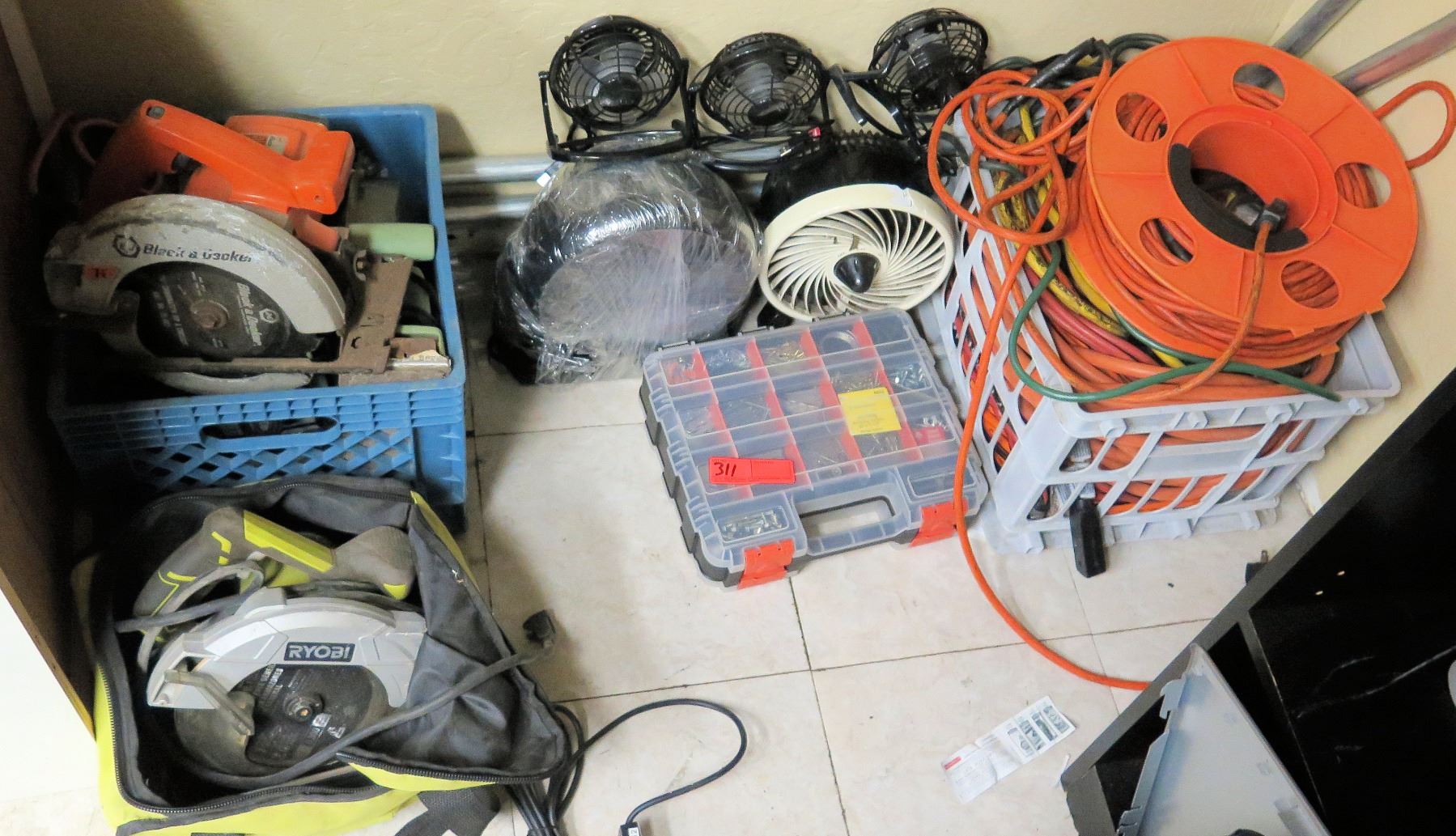 Multiple Misc Tools, Fans, Cords, etc