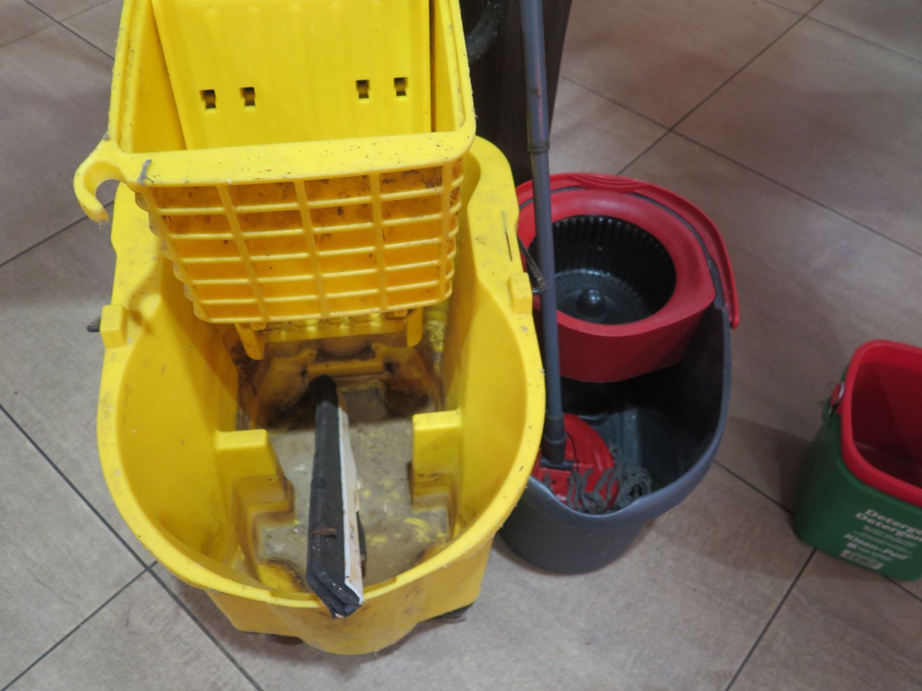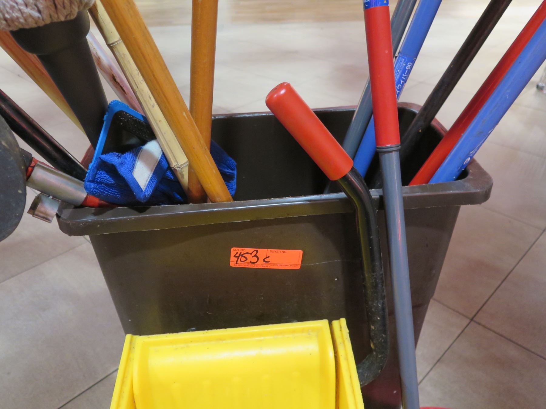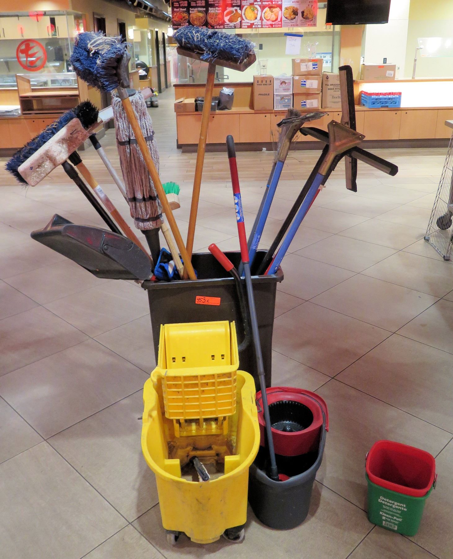 Multiple Mops, Brooms, Squeegees, etc in Plastic Waste Receptacles & Mop Bucket