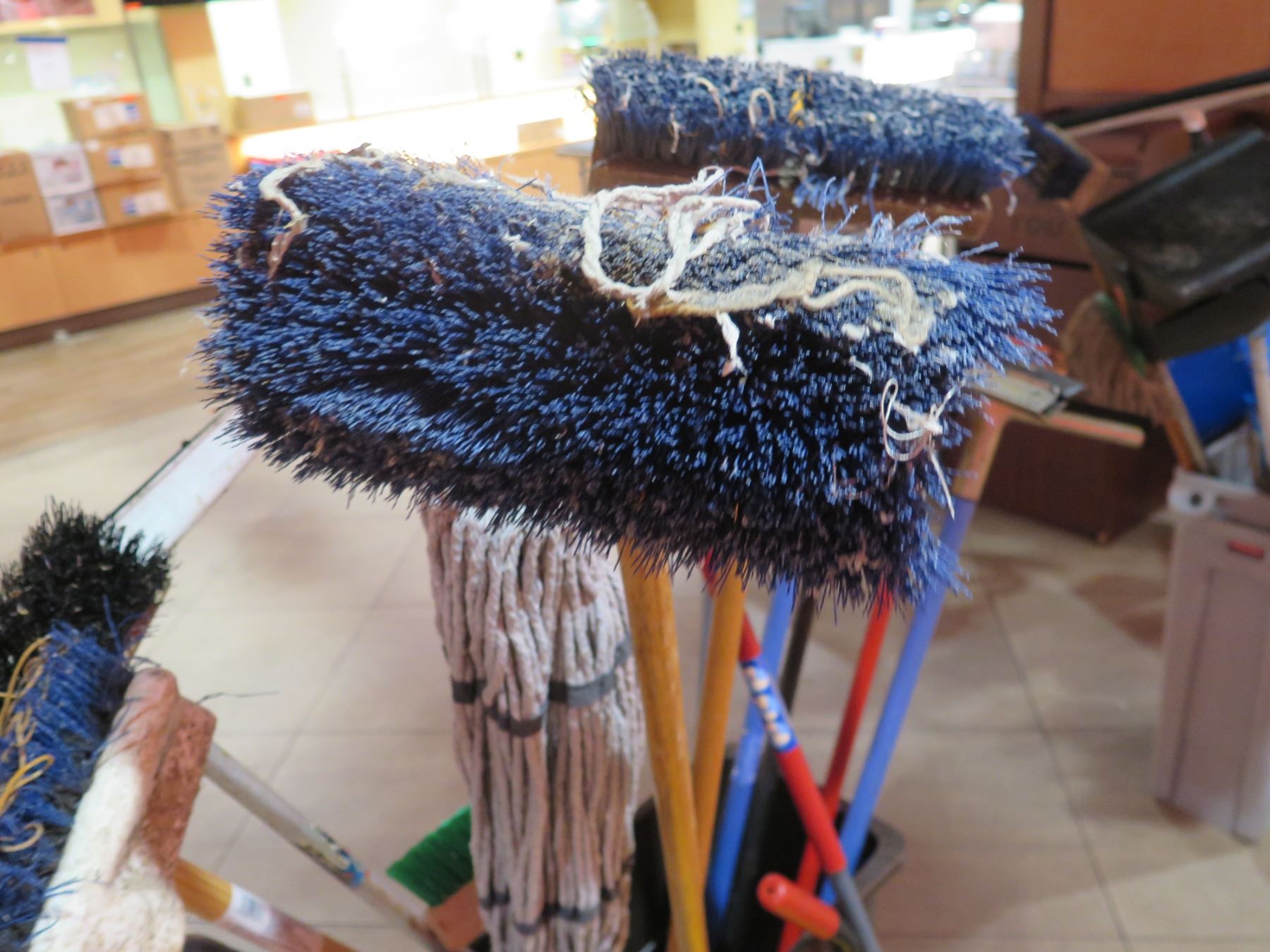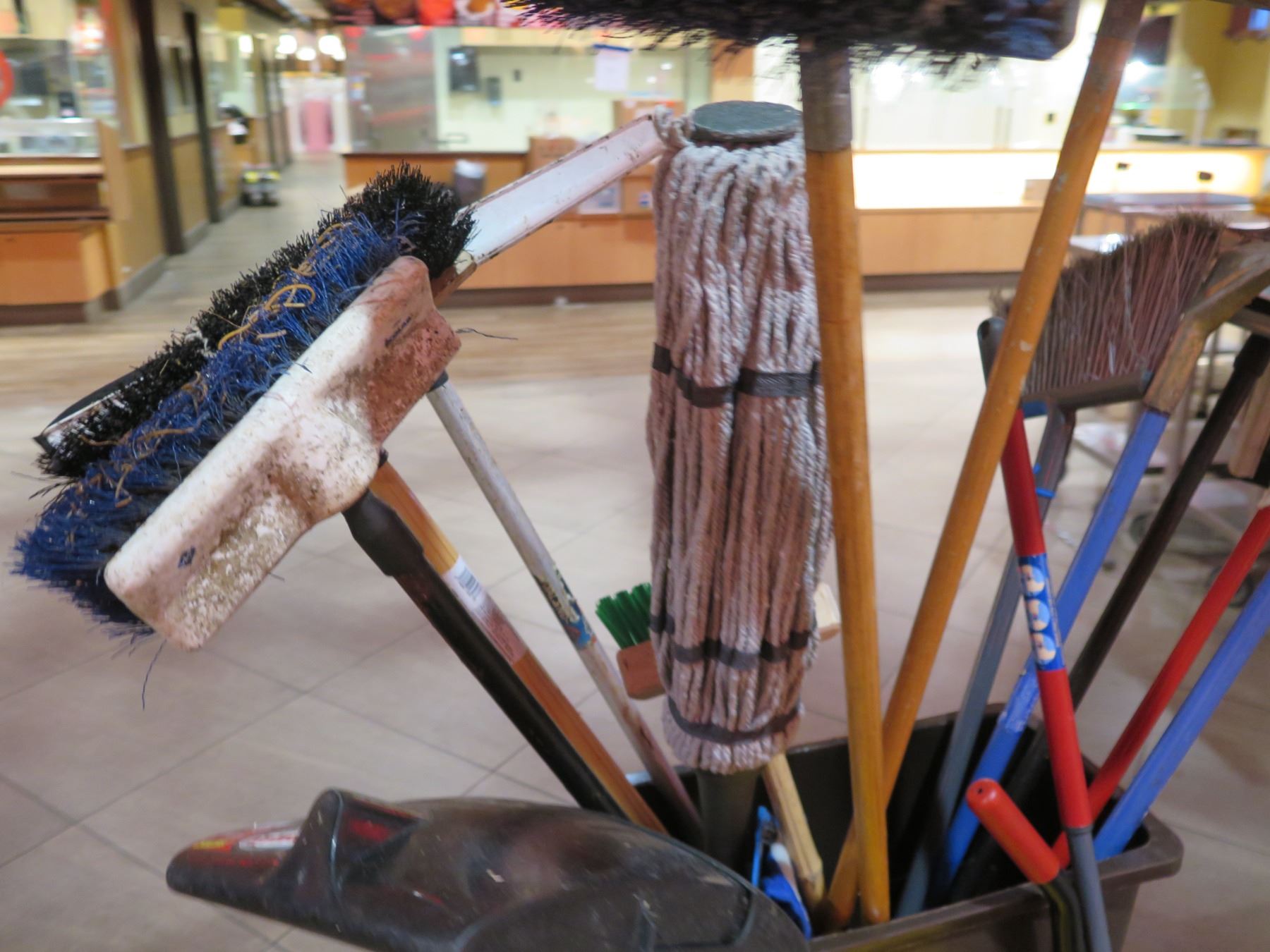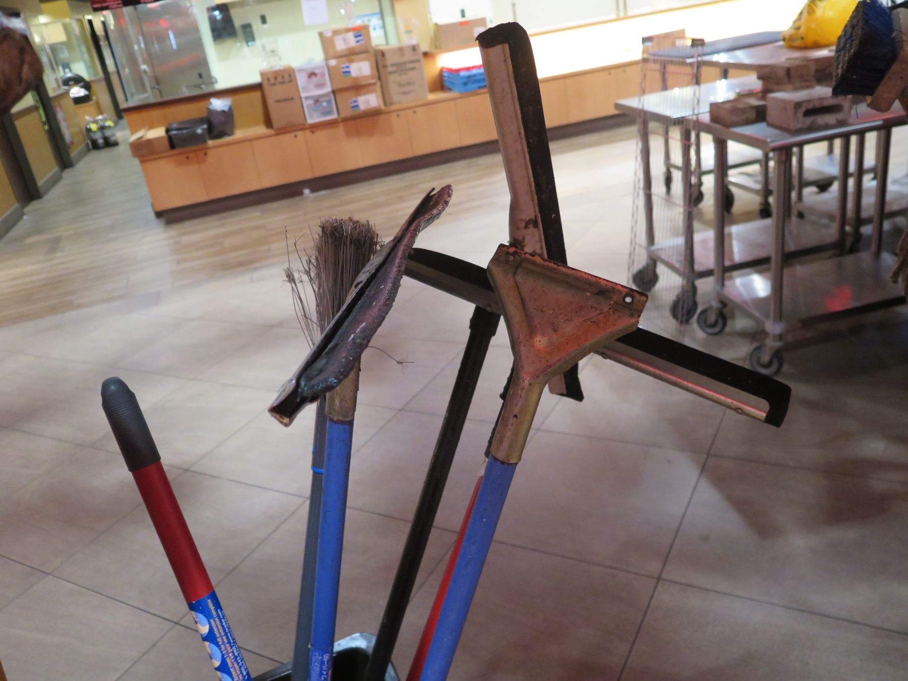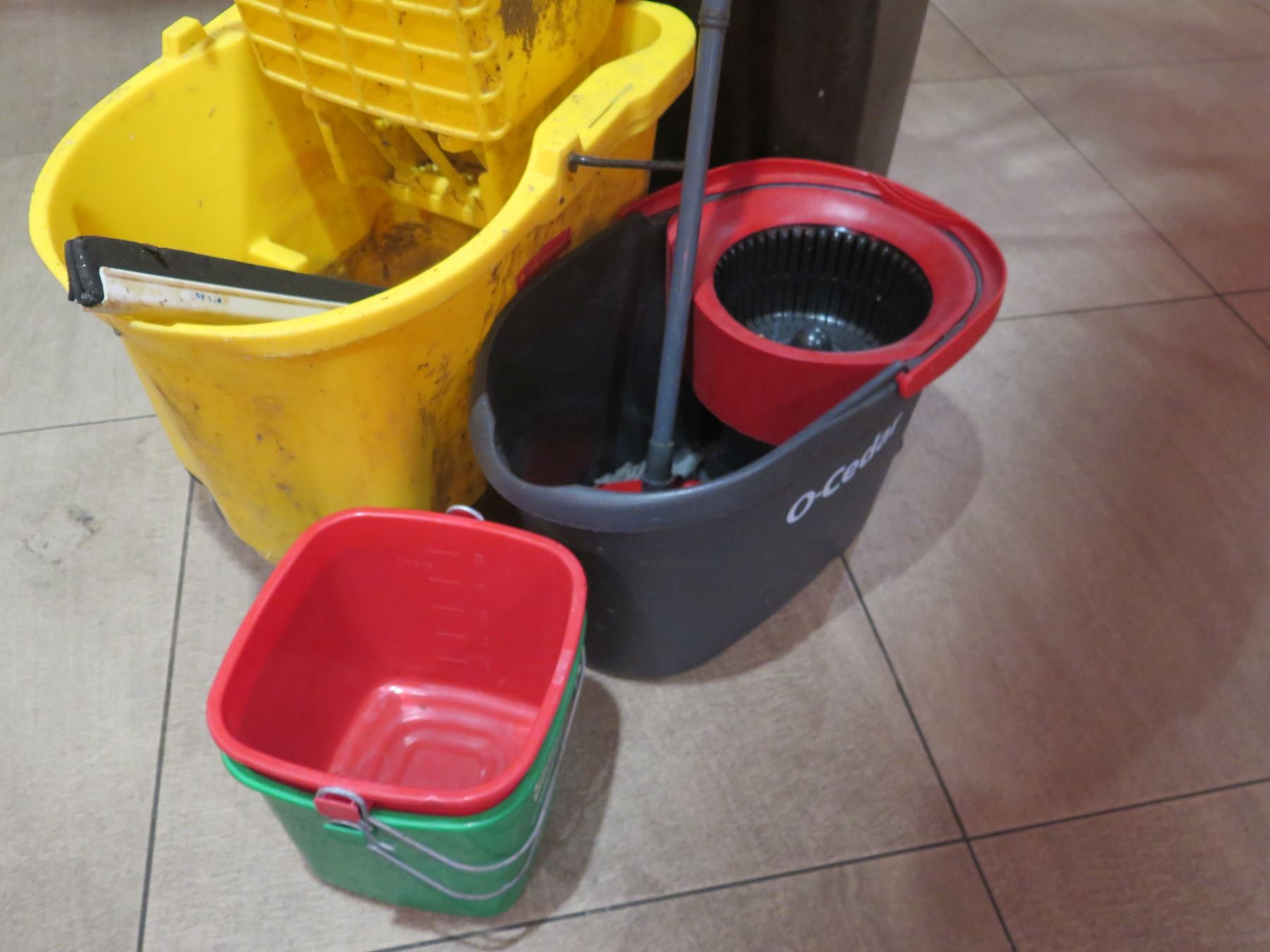 Multiple Mops, Brooms, Squeegees, etc in Plastic Waste Receptacles & Mop Bucket