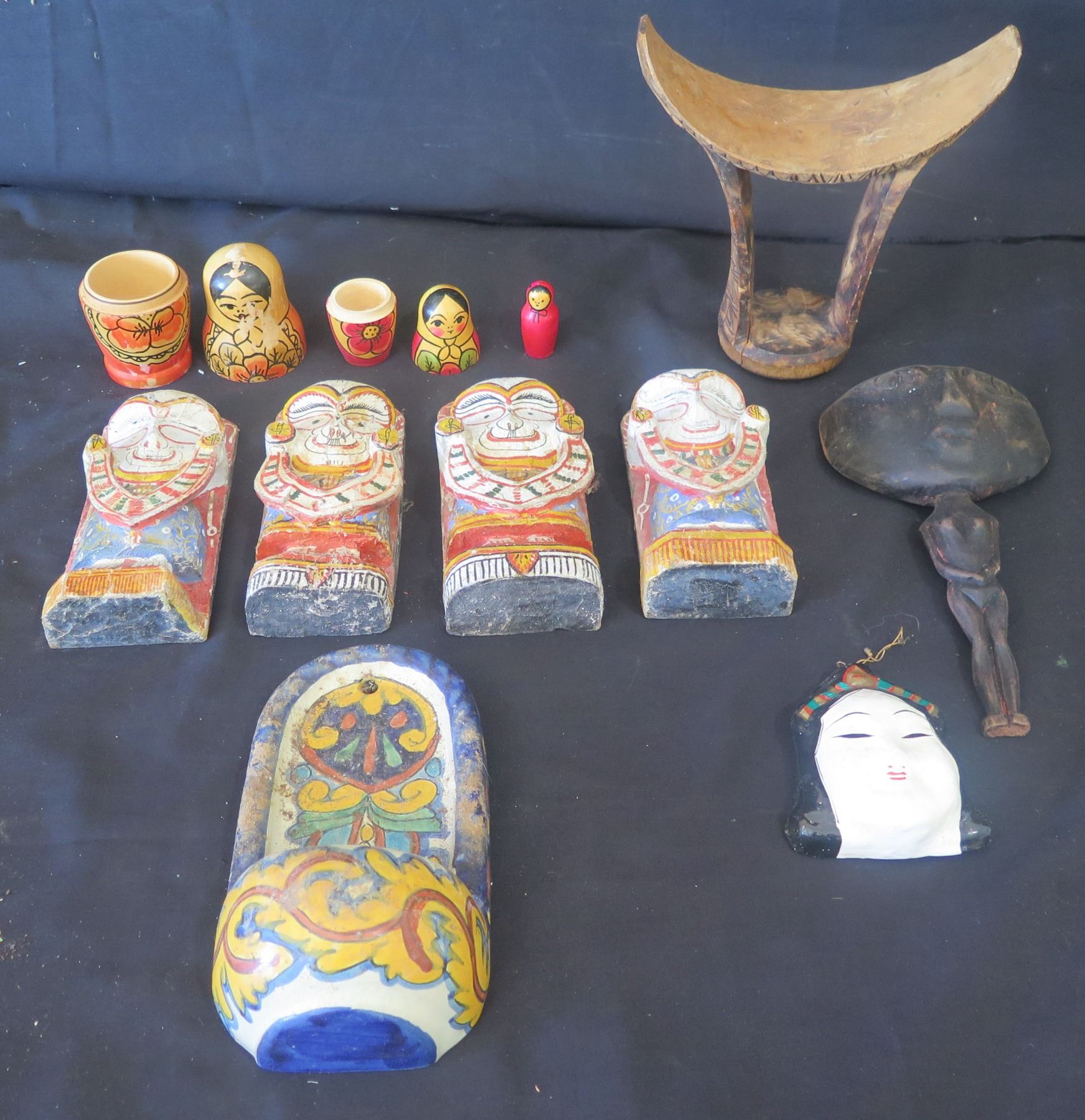Multiple Nesting Dolls, Curved Stand, Tikis, Wooden Statue, etc