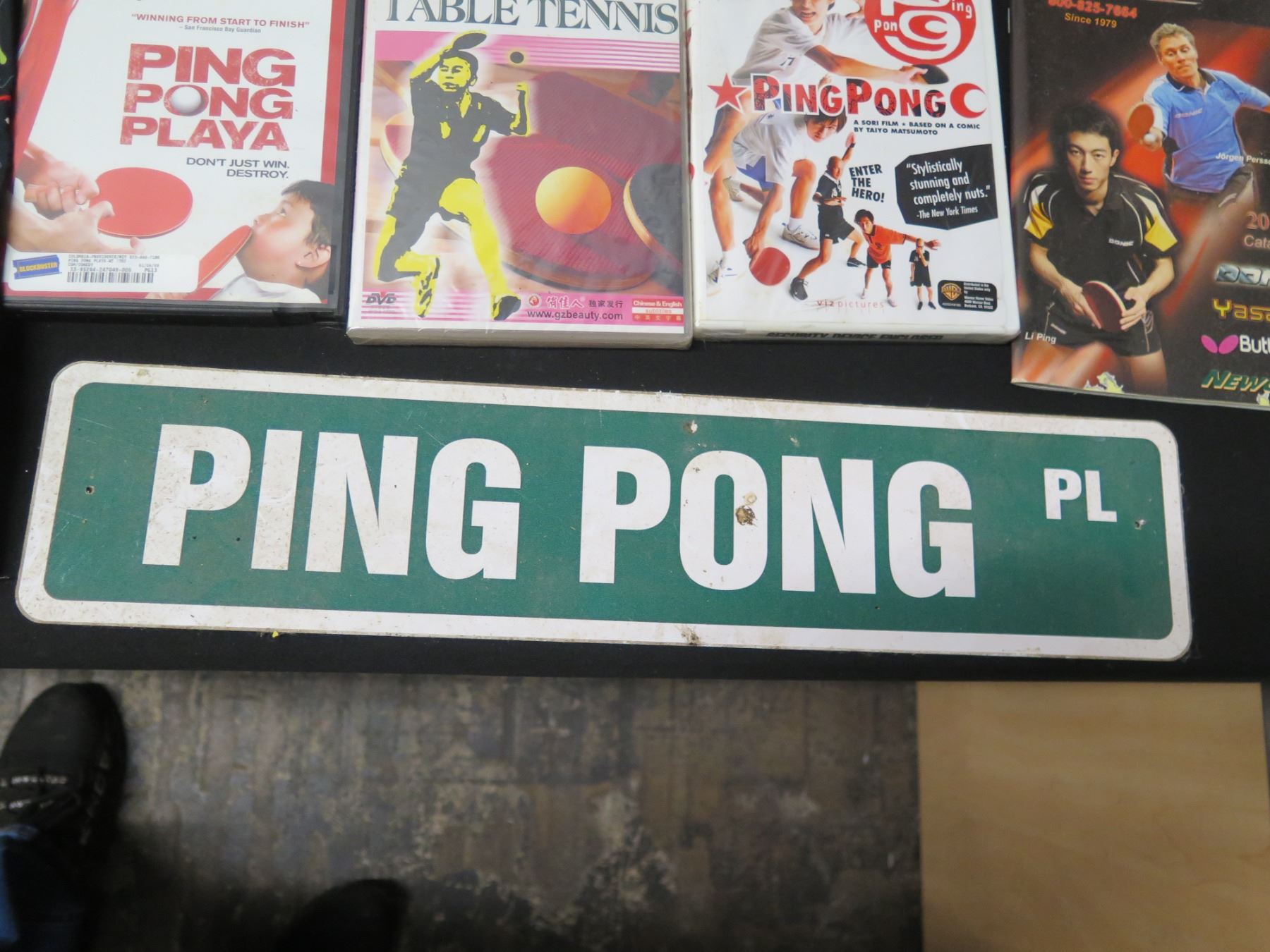 Multiple Ping Pong Accessories: Balls in Dispenser, Paddles, Street Sign, DVD's, etc