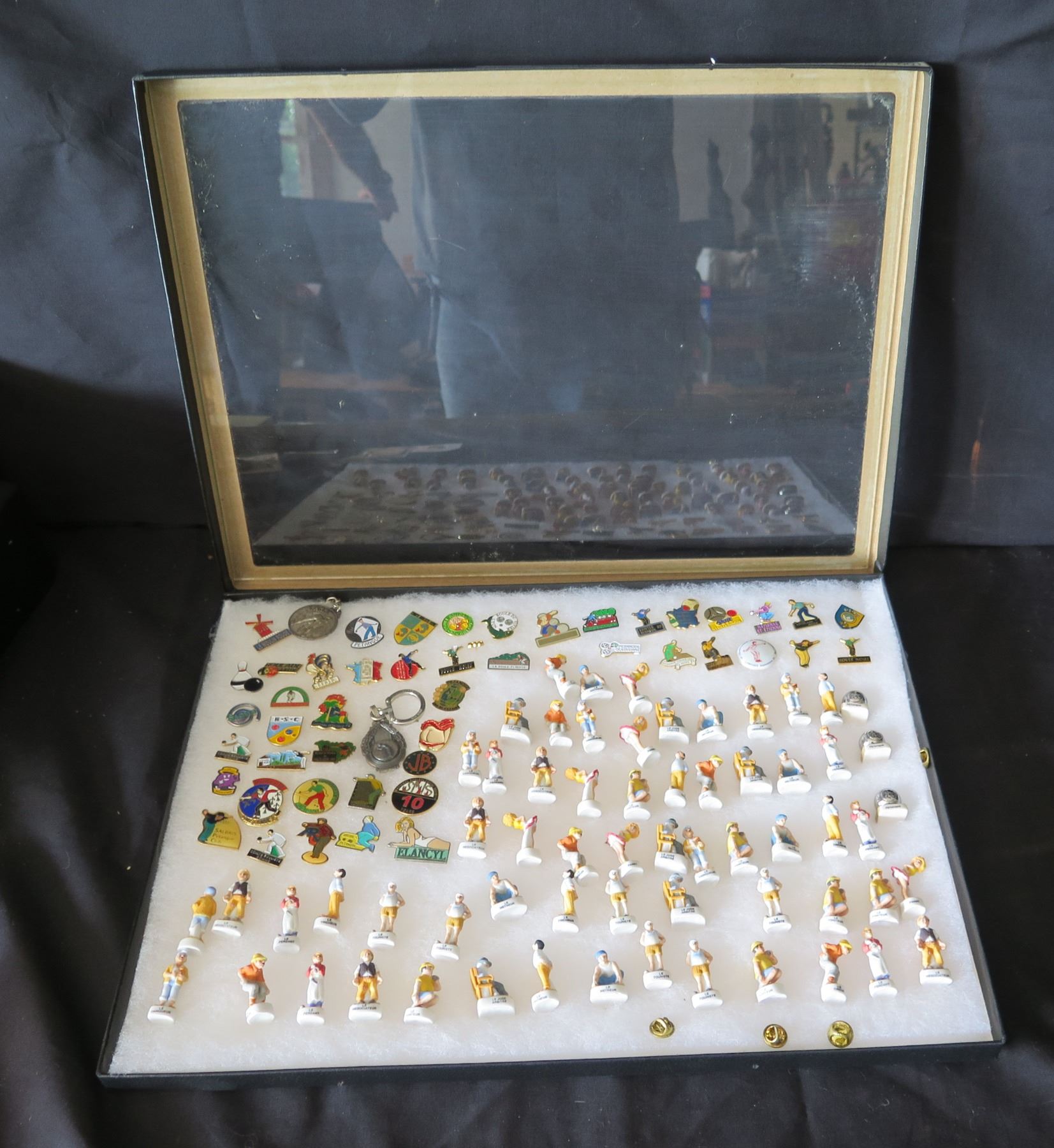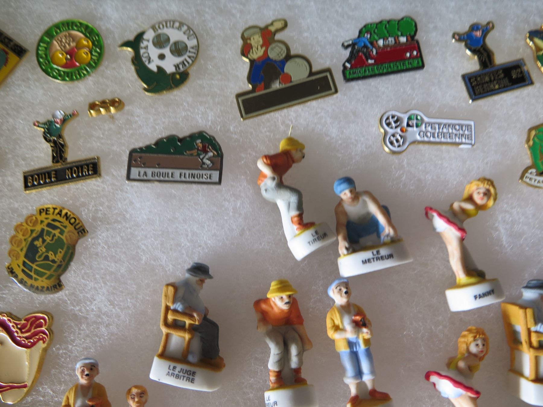 Multiple Pins & Keychains: Petanque, Le Moulin Rouge, etc & French Figurines in Display Case 16"L