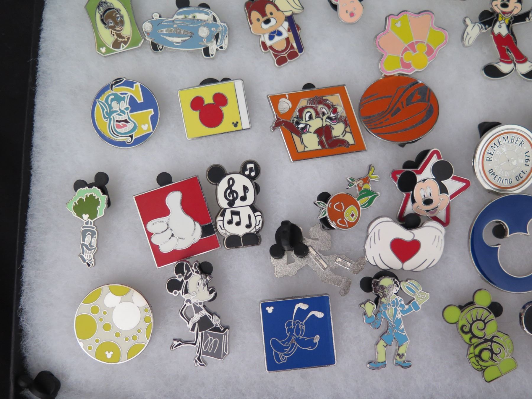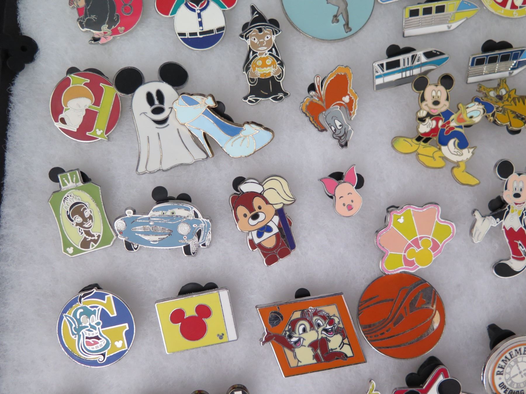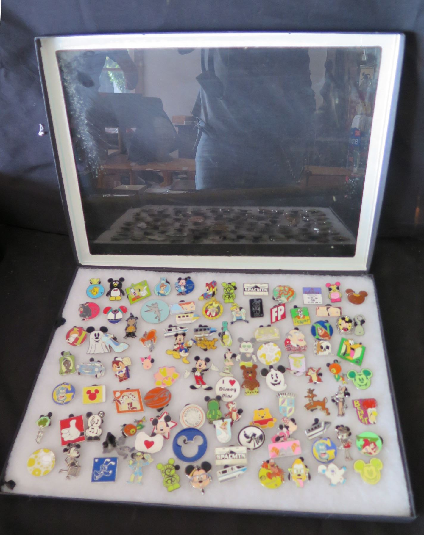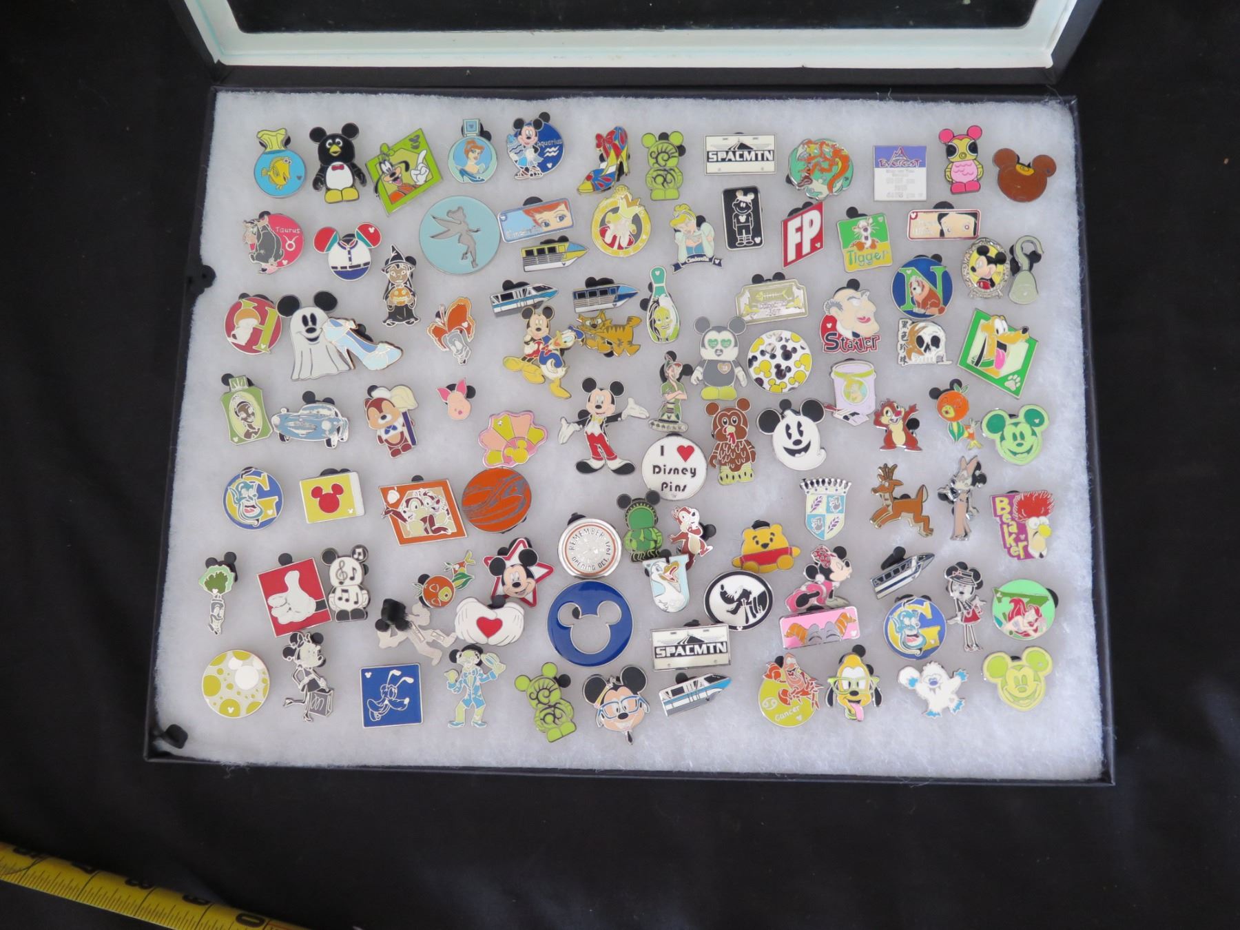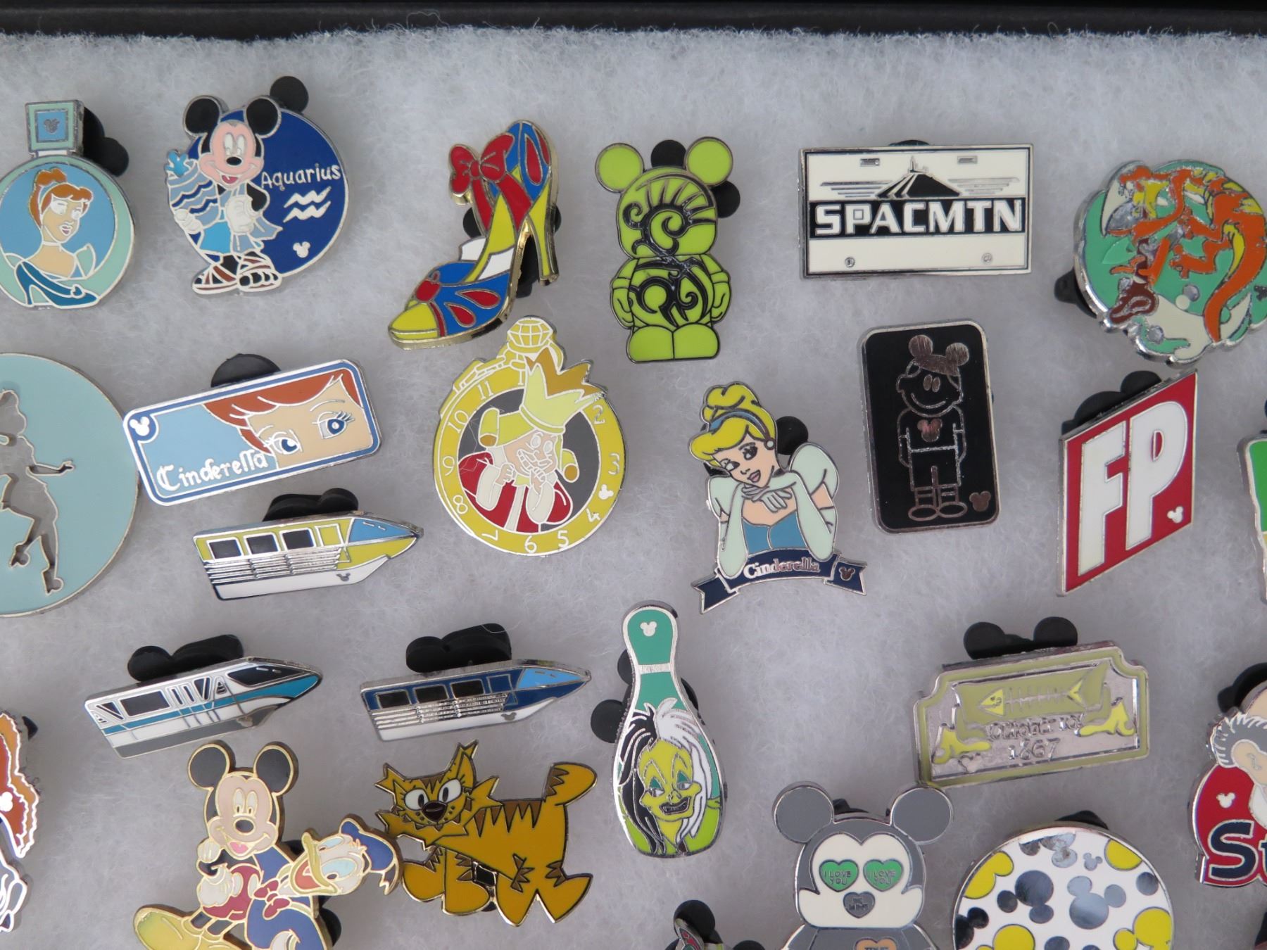 Multiple Pins & Medals: Cartoon Characters, Animals, Disney Rides, etc in Display Case 16"L
