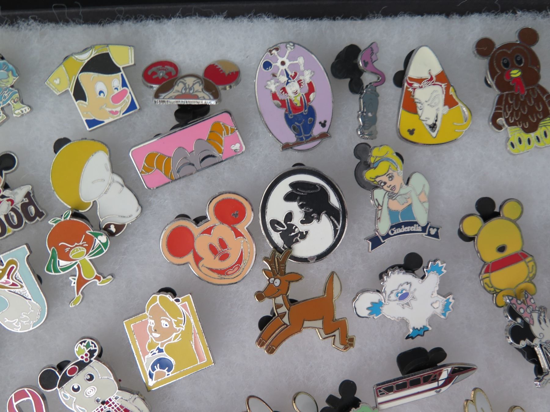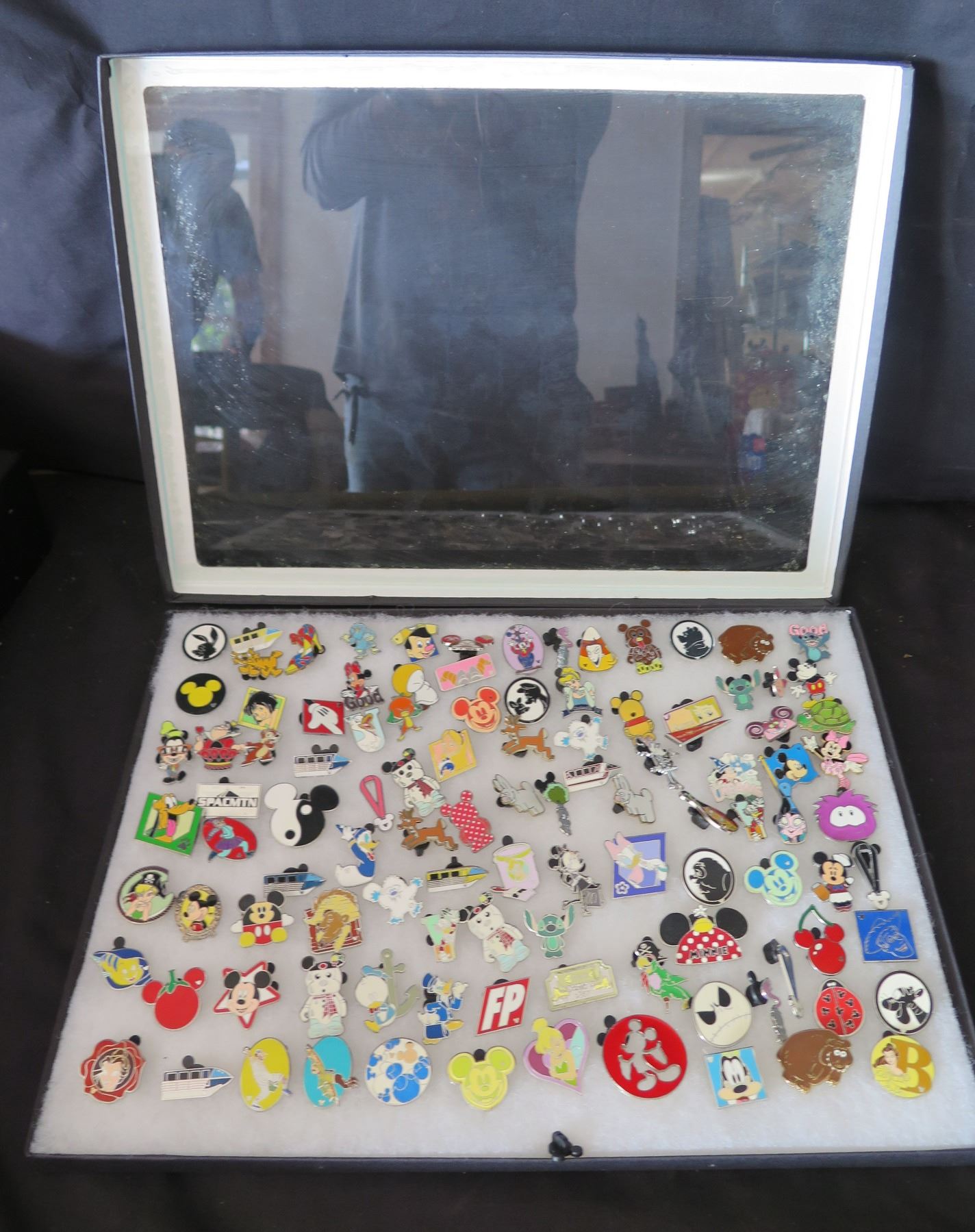 Multiple Pins & Medals: Cartoon Characters, Animals, Disney, etc in Display Case 16"L