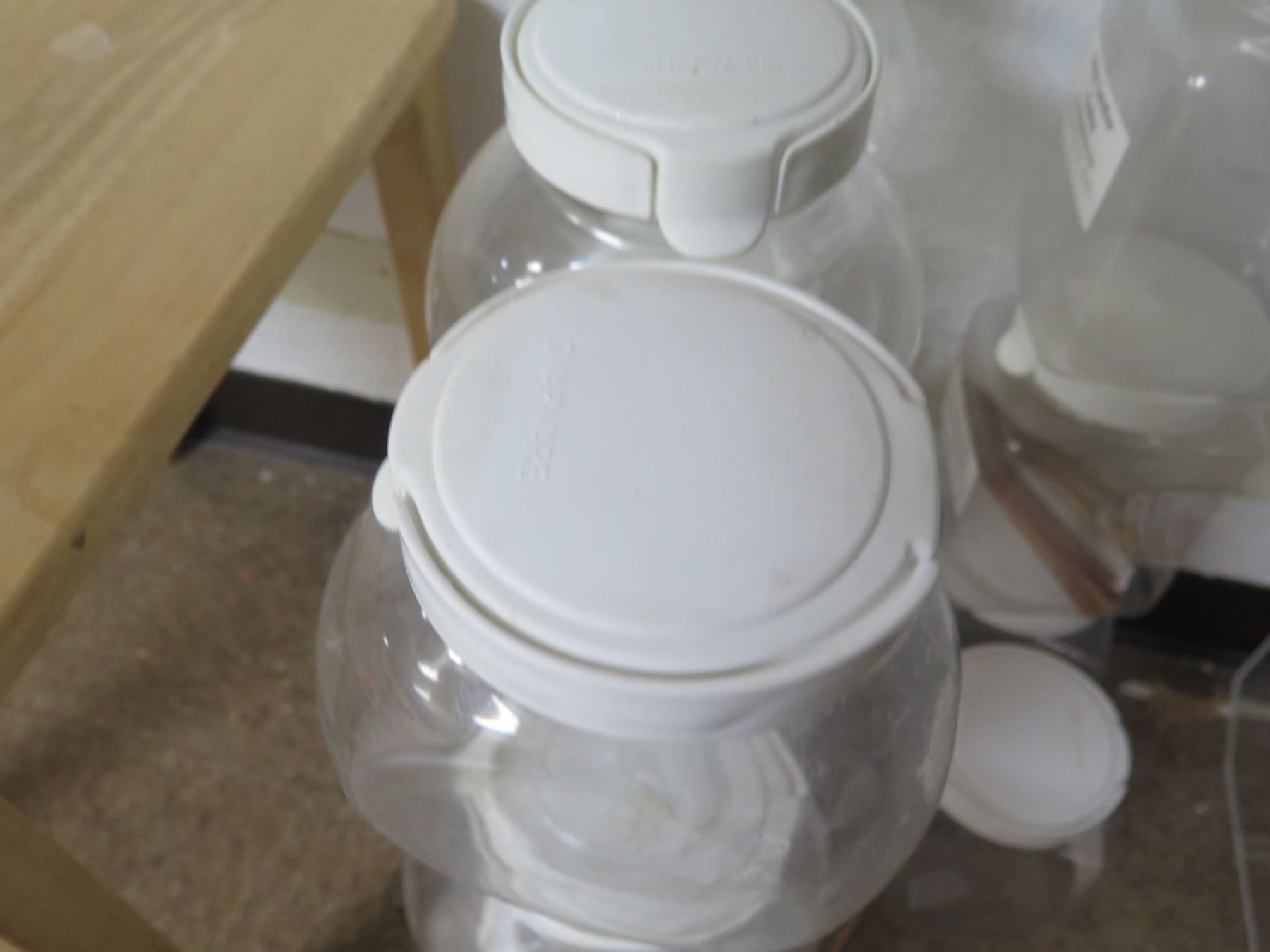 Multiple Plastic Bulk Candy Containers, Jars w/ Lids & Wood Side Table