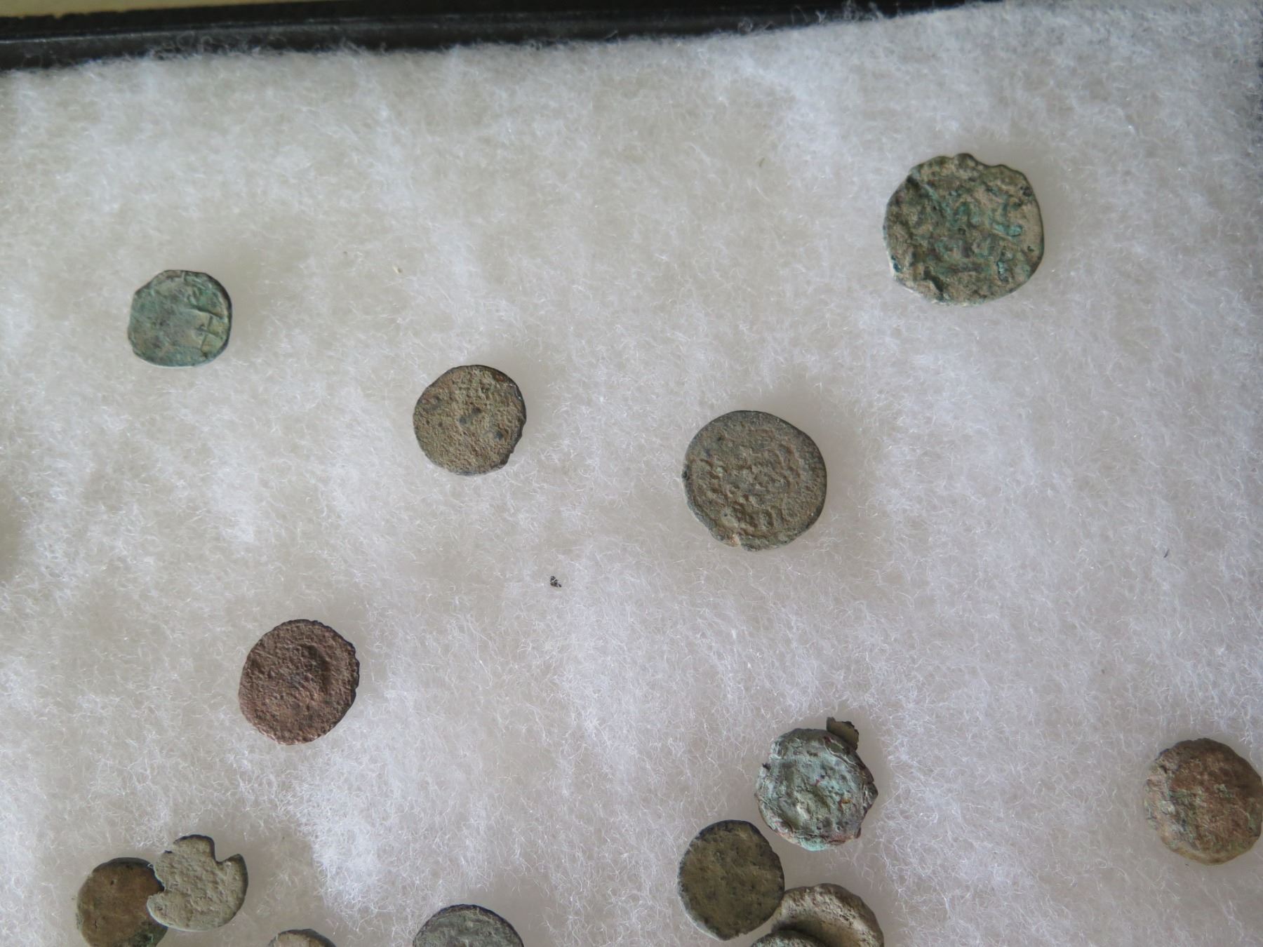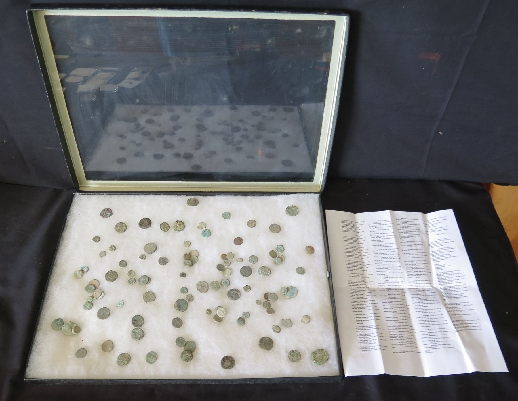 Multiple 'Raw' or 'Uncleaned' Ancient Bronze Coins w/ Instructions in Display Case 16"L