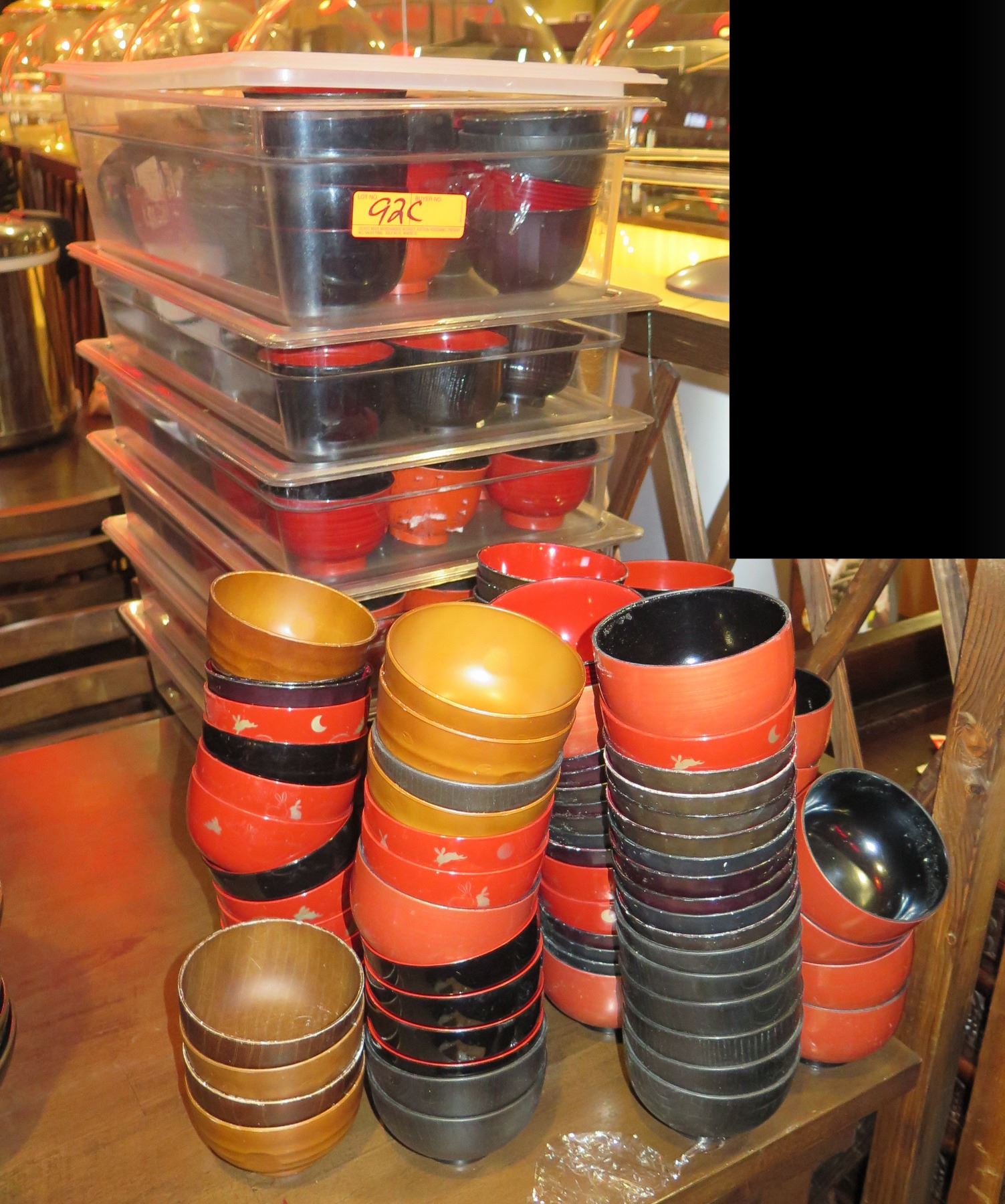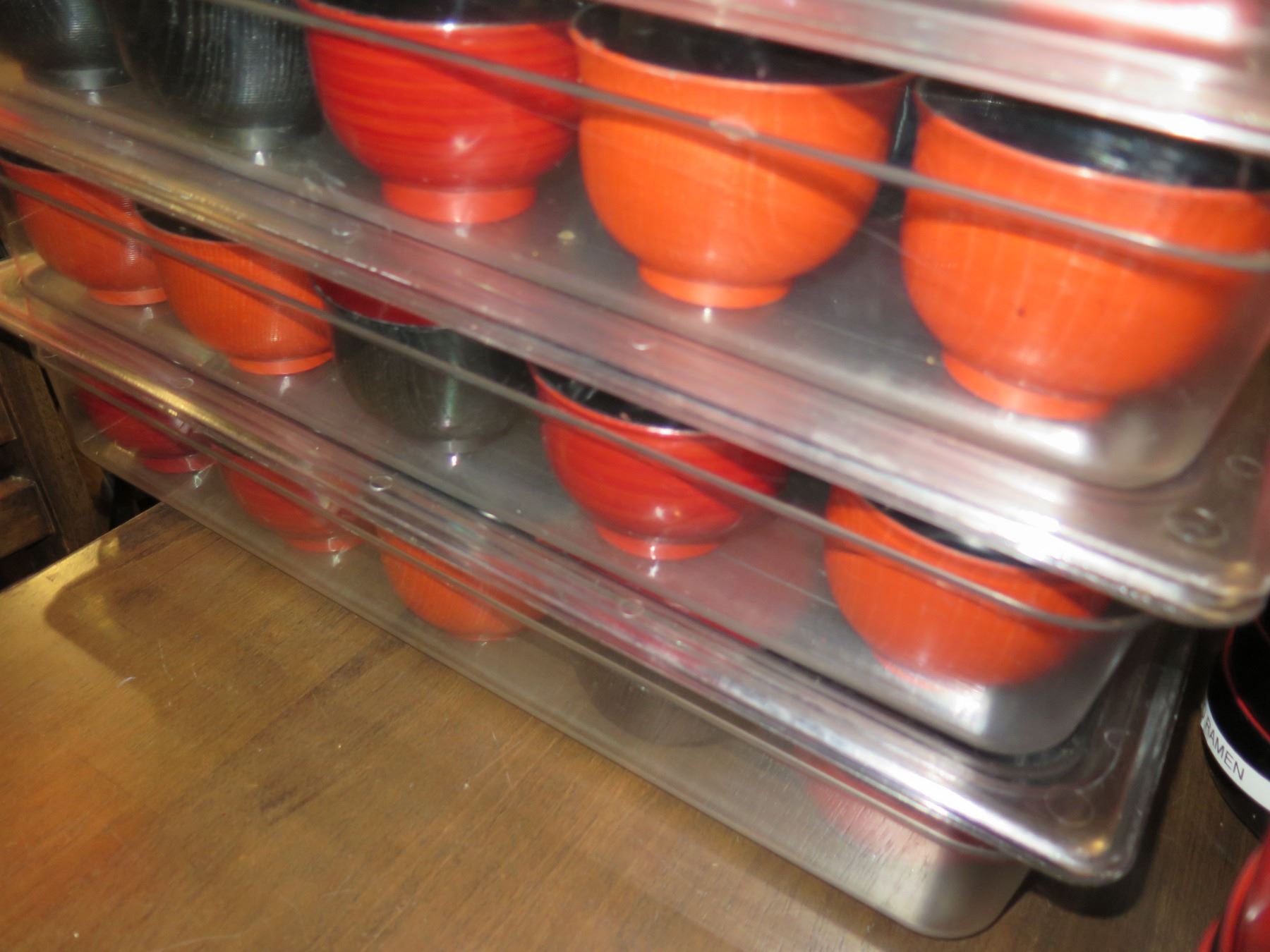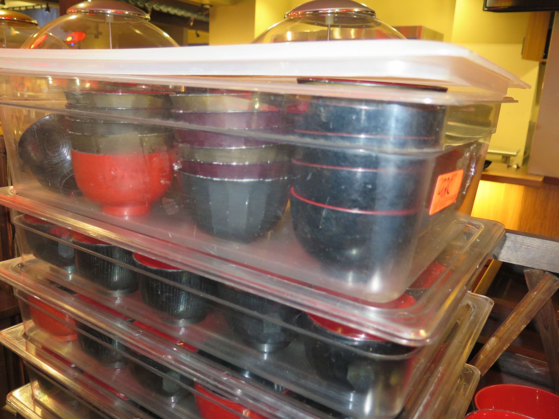 Multiple Red & Black Bowls w/ Some Storage Bins