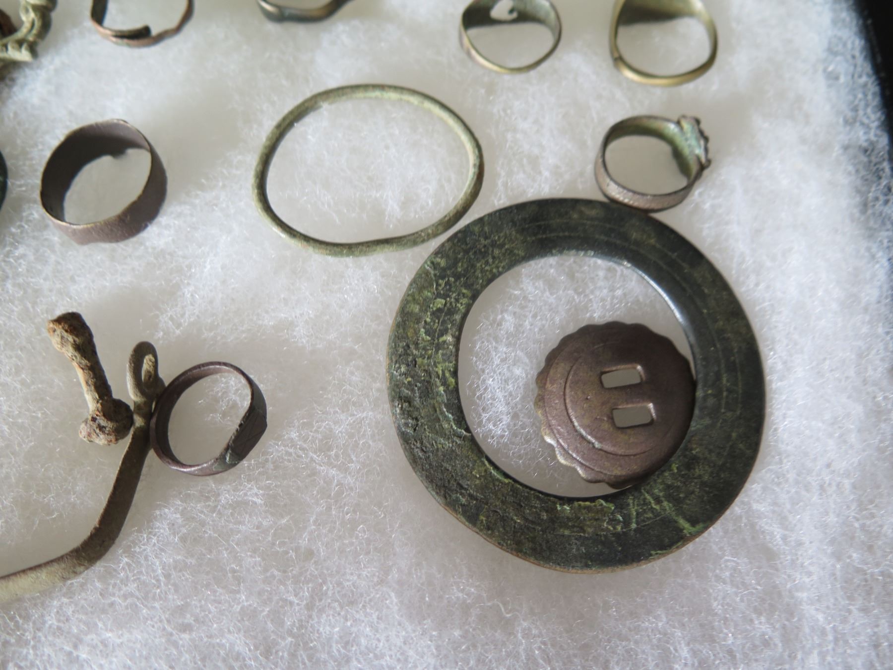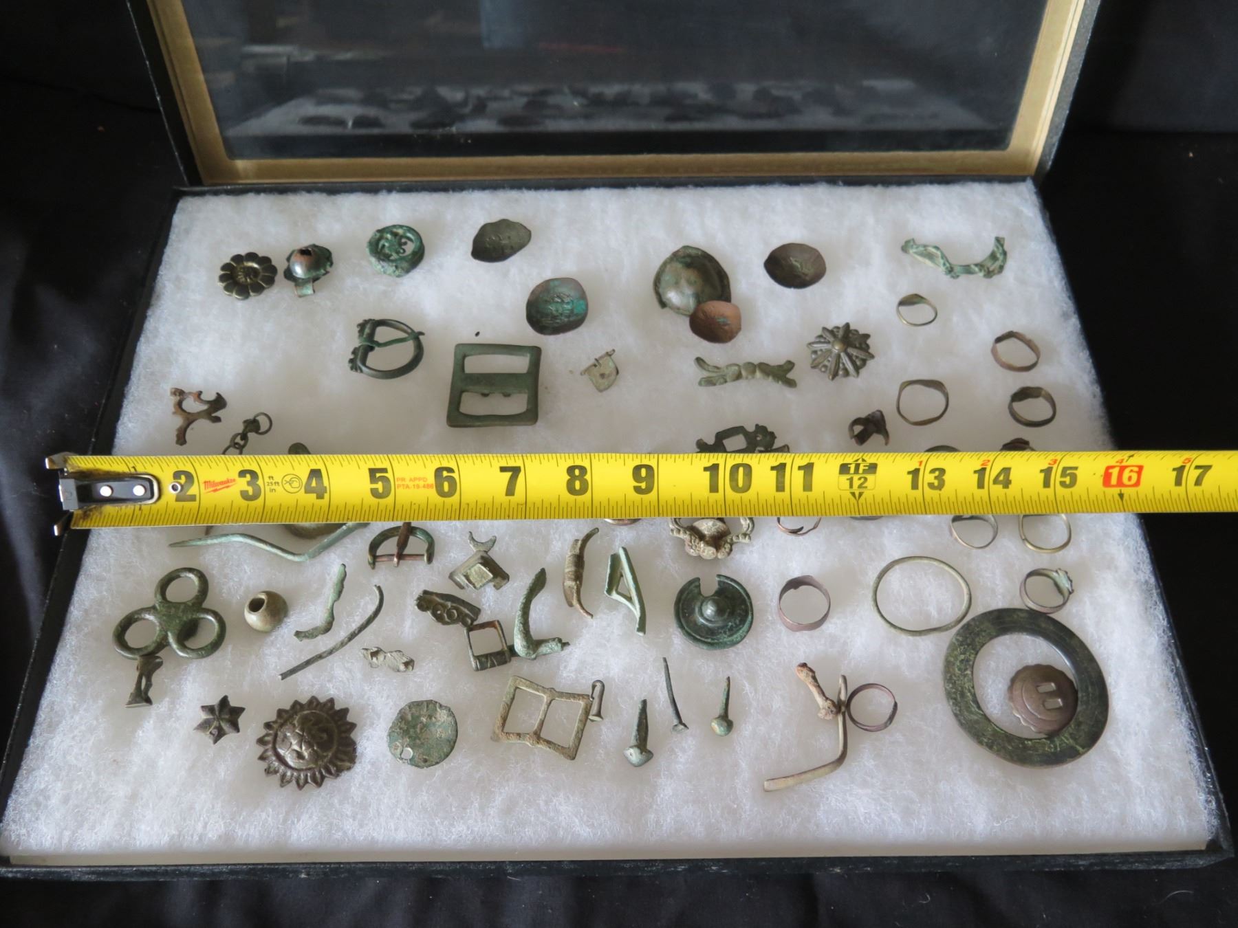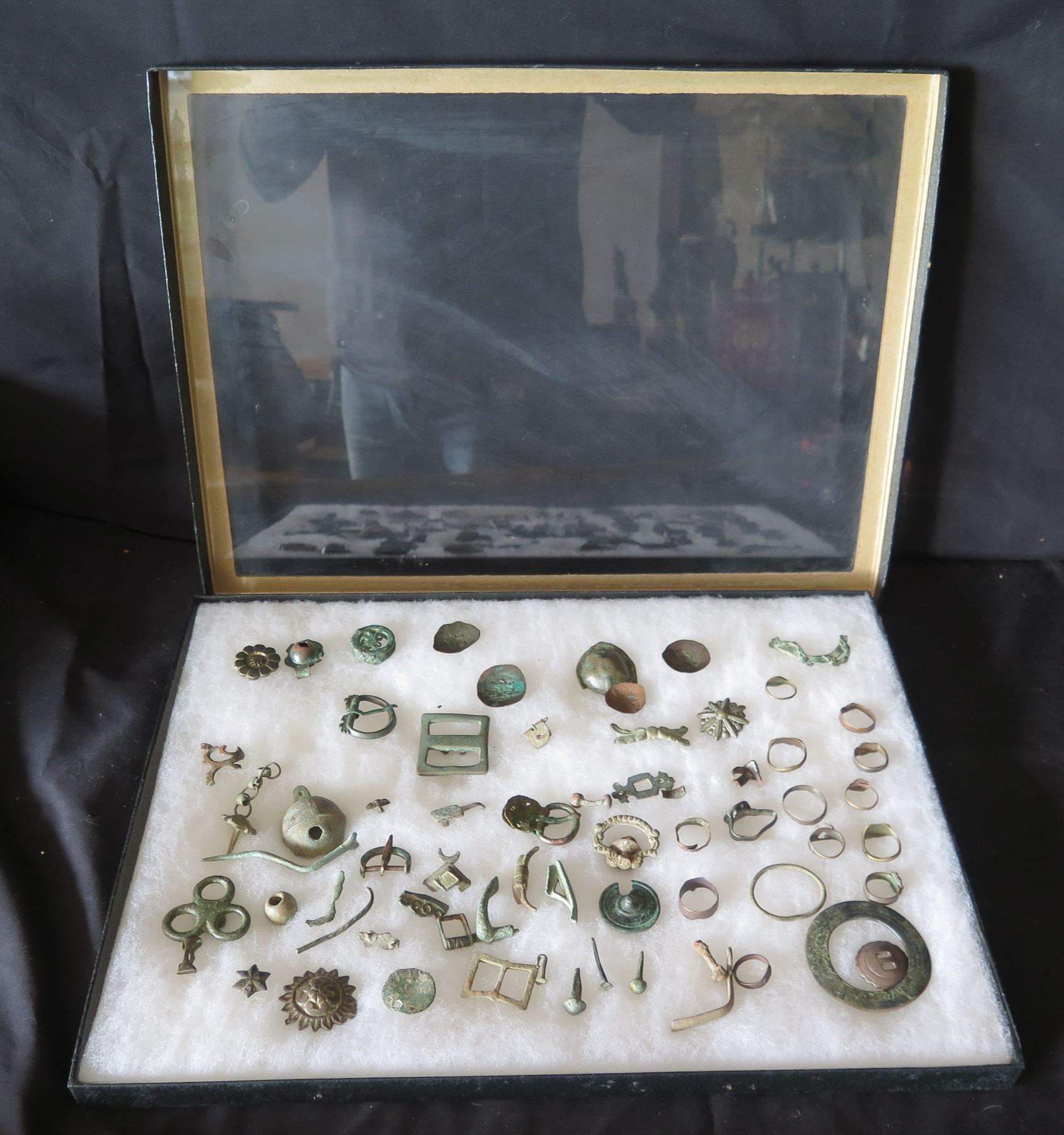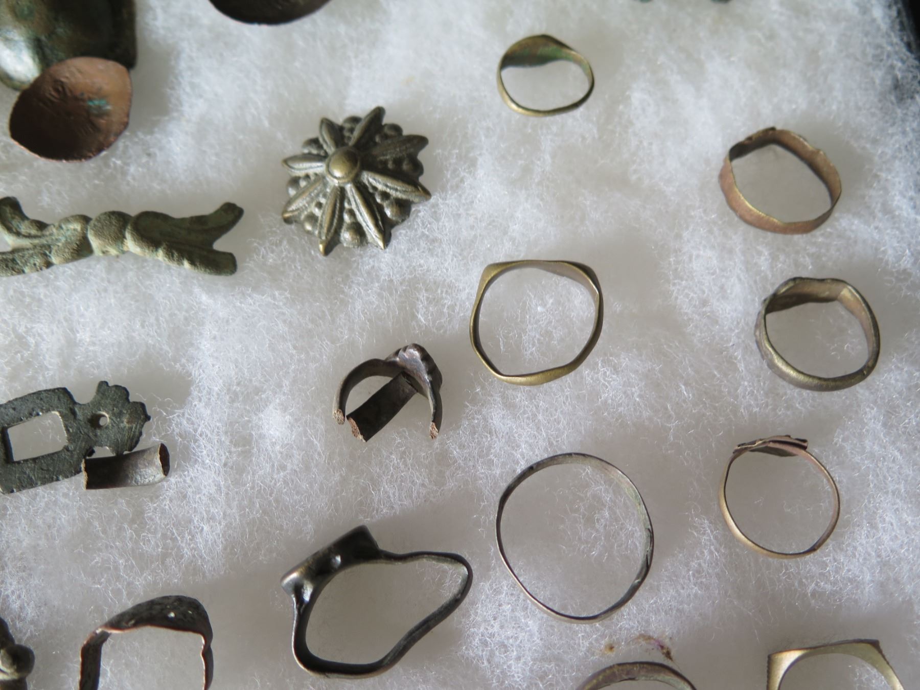 Multiple Rings, Pins, Brooches & Metal Pieces: Flowers, Nails, Stars, etc in Display Case 16"L
