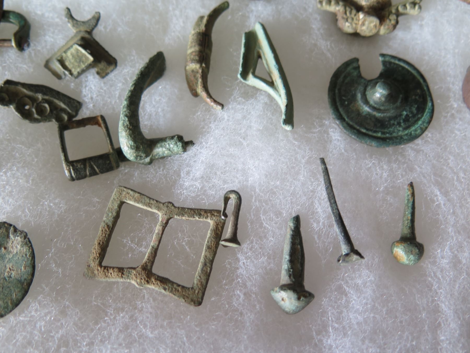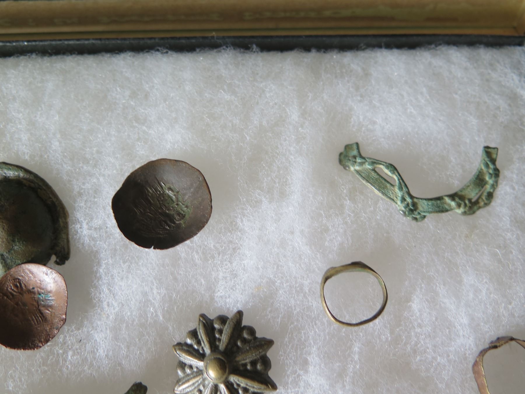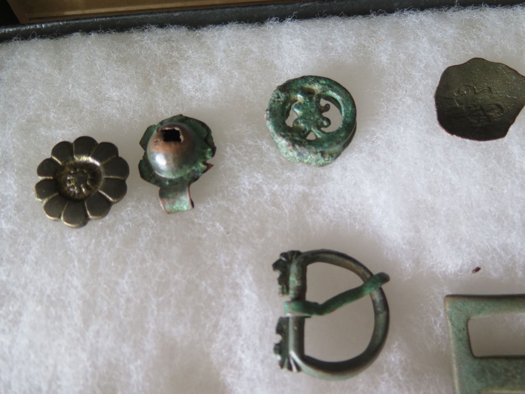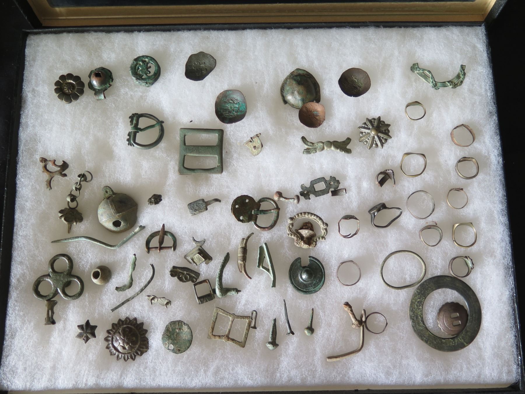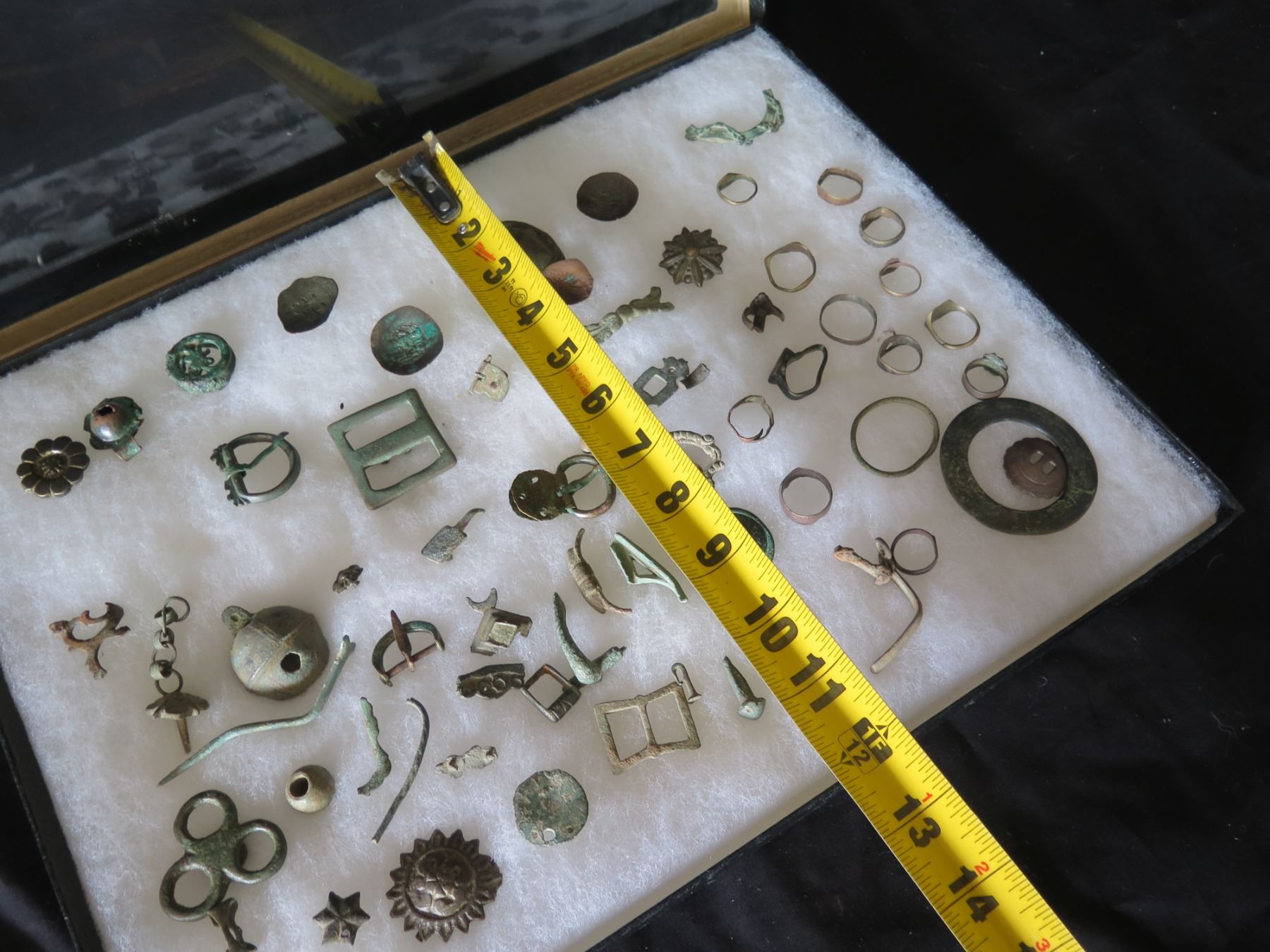 Multiple Rings, Pins, Brooches & Metal Pieces: Flowers, Nails, Stars, etc in Display Case 16"L