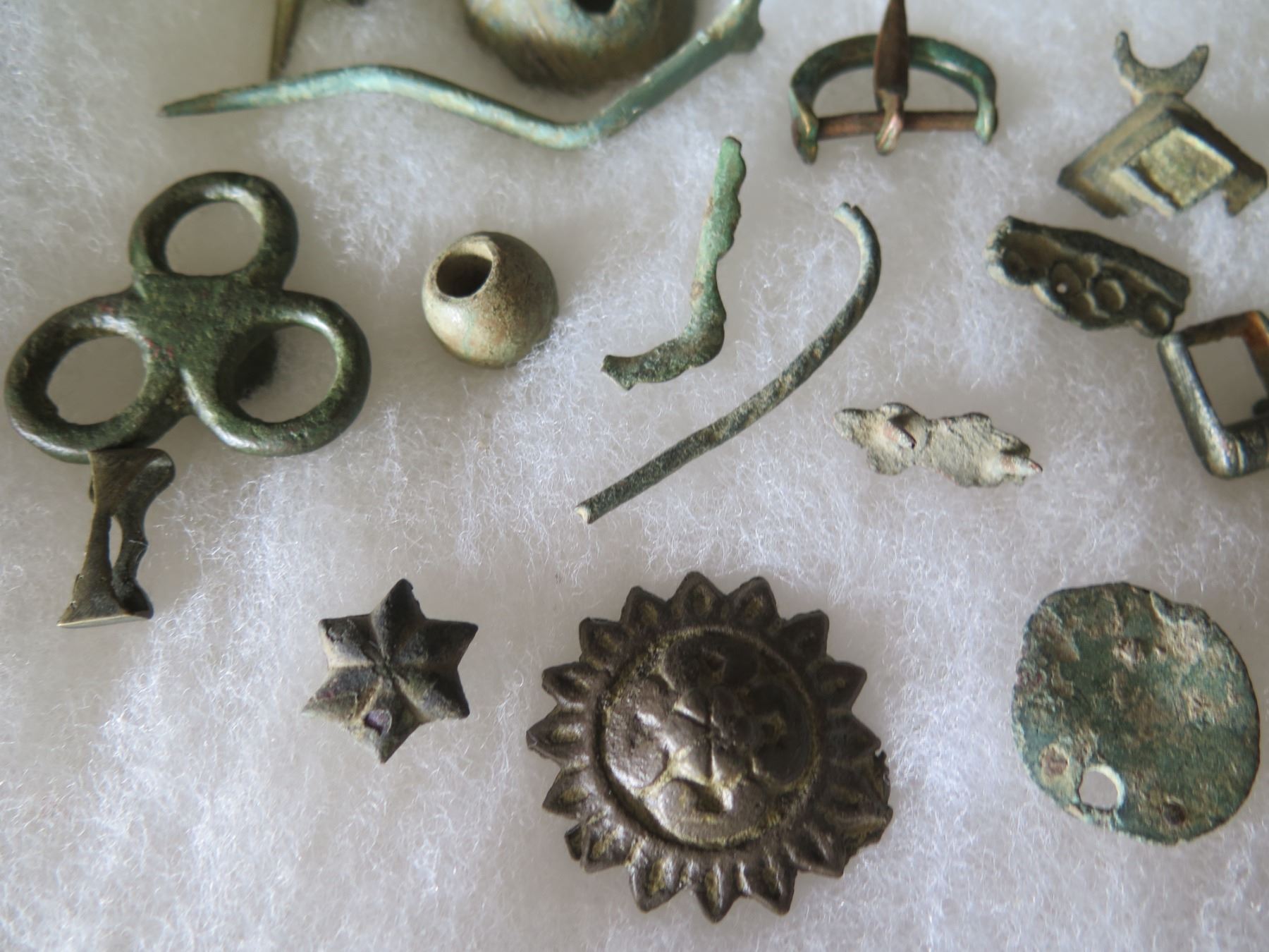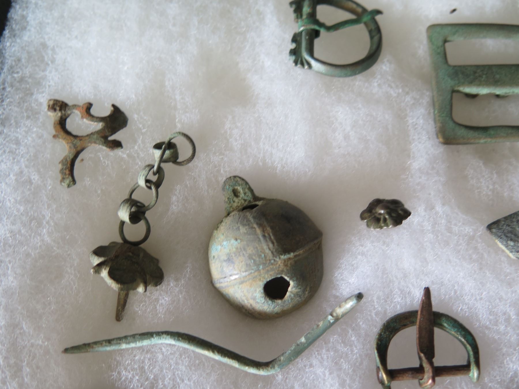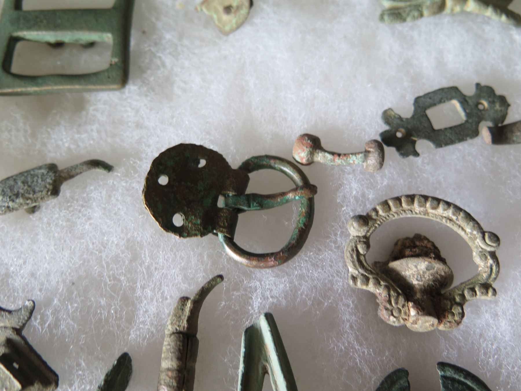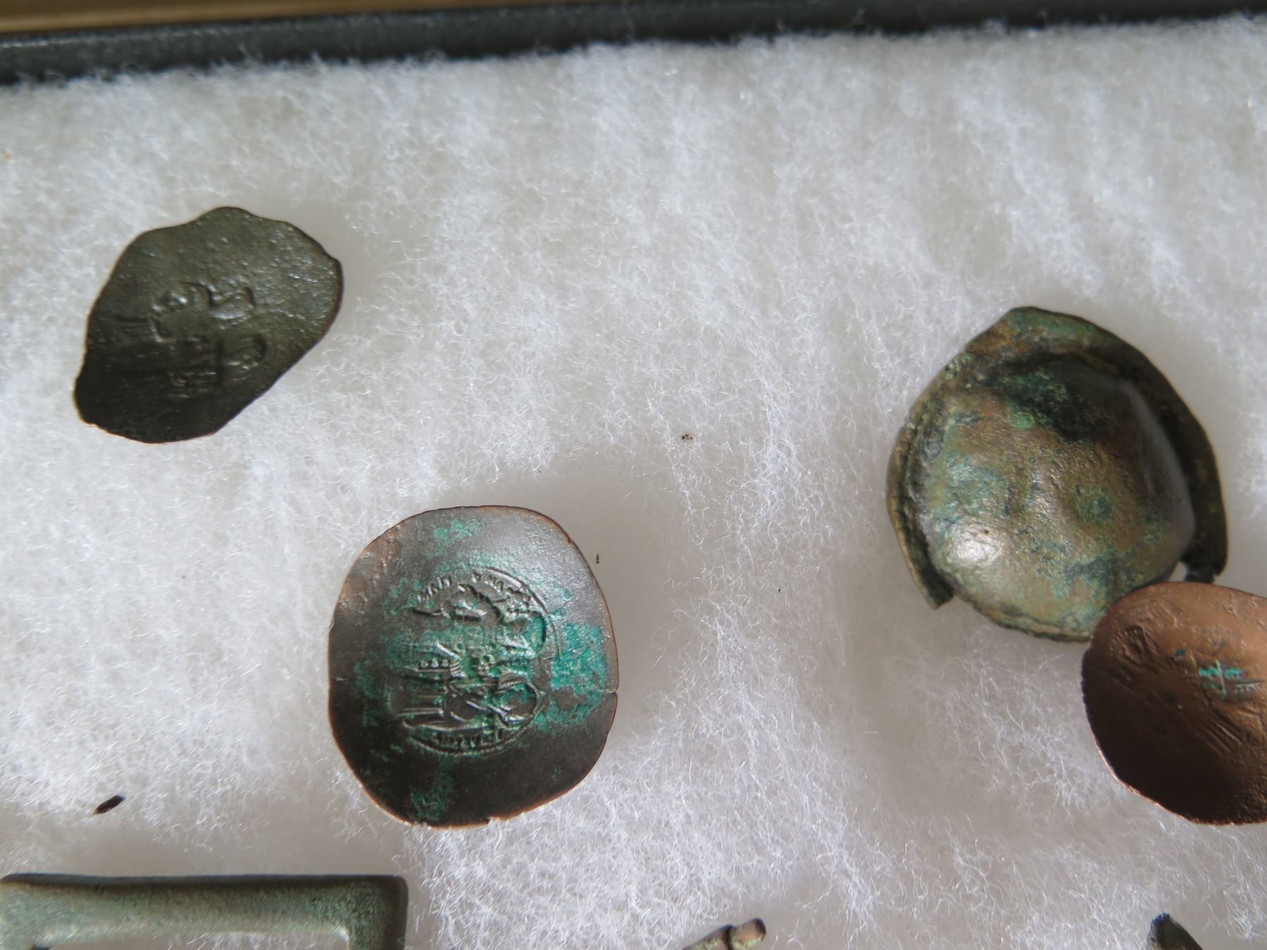 Multiple Rings, Pins, Brooches & Metal Pieces: Flowers, Nails, Stars, etc in Display Case 16"L