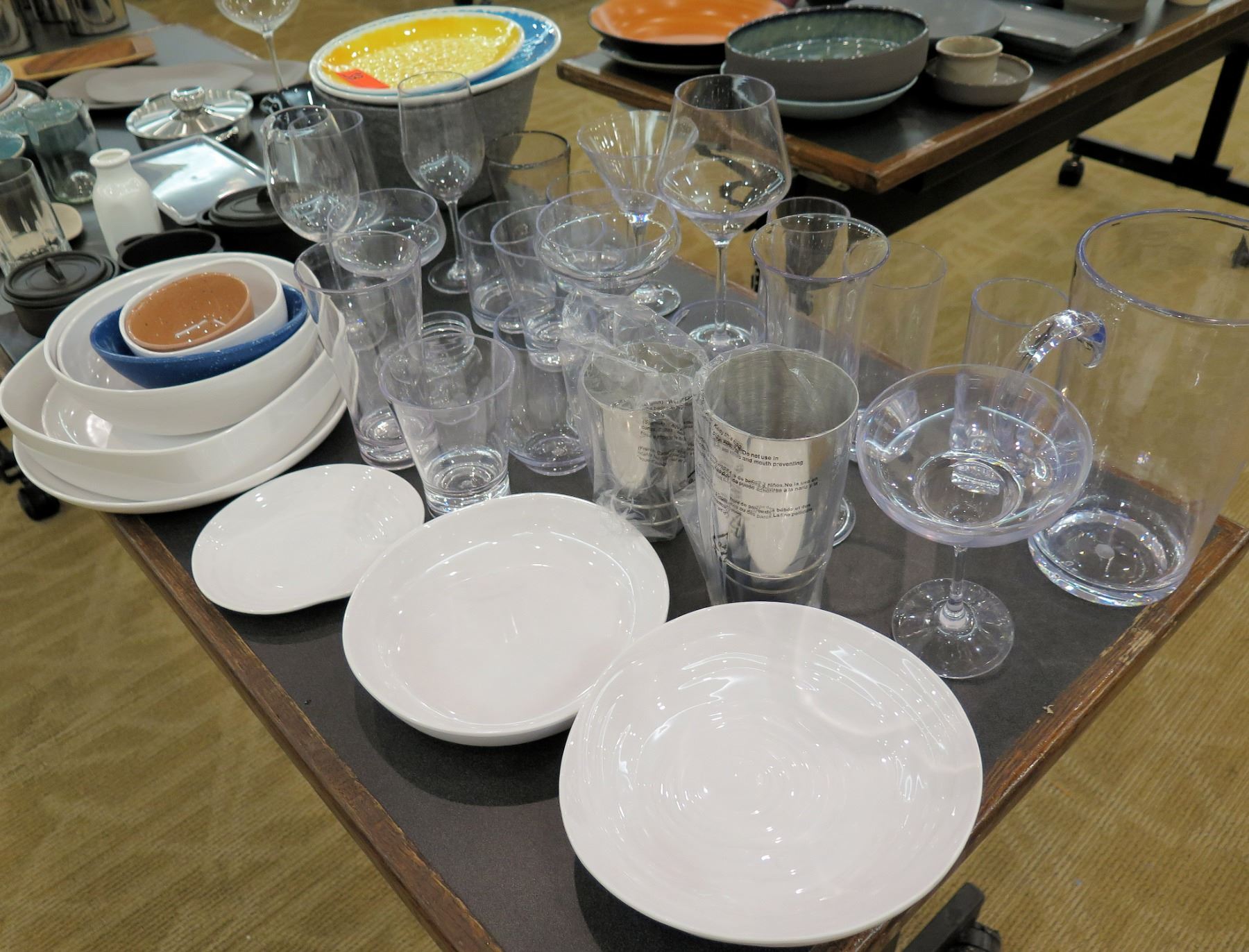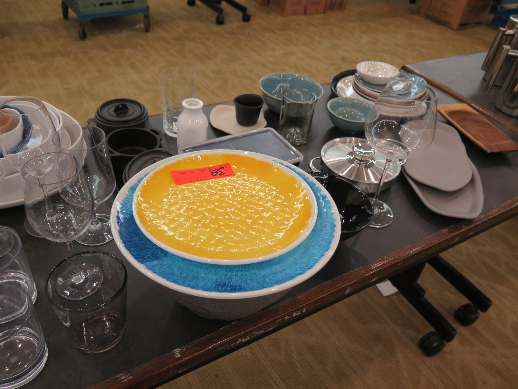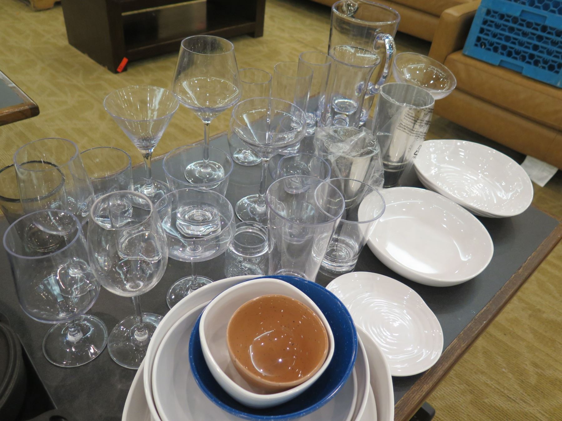 Multiple White Serving Dishes, Bowls, Glassware, Wood Plate, Metal Bowl, etc. Winning Bidder needs to bring boxes to pack and transport