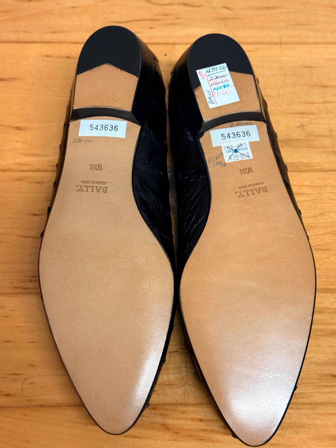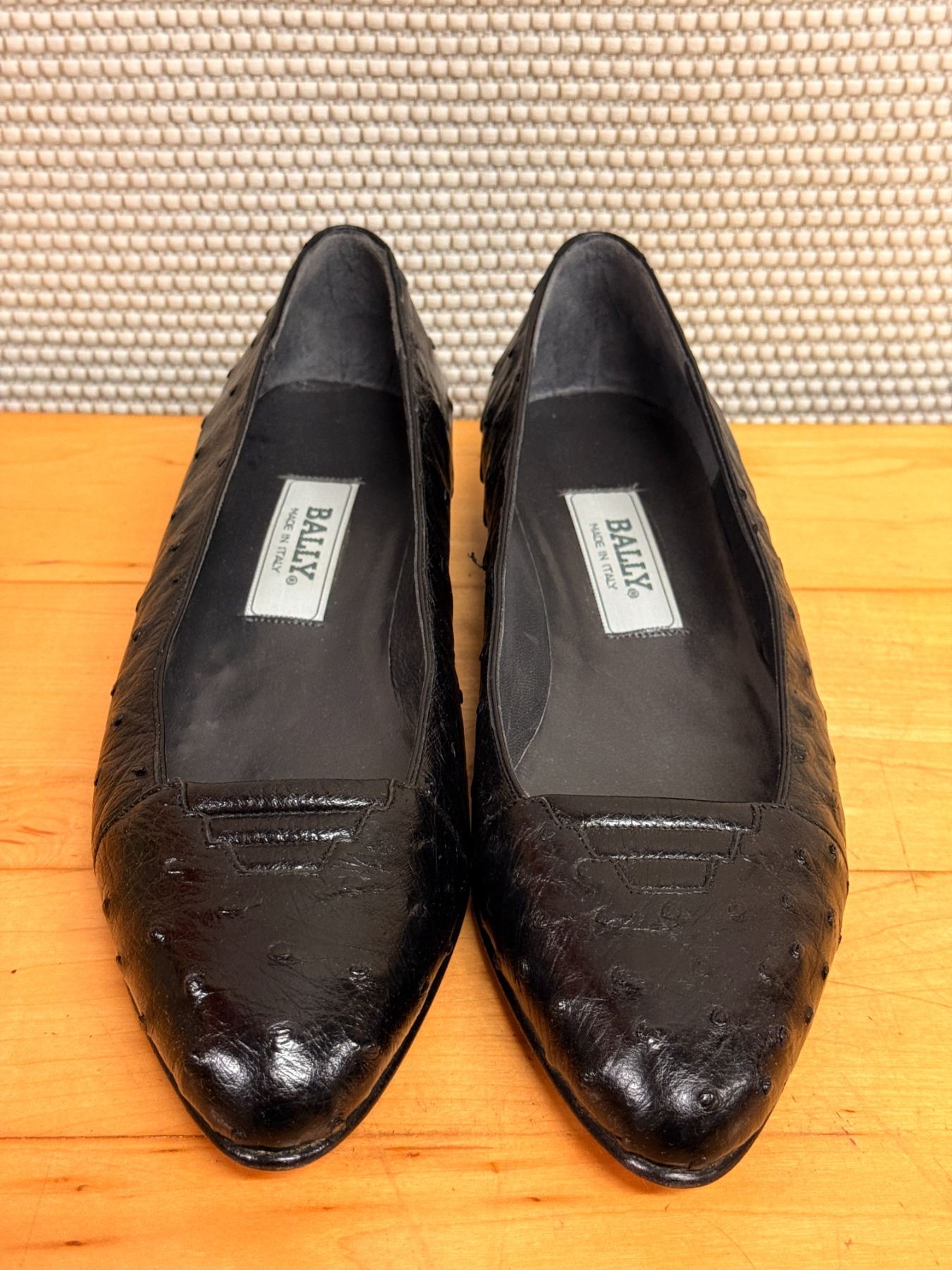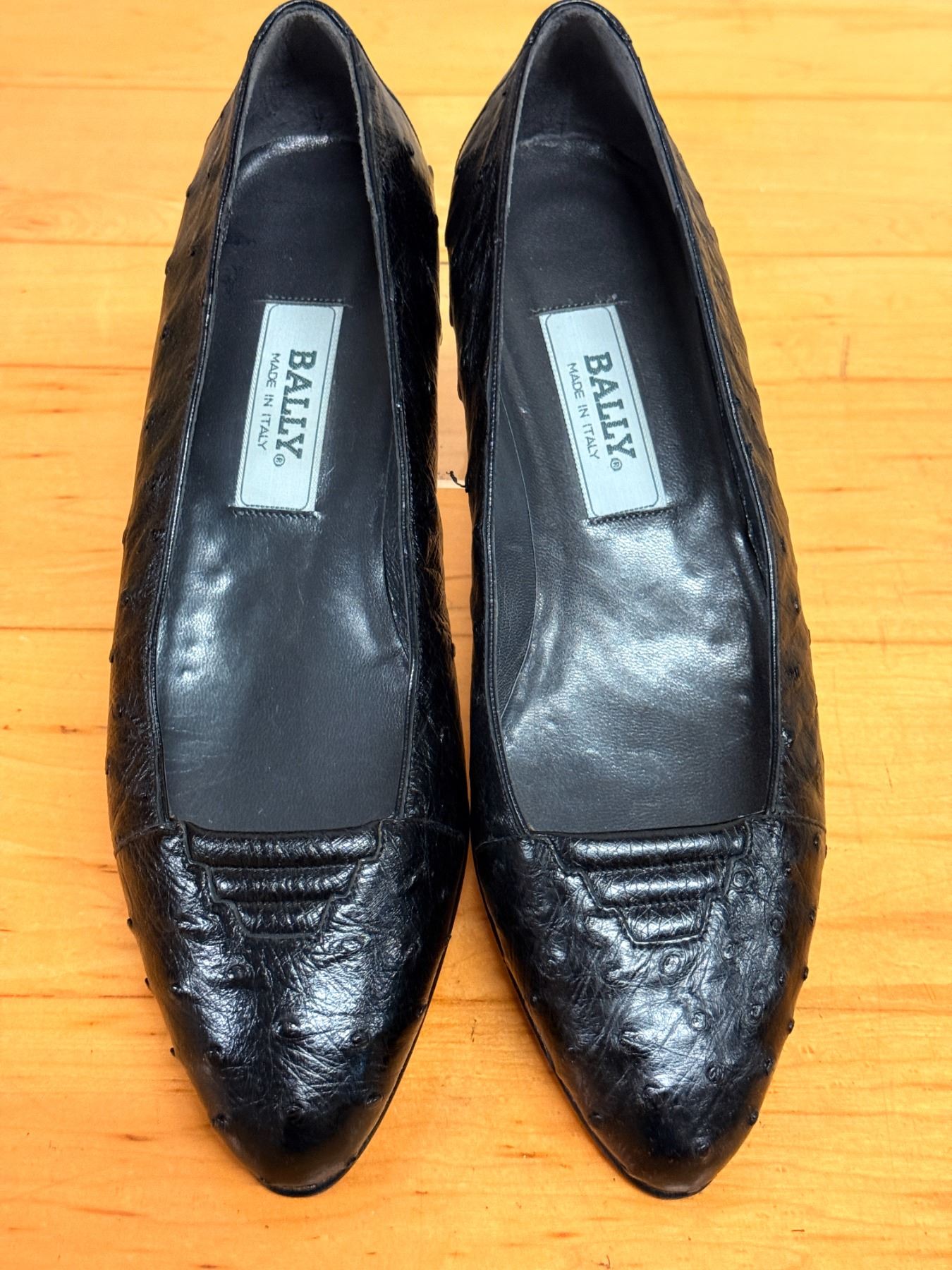Vintage Bally Italian-made pointed flats crafted from textured black leather with a sleek silhouette and classic slip-on design. Sophisticated, versatile, and beautifully made. New and unworn, stored for years; heel requires repair due to storage wear.
