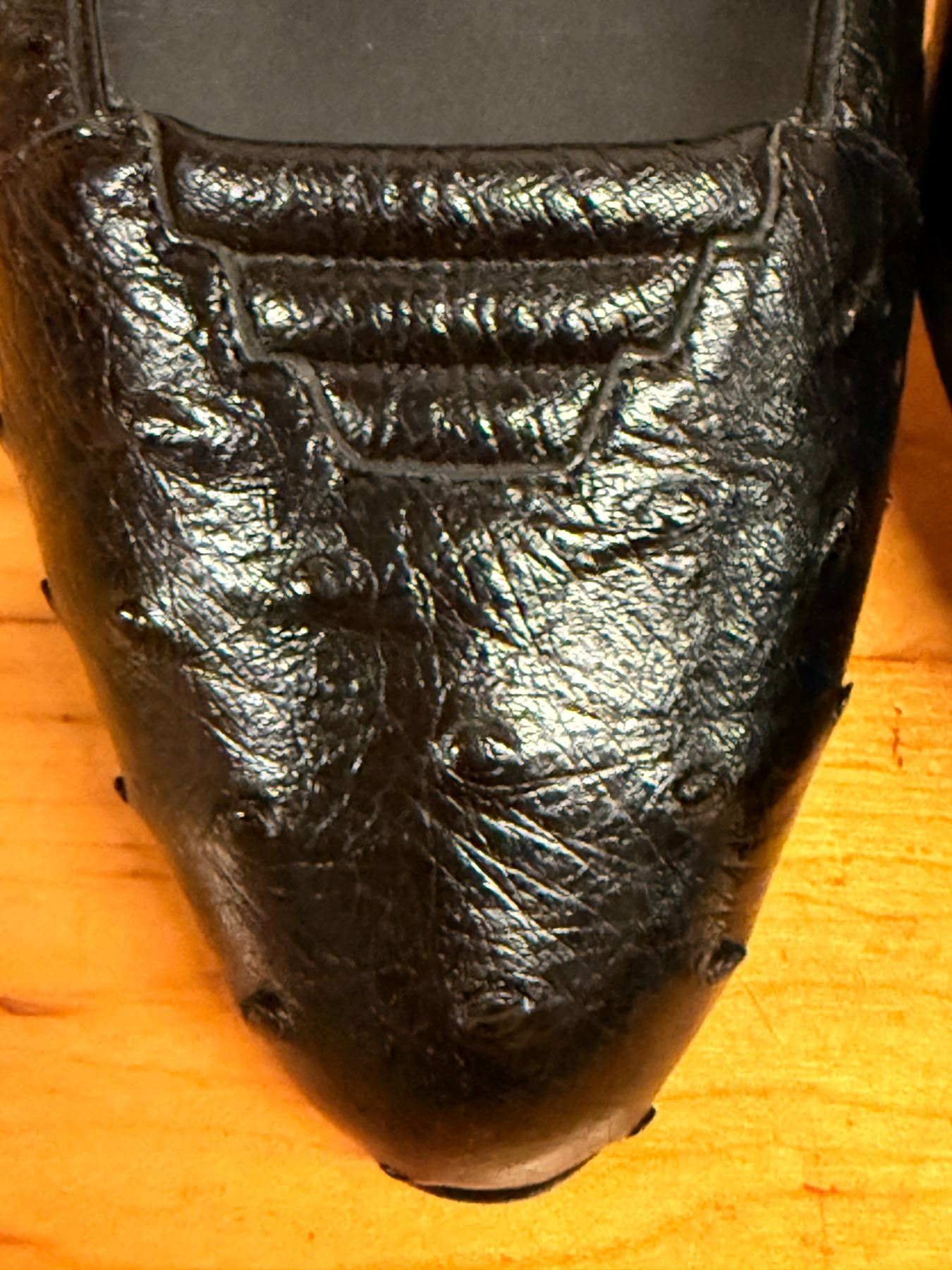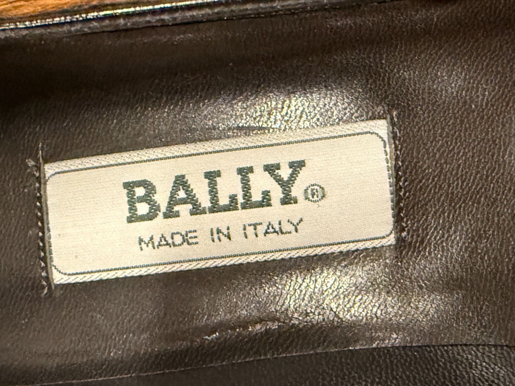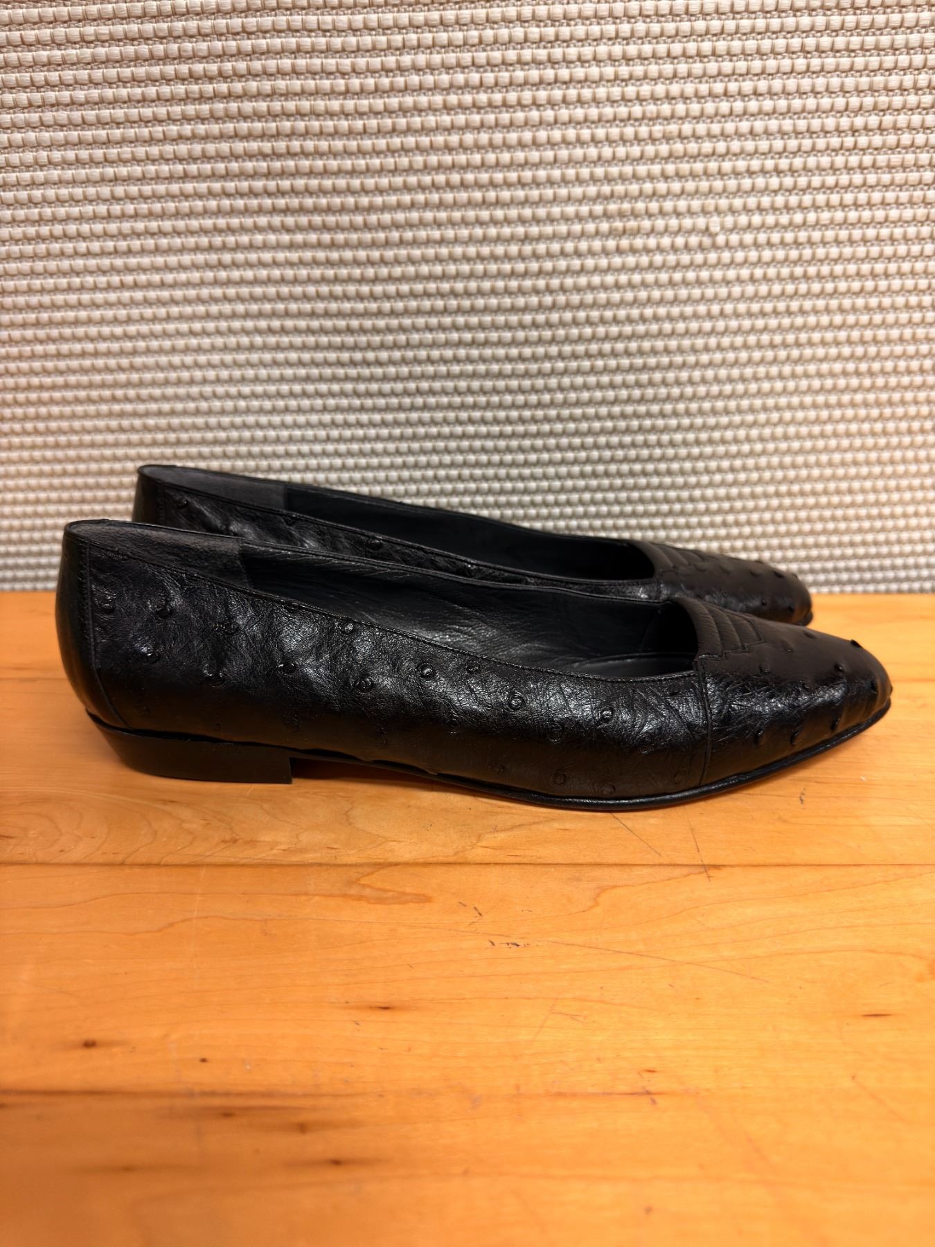 Vintage Bally Italian-made pointed flats crafted from textured black leather with a sleek silhouette and classic slip-on design. Sophisticated, versatile, and beautifully made. New and unworn, stored for years; heel requires repair due to storage wear.