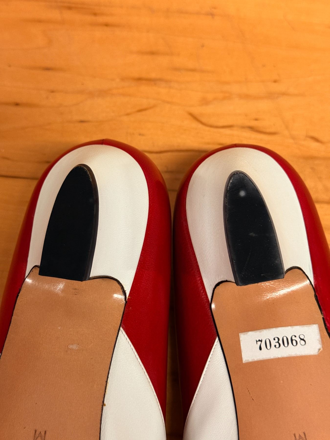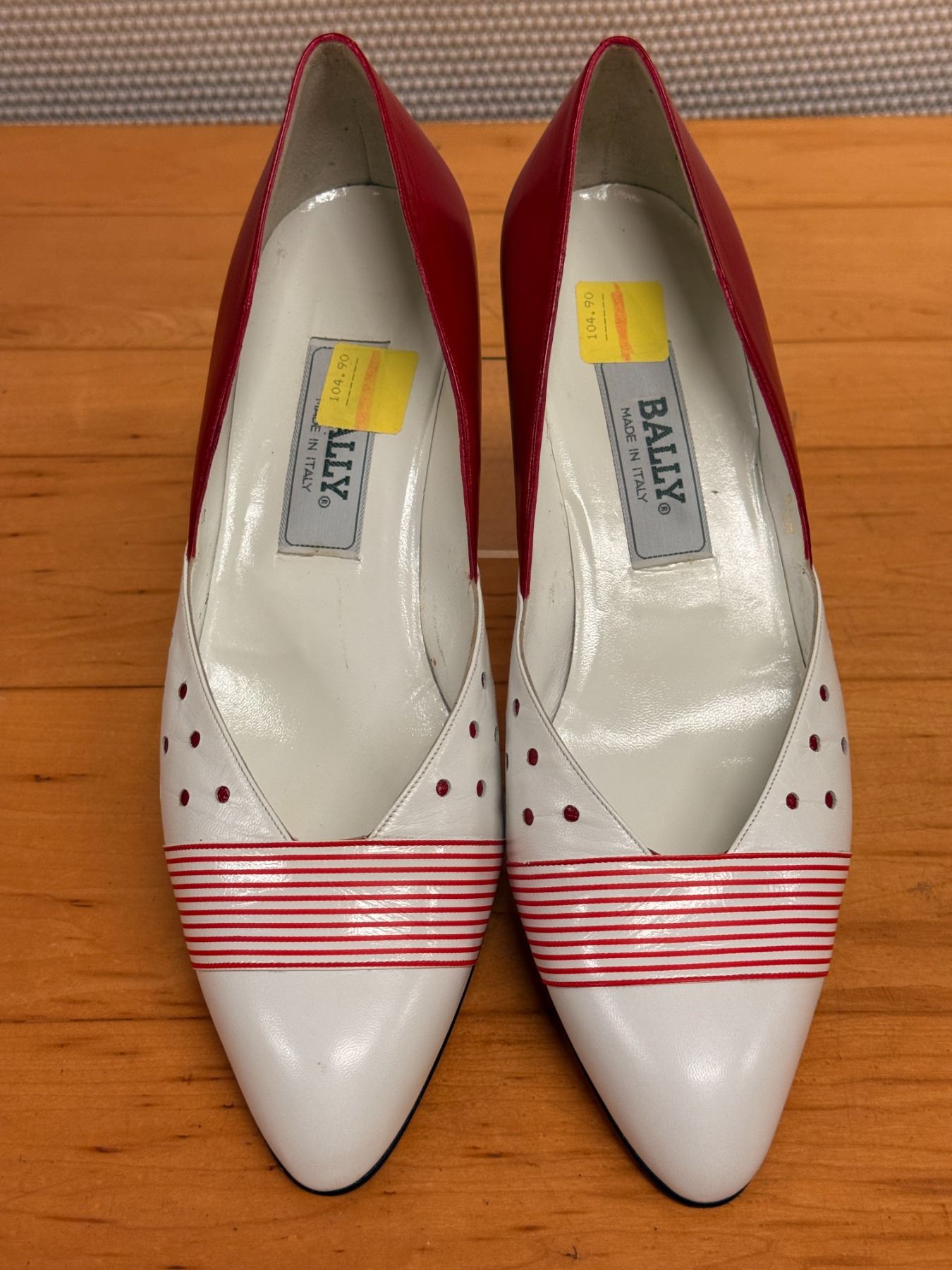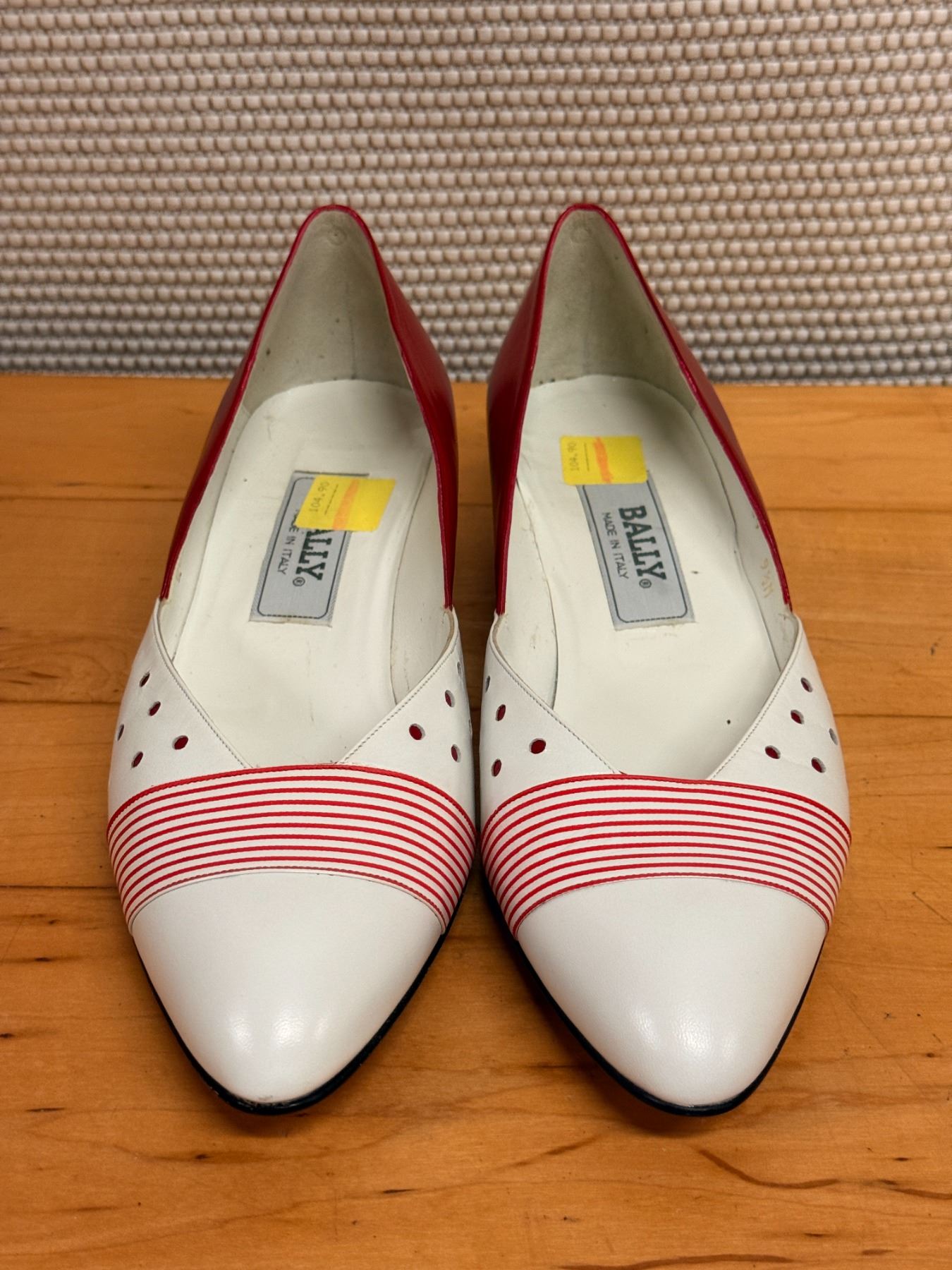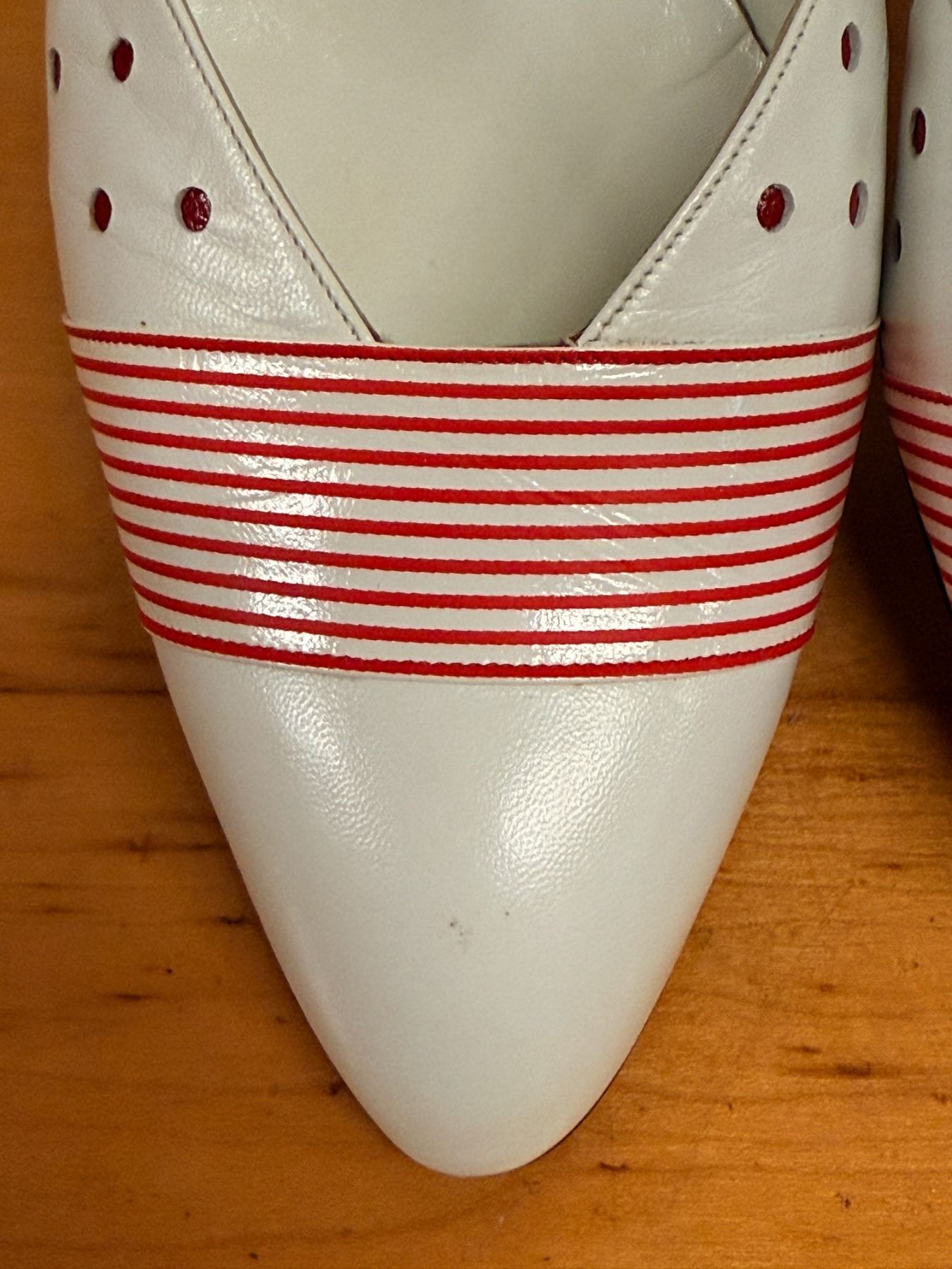 Vintage Bally Italian-made pointed flats with white leather uppers, red striped cap-toe detail, and perforated accents. Bold, stylish, and crafted with classic European quality. New and unworn, stored for years; heel requires repair due to storage wear.