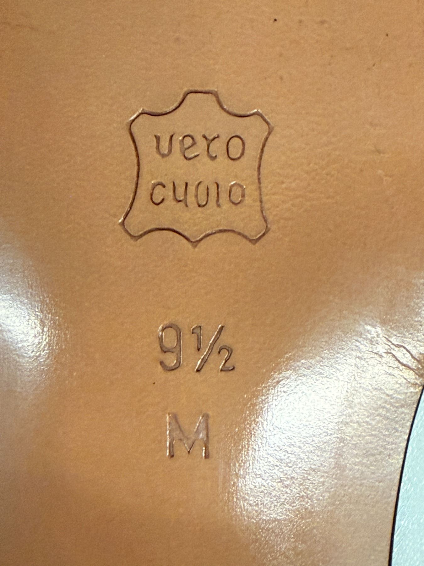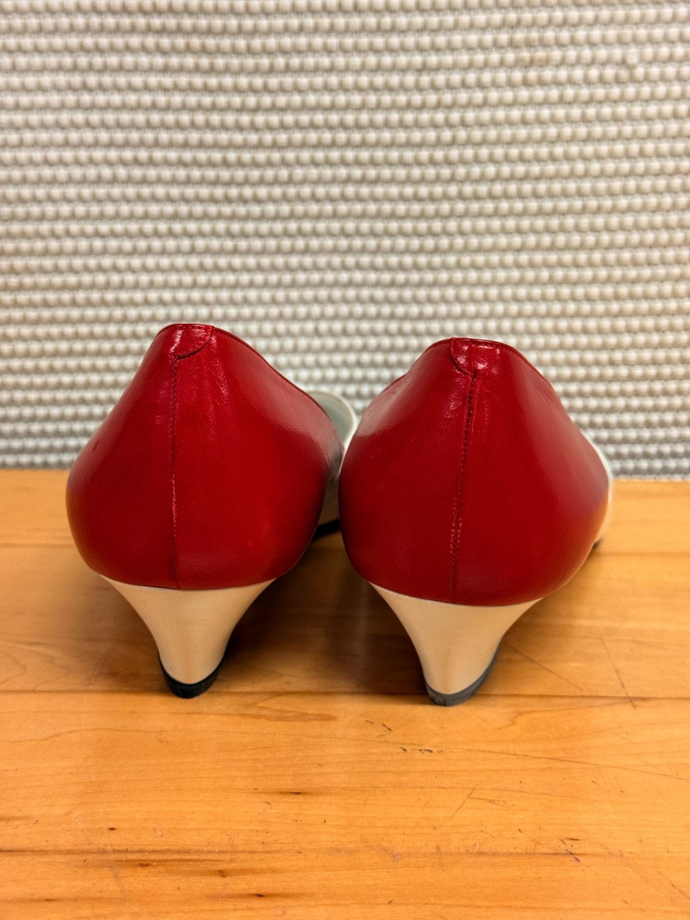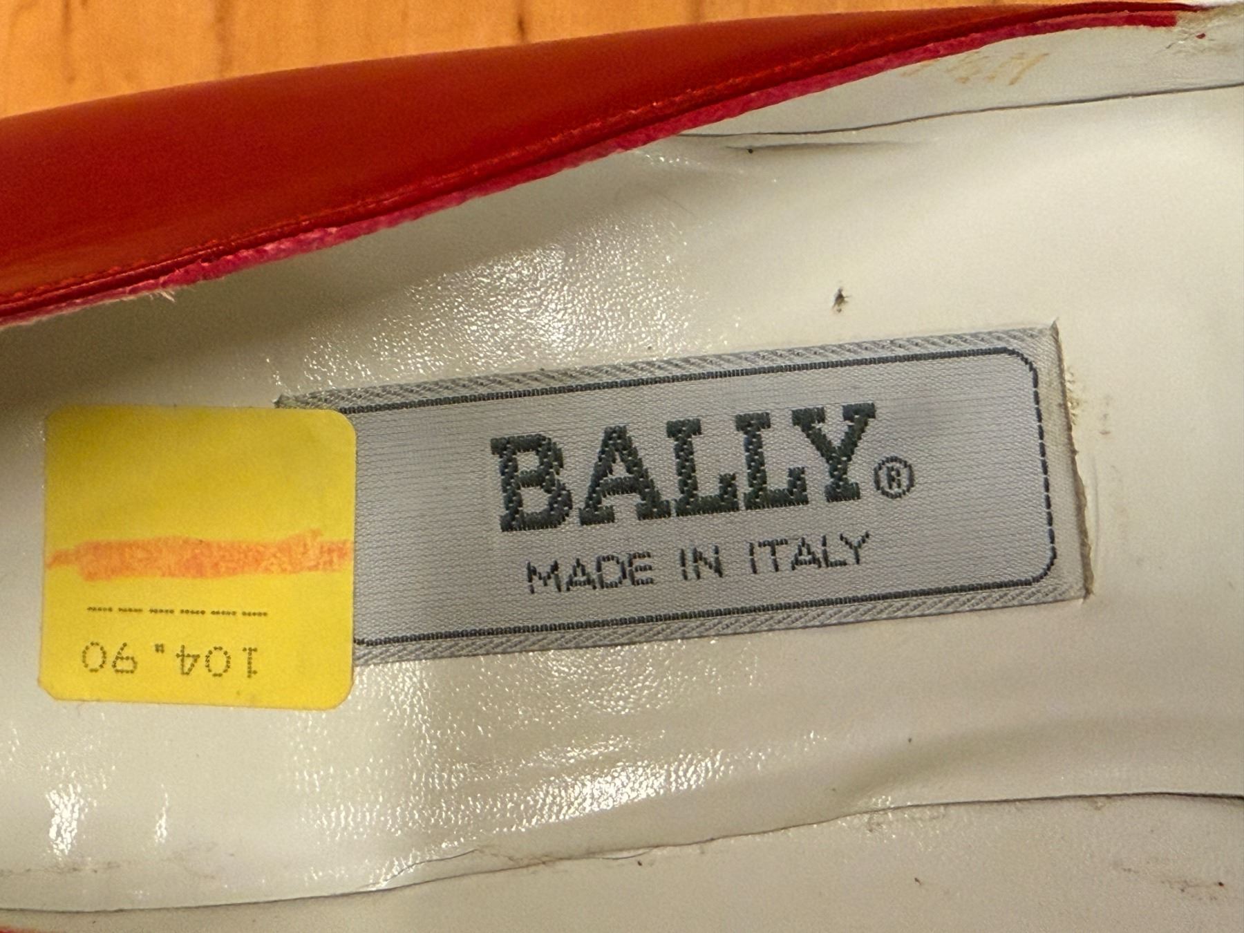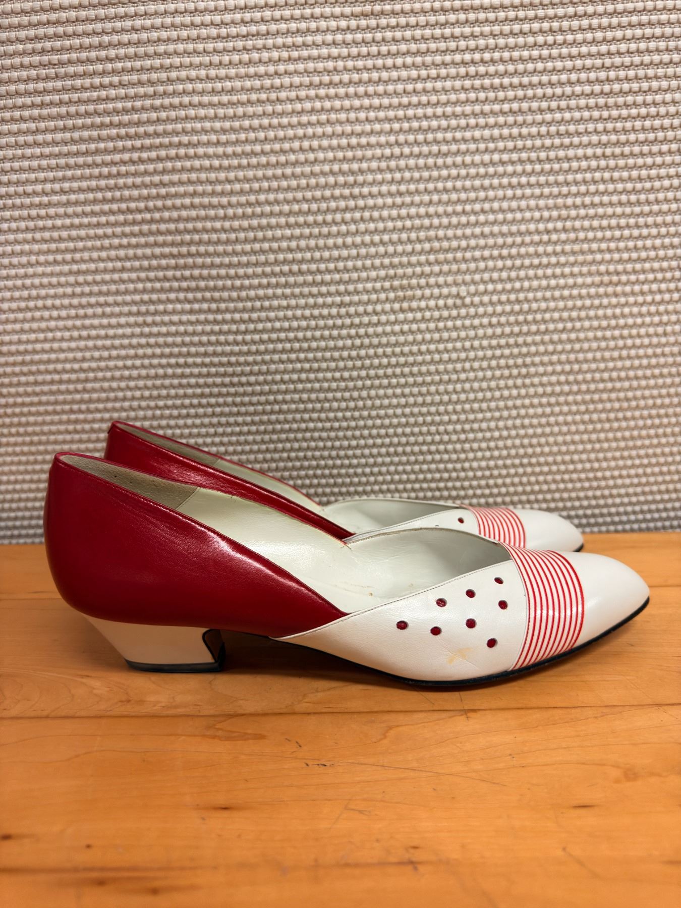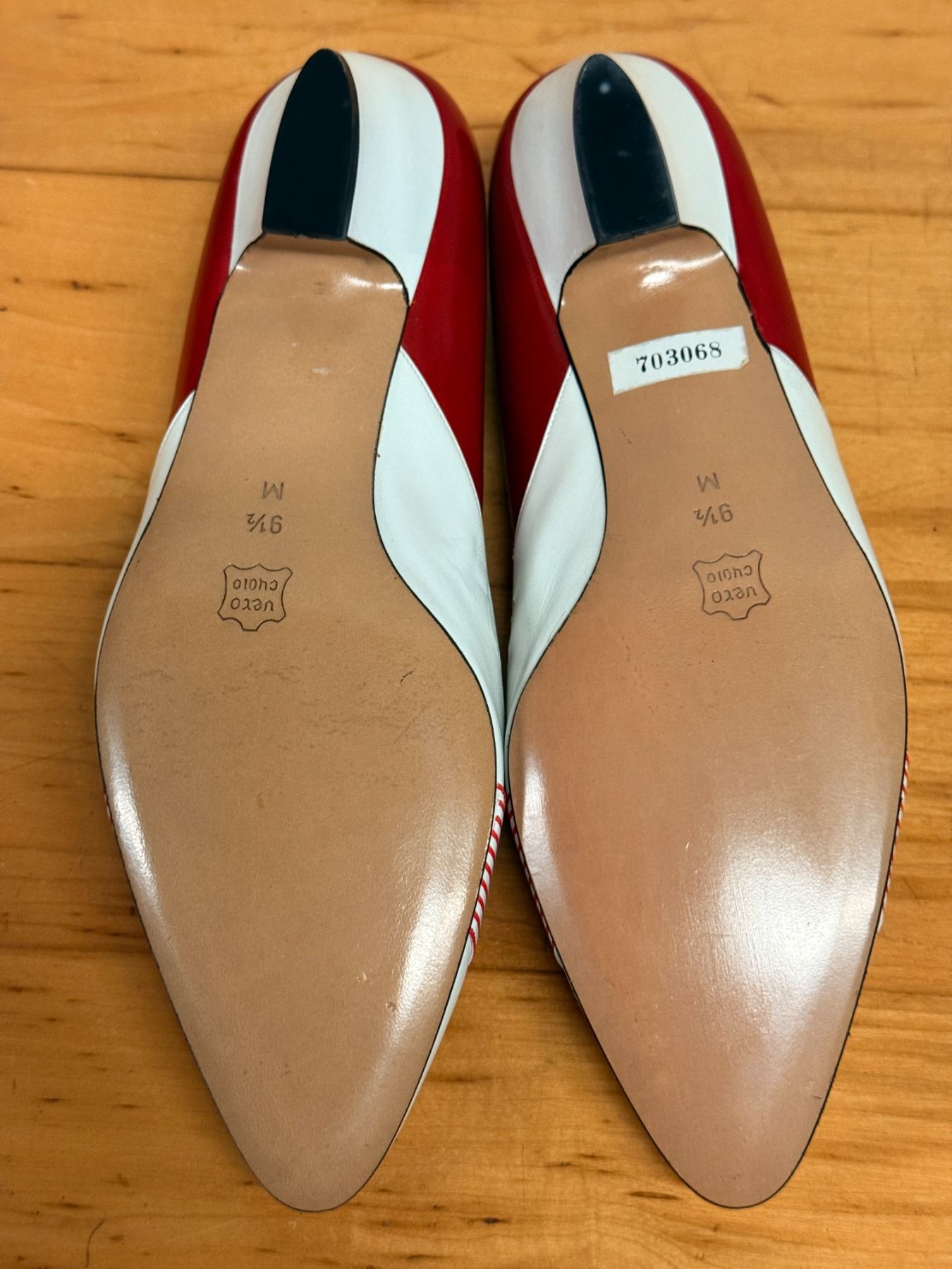 Vintage Bally Italian-made pointed flats with white leather uppers, red striped cap-toe detail, and perforated accents. Bold, stylish, and crafted with classic European quality. New and unworn, stored for years; heel requires repair due to storage wear.