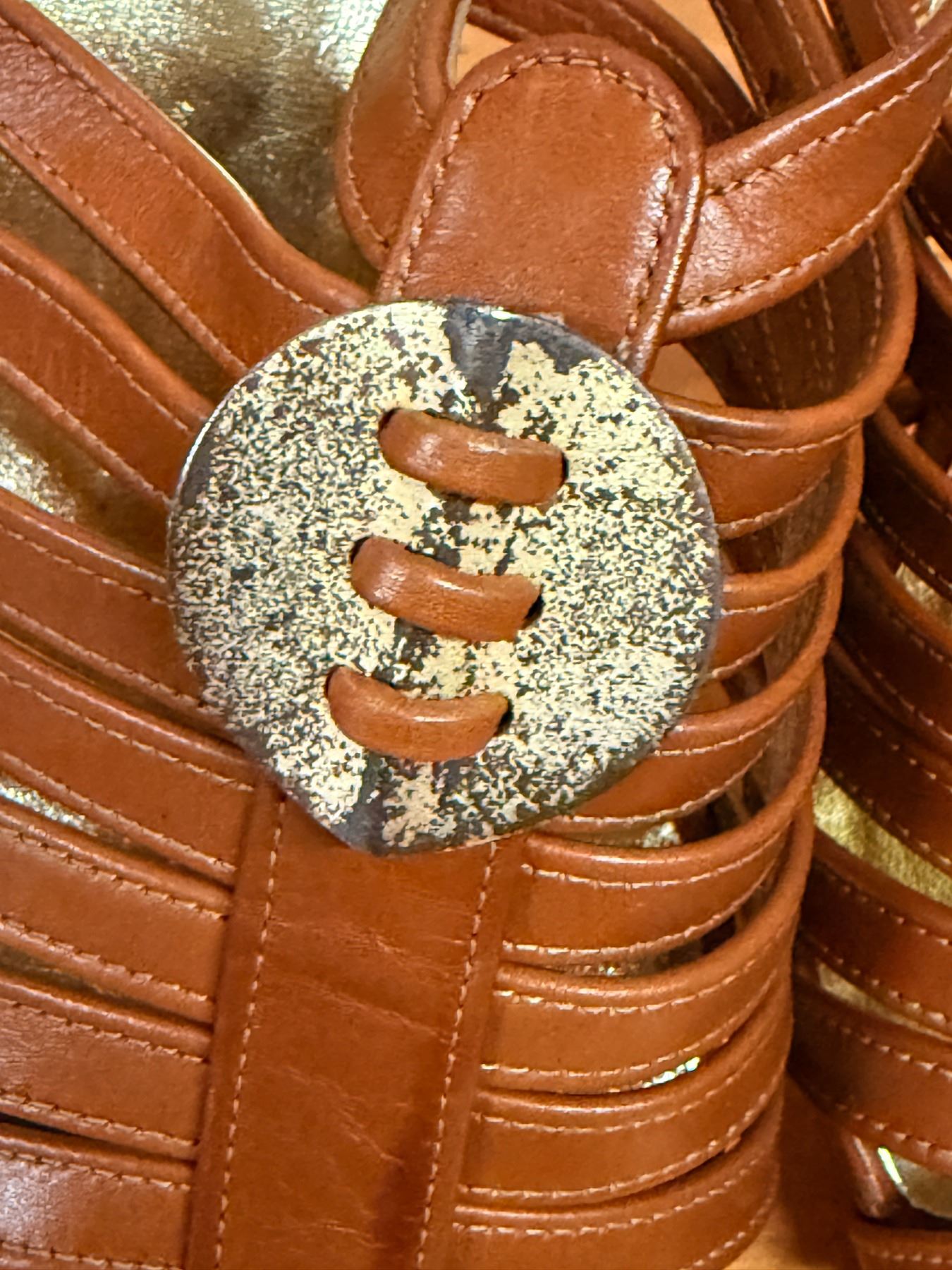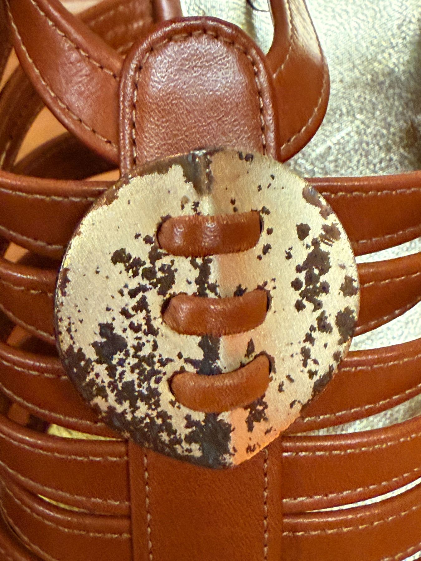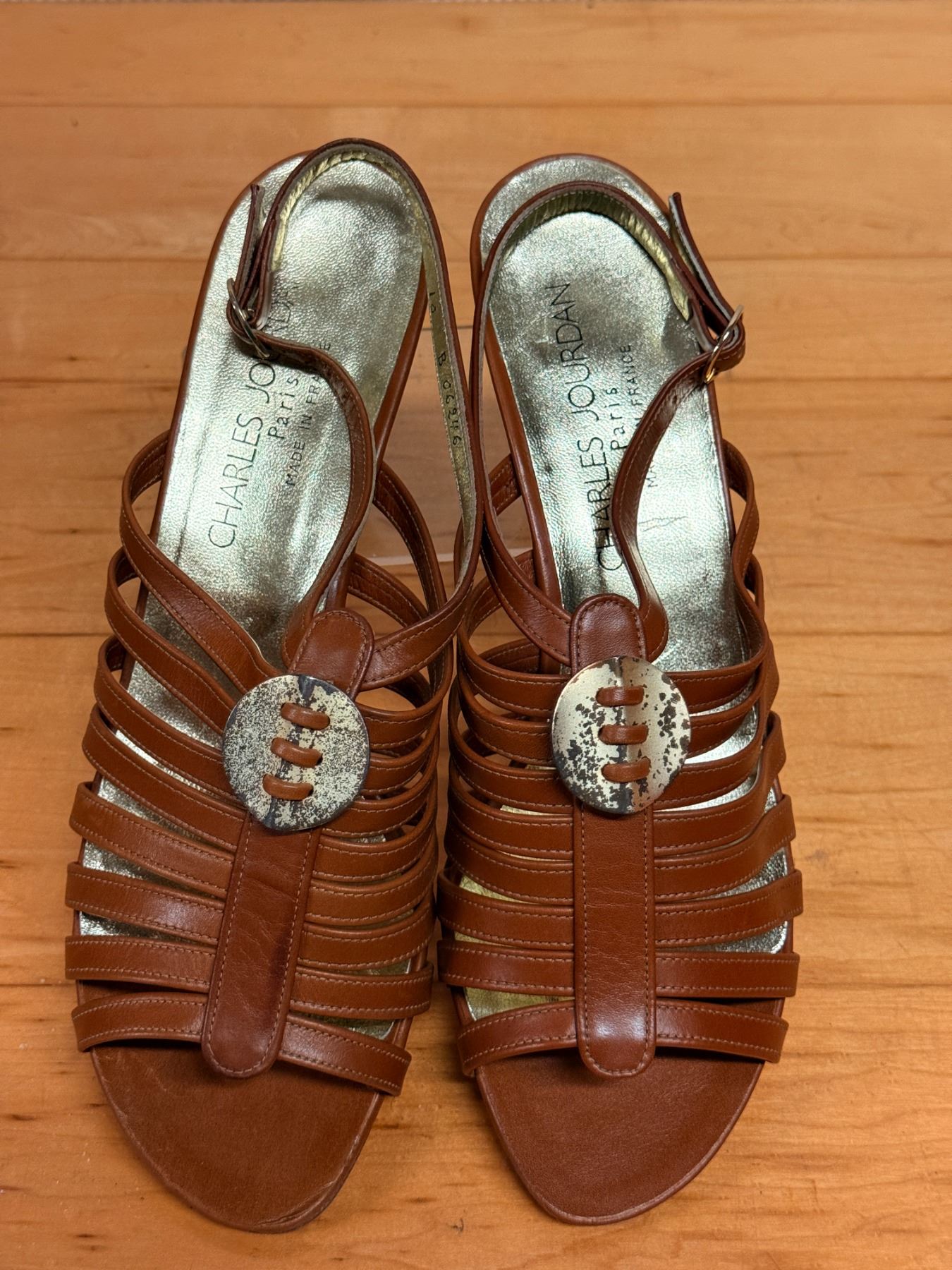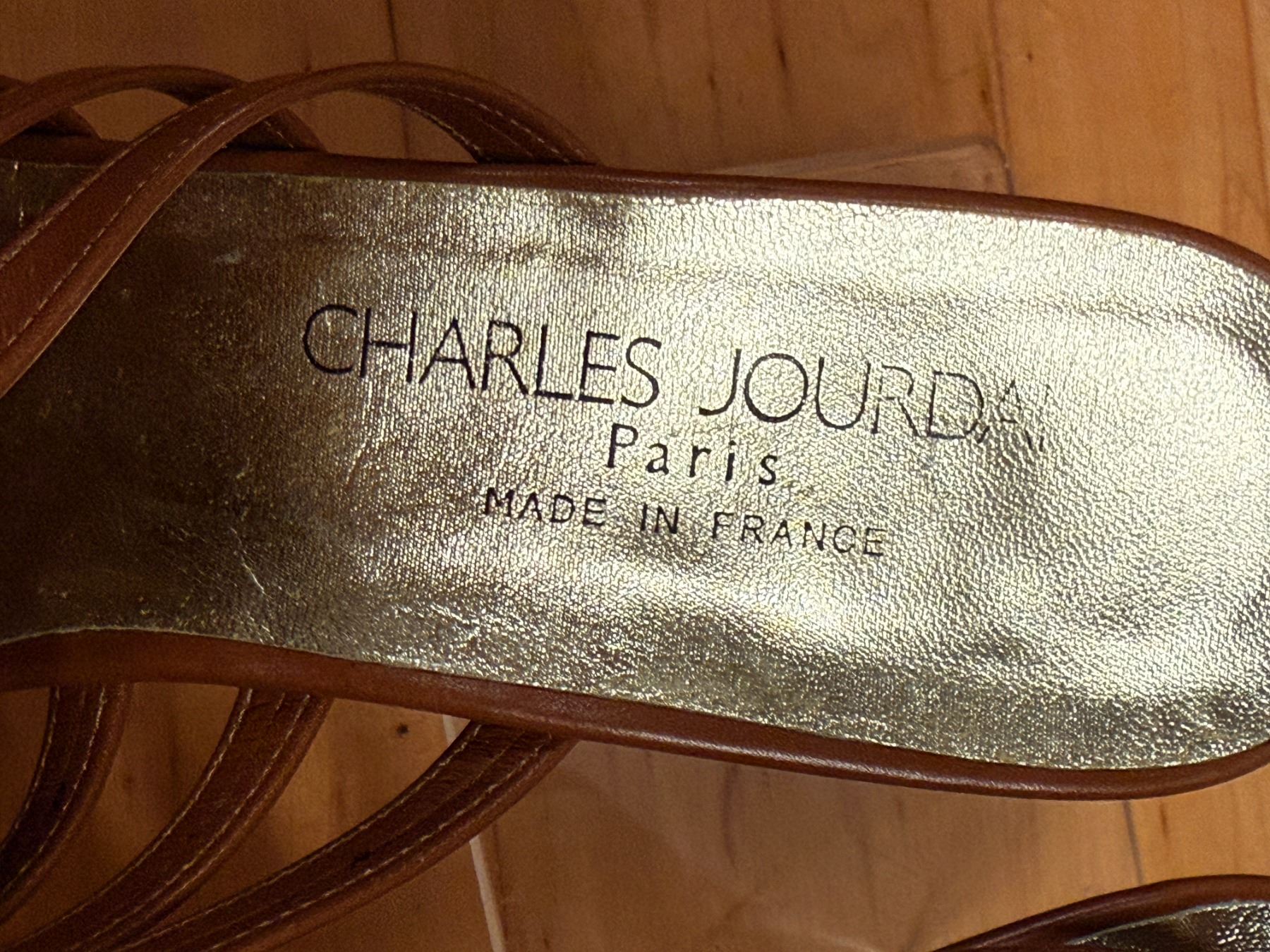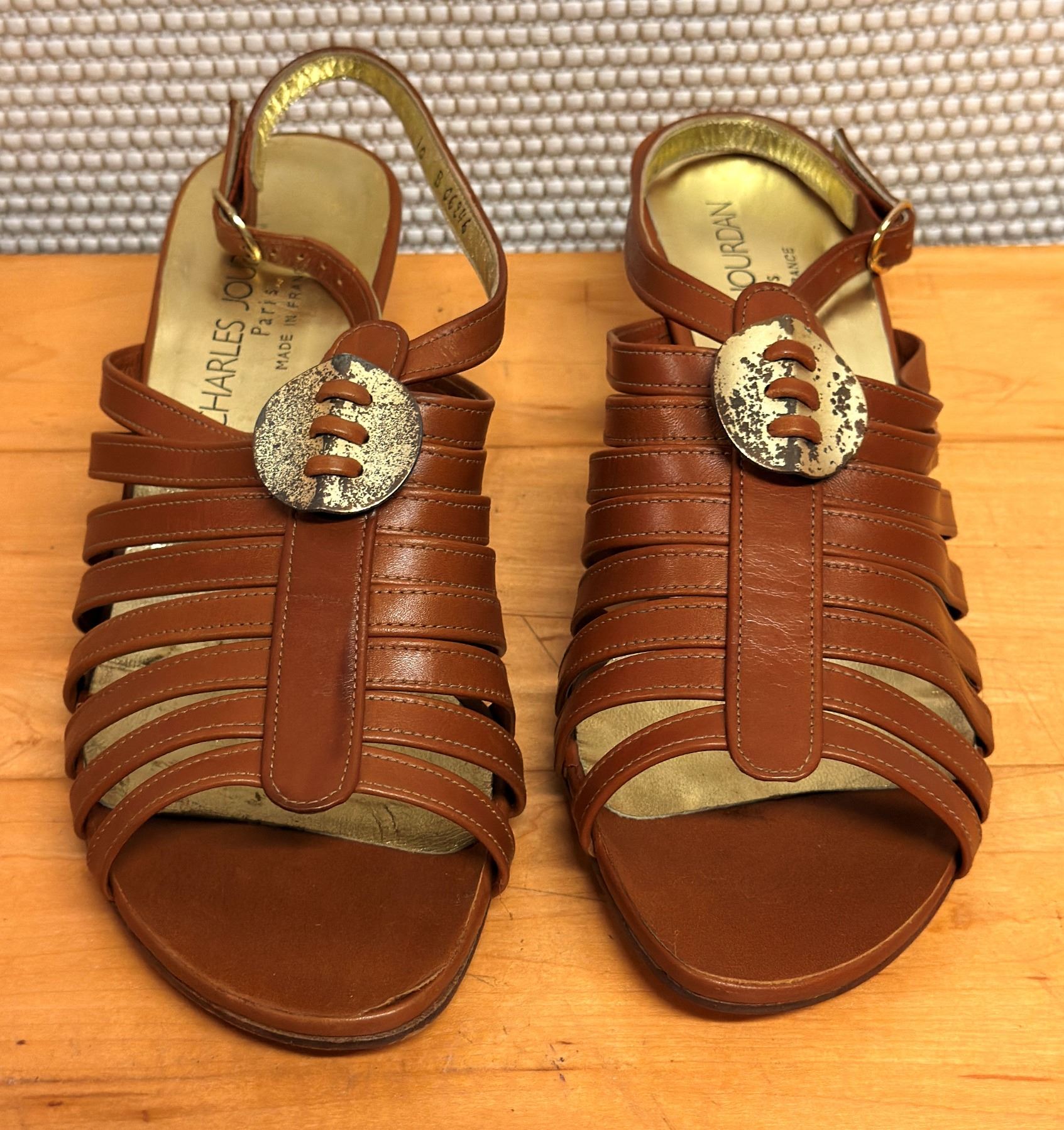 Vintage Charles Jourdan brown leather strappy sandals featuring soft premium leather, a sculpted slingback strap, and a bold gold-tone textured medallion detail. New and unworn, stored for years; heel requires repair due to storage wear.