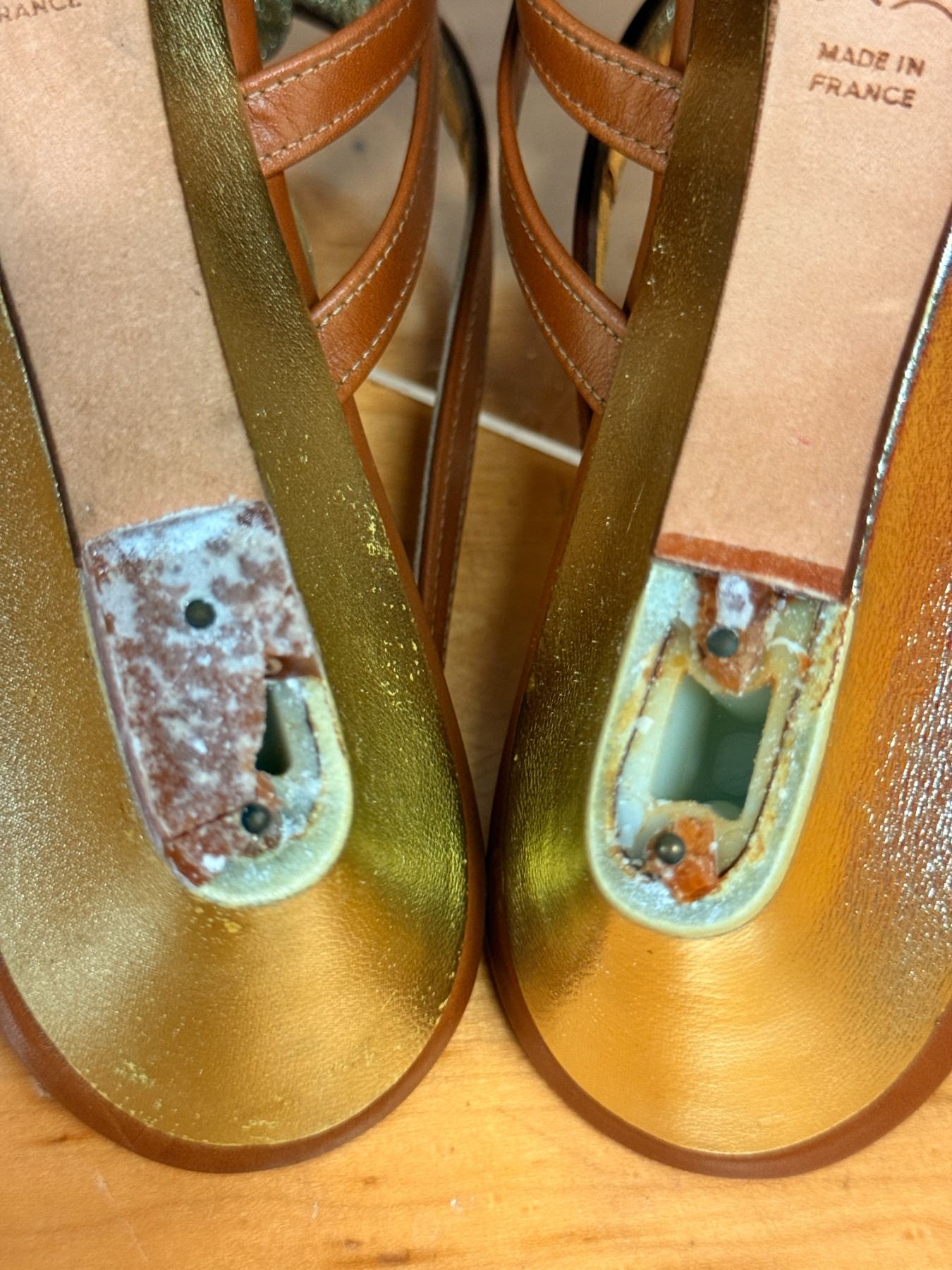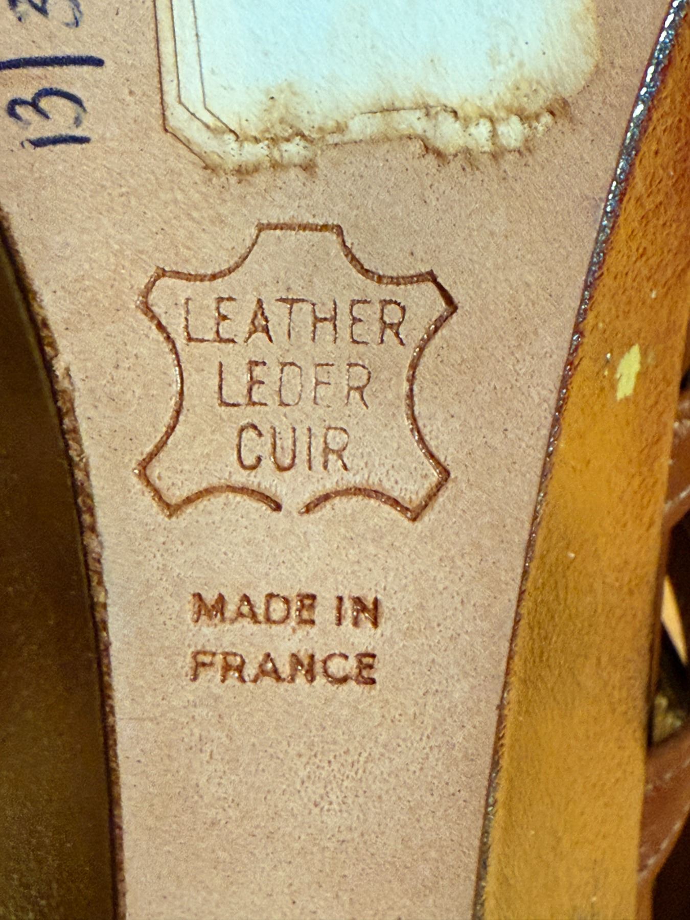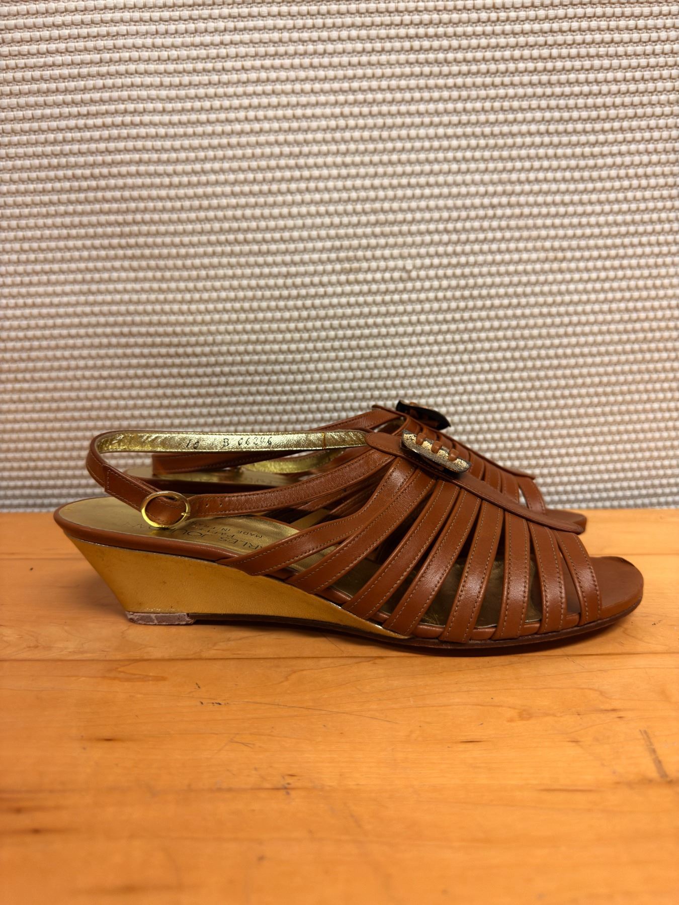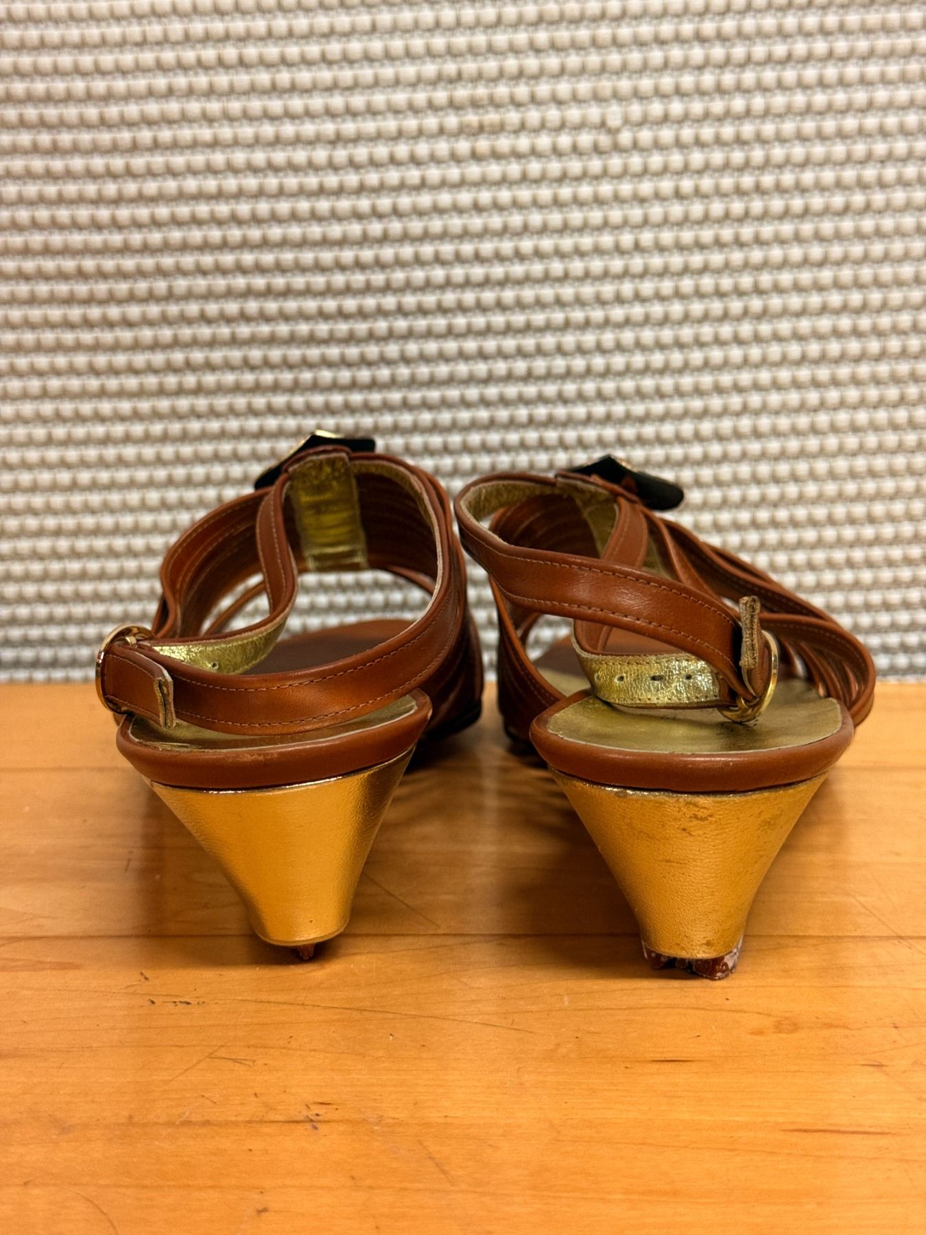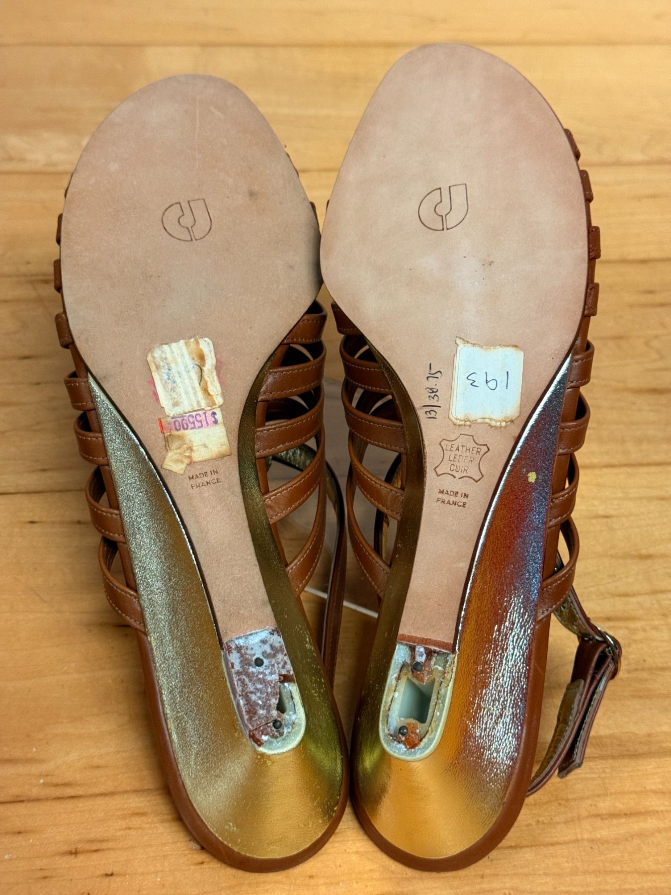 Vintage Charles Jourdan brown leather strappy sandals featuring soft premium leather, a sculpted slingback strap, and a bold gold-tone textured medallion detail. New and unworn, stored for years; heel requires repair due to storage wear.