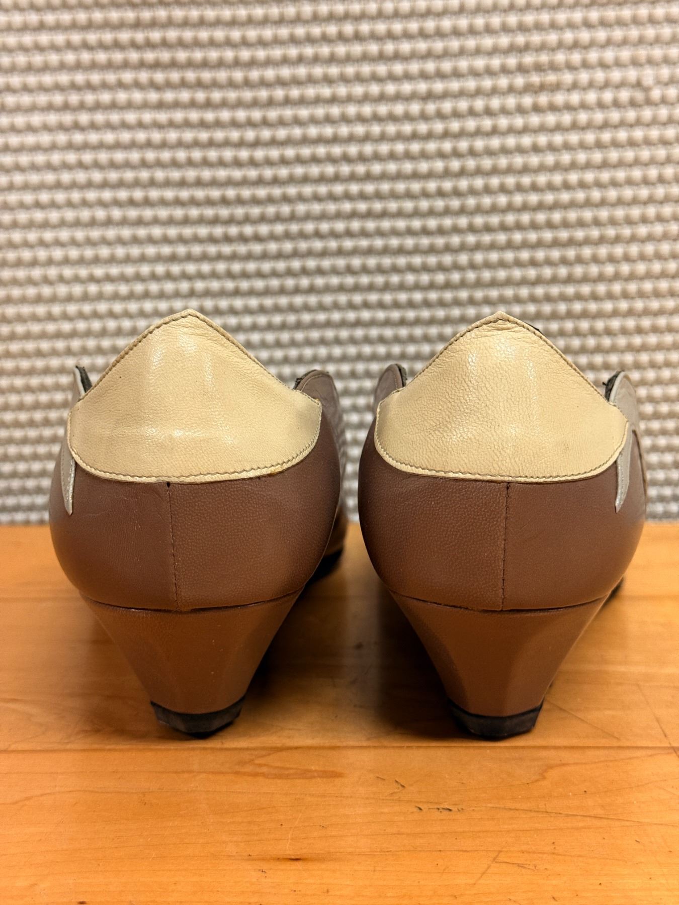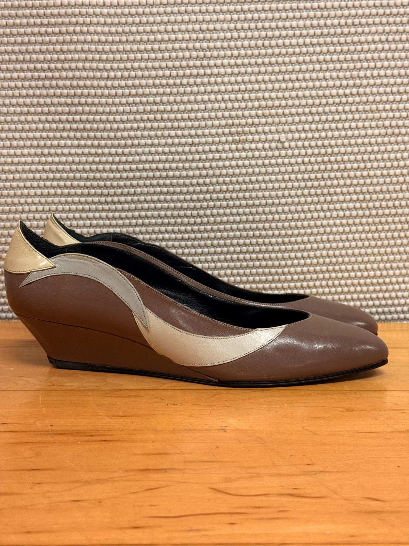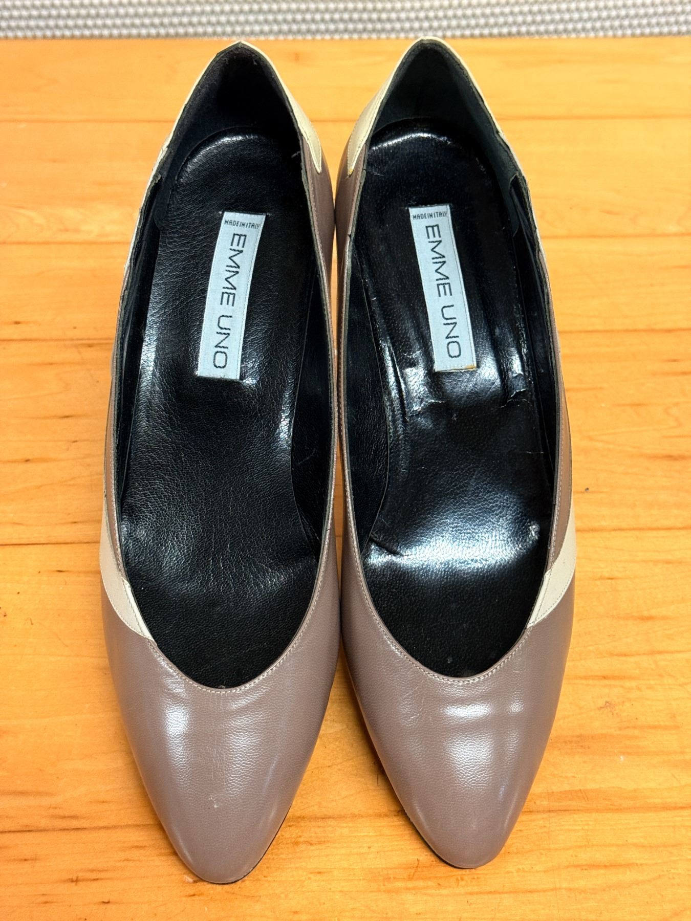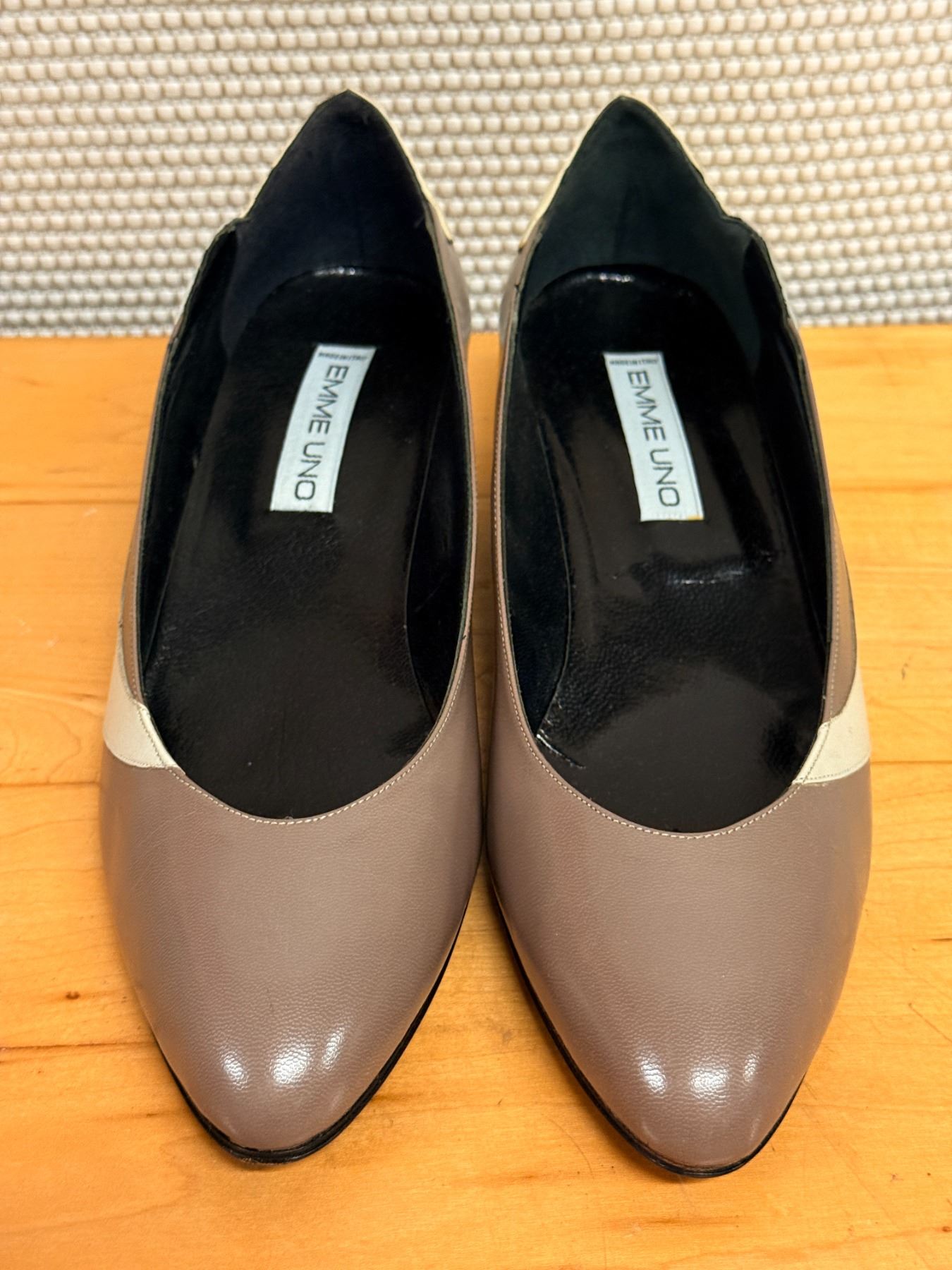 Vintage Emme Uno Italian-made pointed flats featuring taupe and cream leather paneling, sleek slip-on design, and a polished minimalist silhouette. Stylish, versatile, and lightweight. New and unworn, stored for years; heel requires repair due to storage wear.