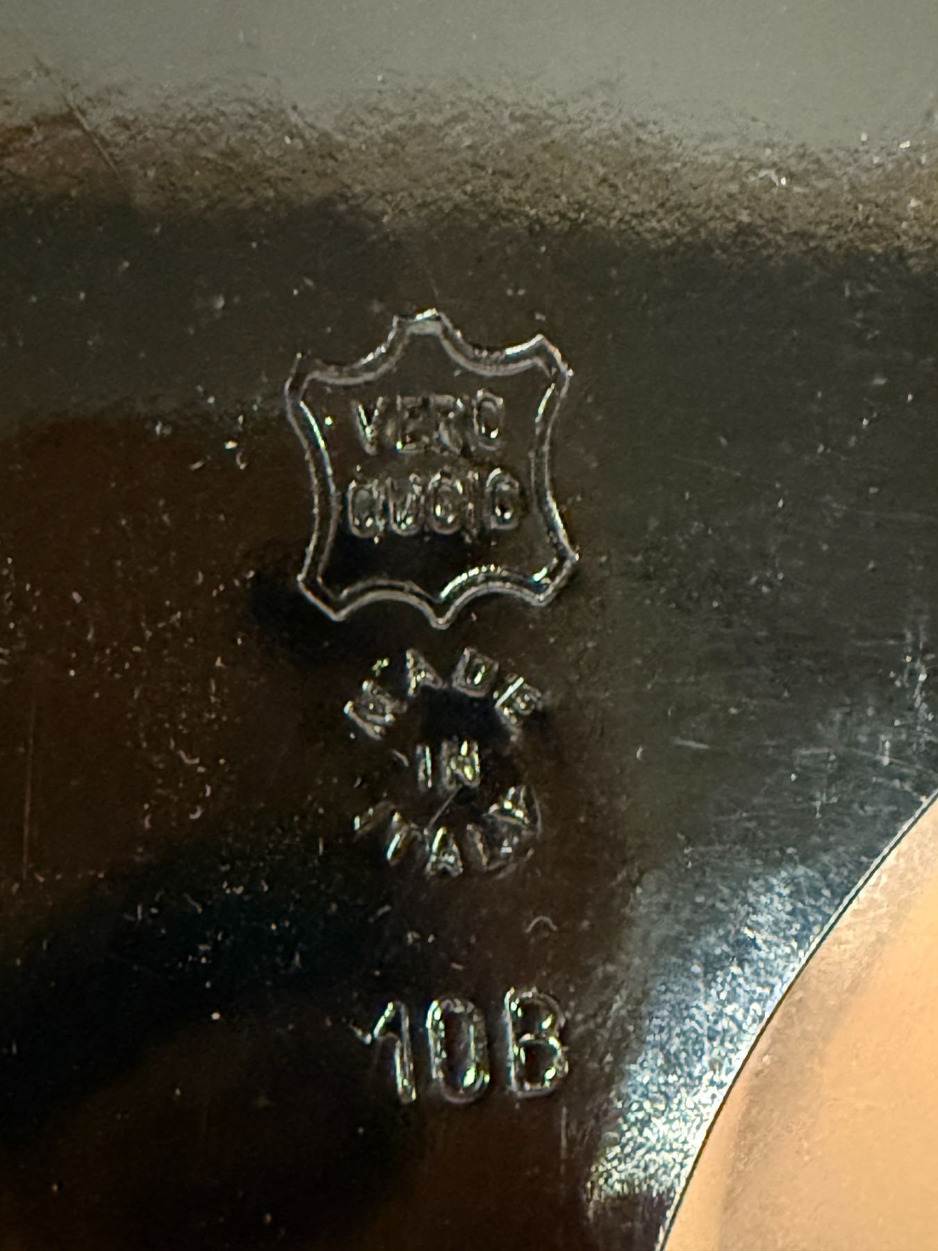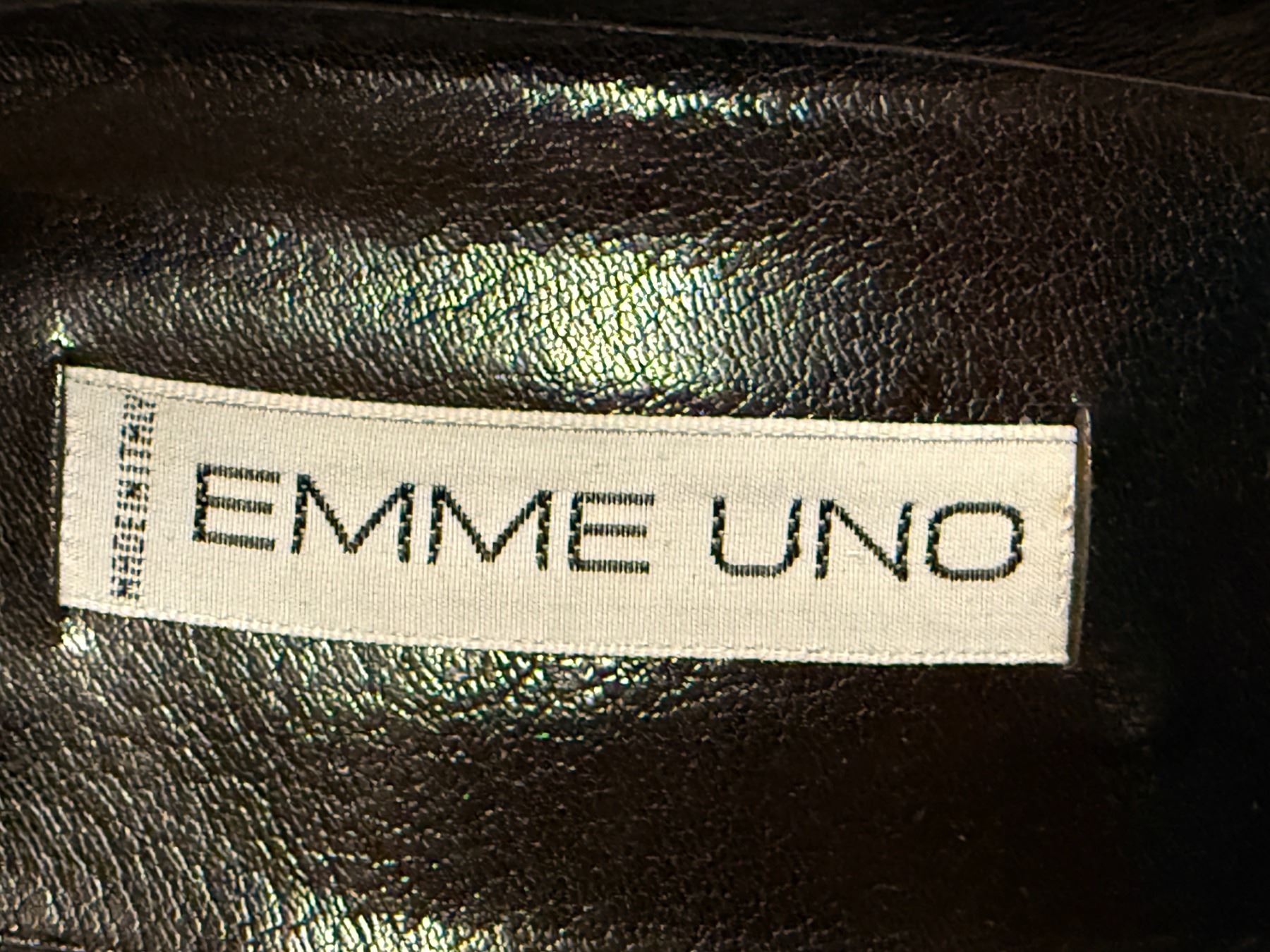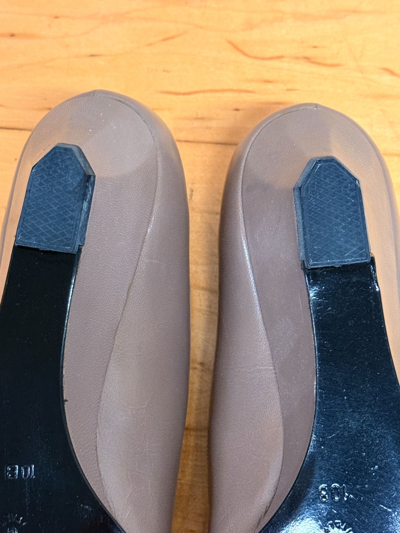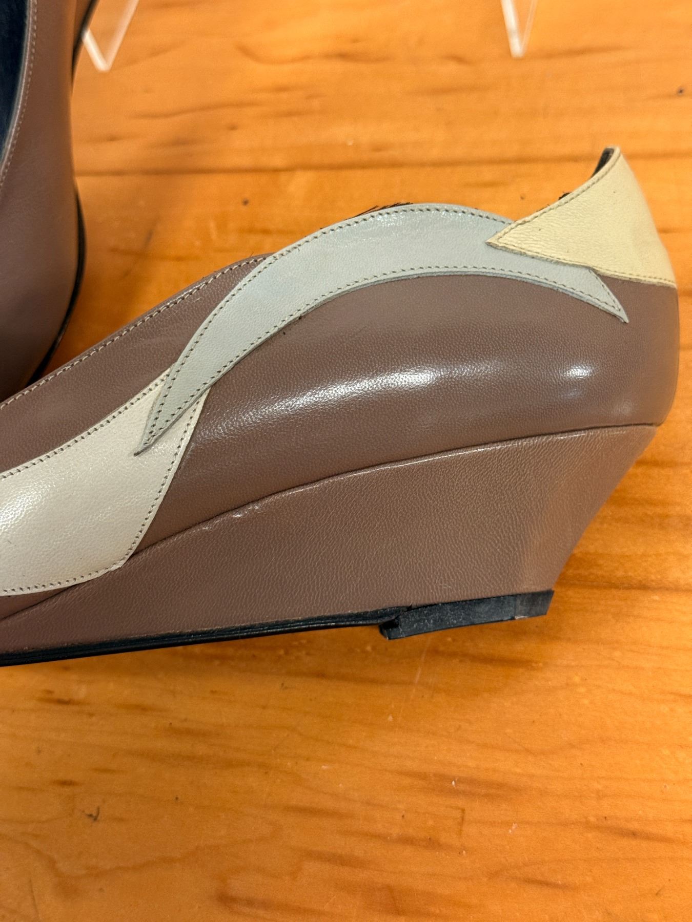 Vintage Emme Uno Italian-made pointed flats featuring taupe and cream leather paneling, sleek slip-on design, and a polished minimalist silhouette. Stylish, versatile, and lightweight. New and unworn, stored for years; heel requires repair due to storage wear.