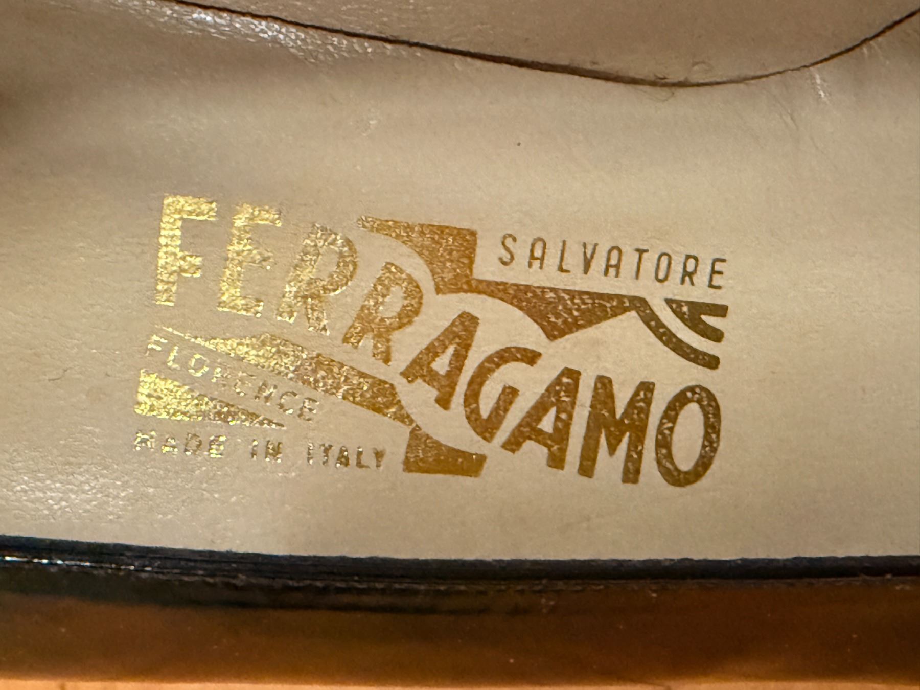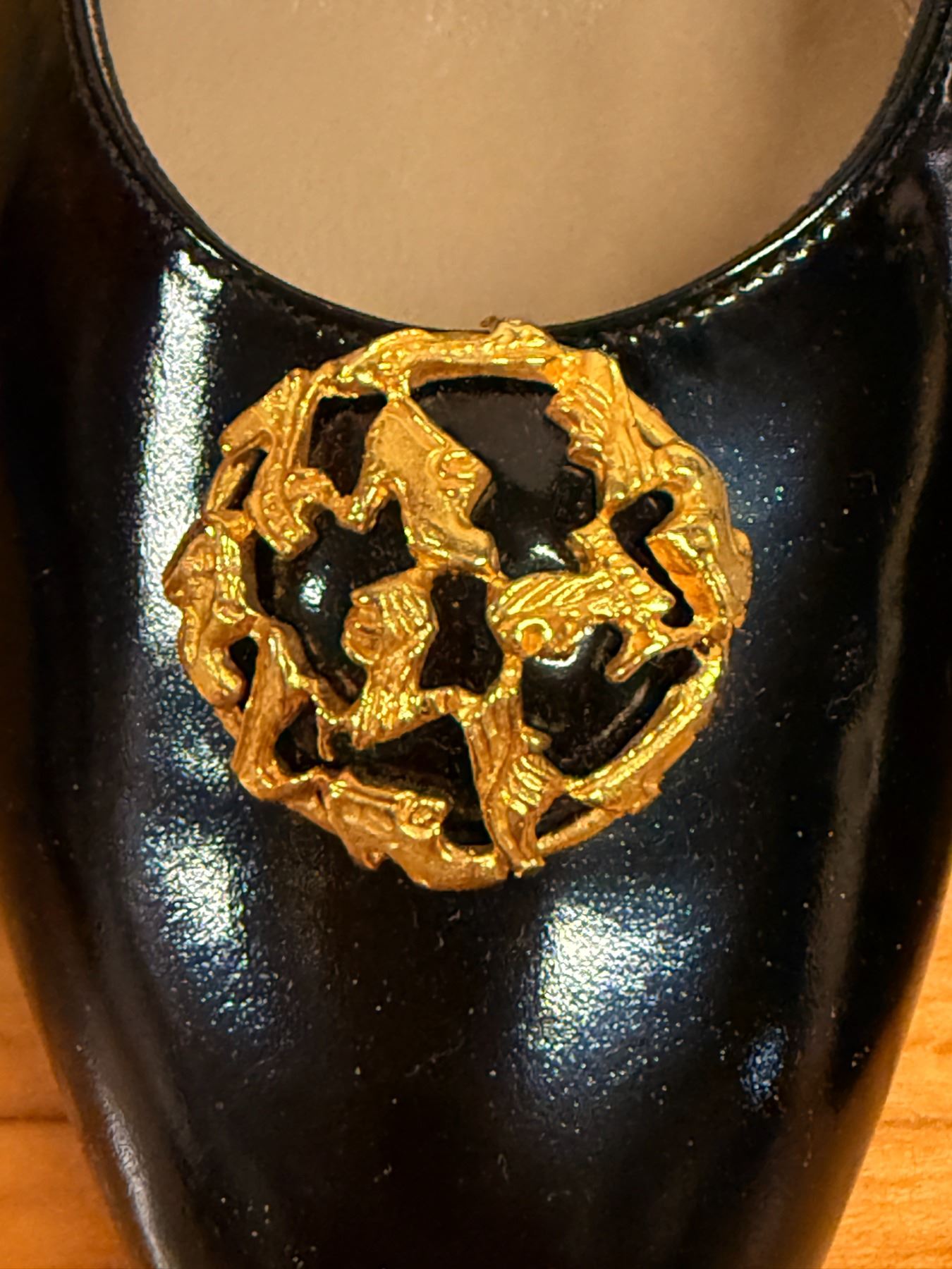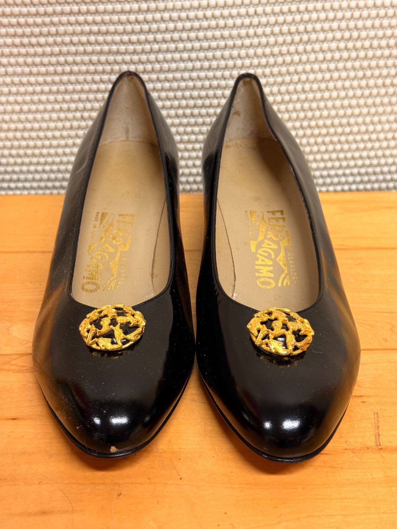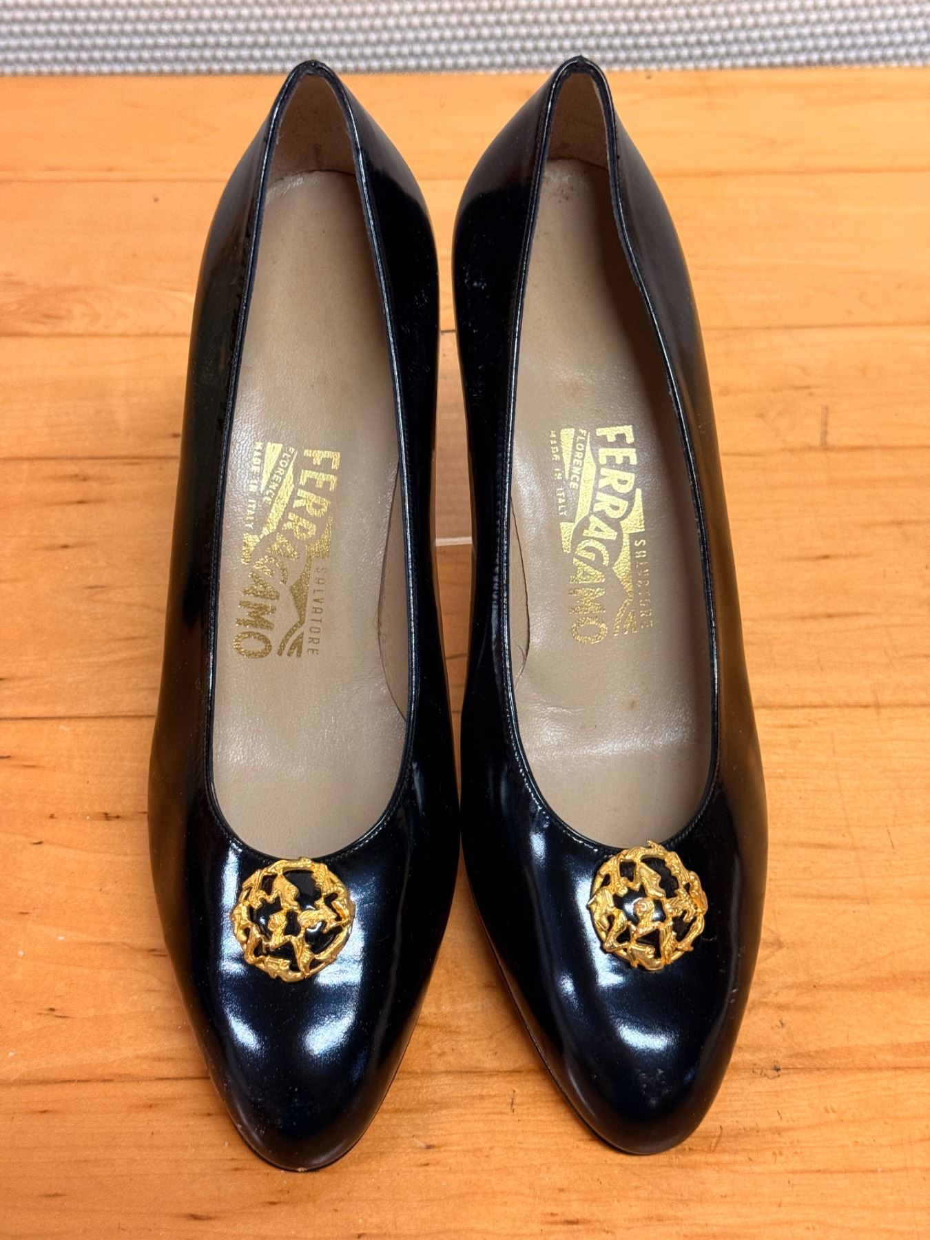 Vintage Salvatore Ferragamo black patent leather pumps featuring an elegant almond toe, glossy finish, and a textured gold-tone medallion accent. Classic Italian craftsmanship with timeless style. New and unworn, stored for years; heel requires repair due to storage wear.