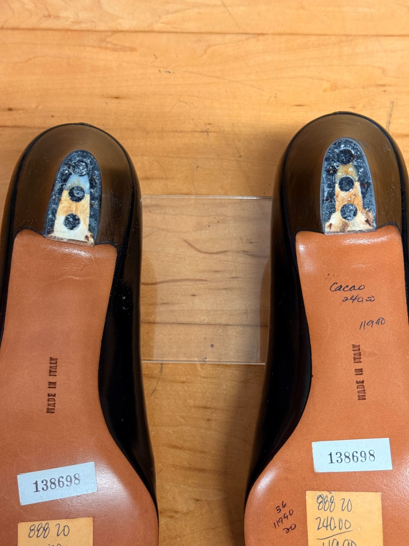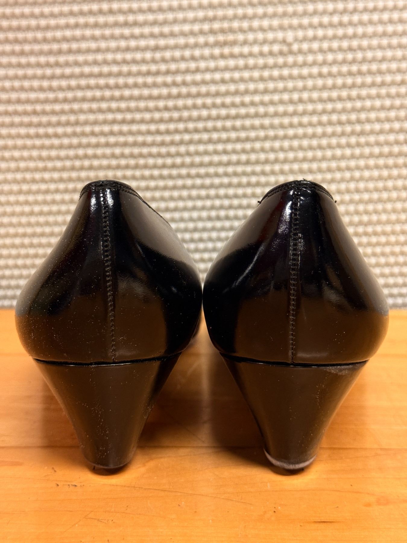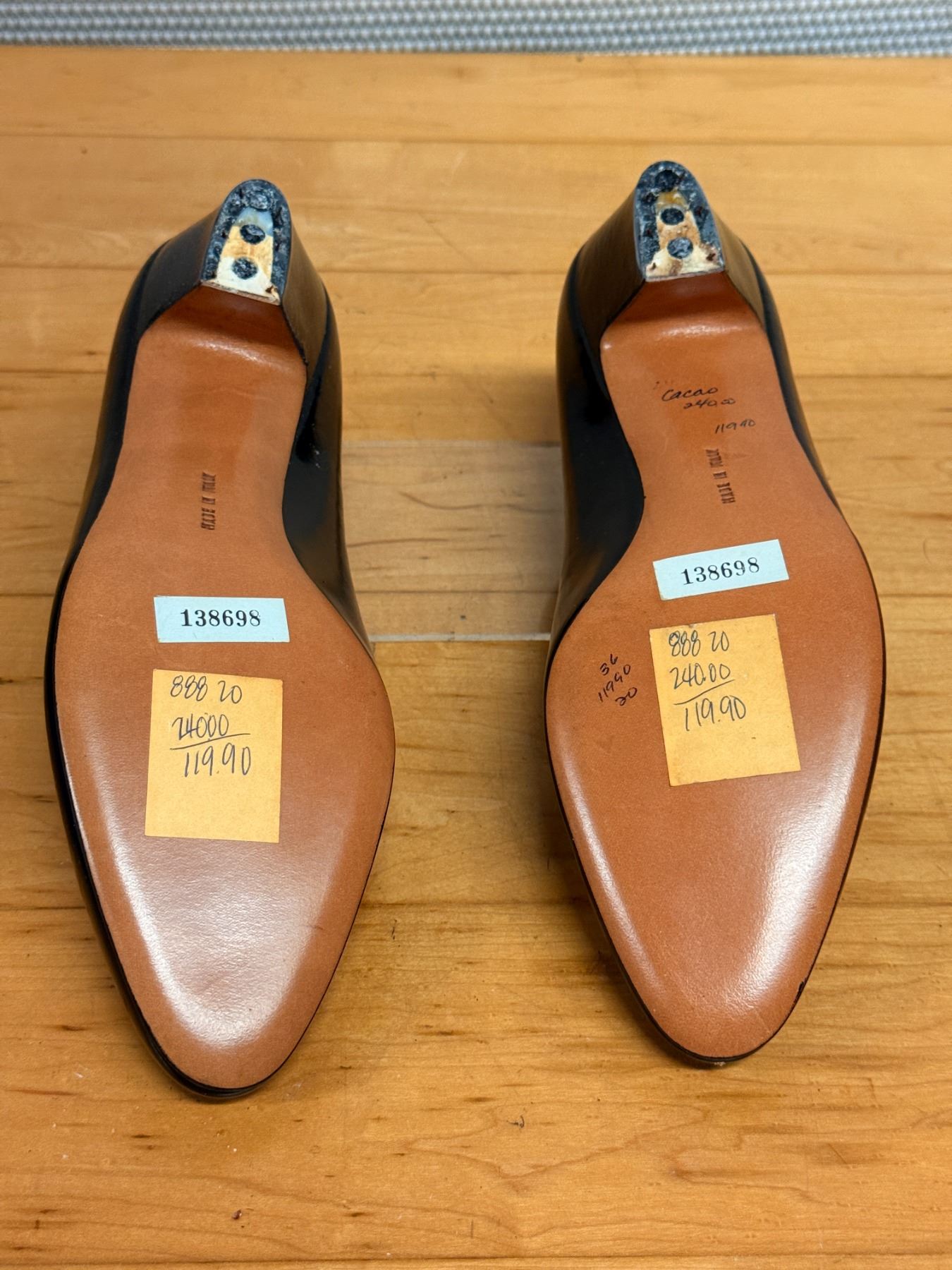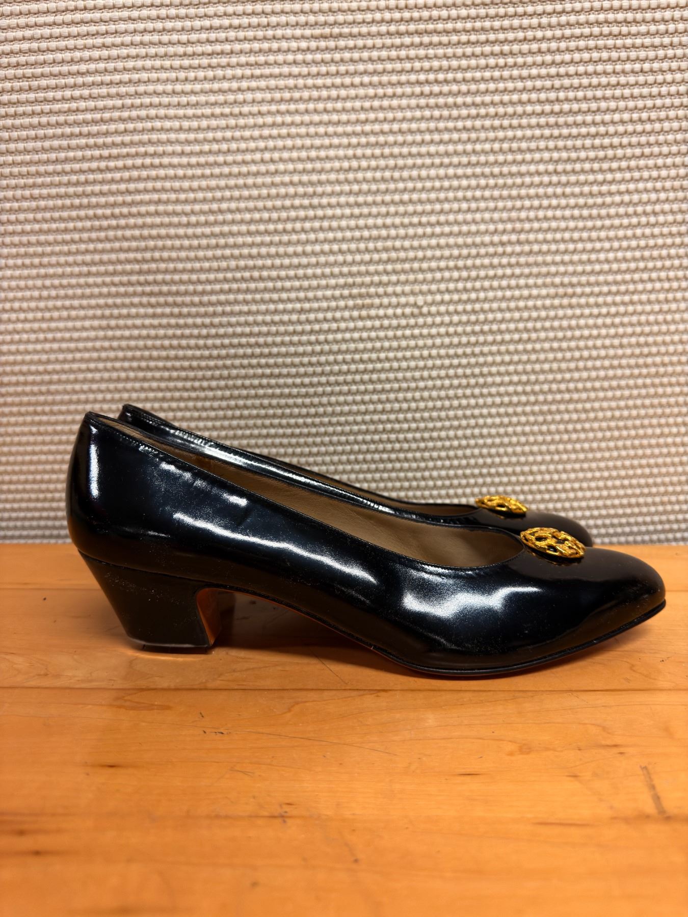 Vintage Salvatore Ferragamo black patent leather pumps featuring an elegant almond toe, glossy finish, and a textured gold-tone medallion accent. Classic Italian craftsmanship with timeless style. New and unworn, stored for years; heel requires repair due to storage wear.