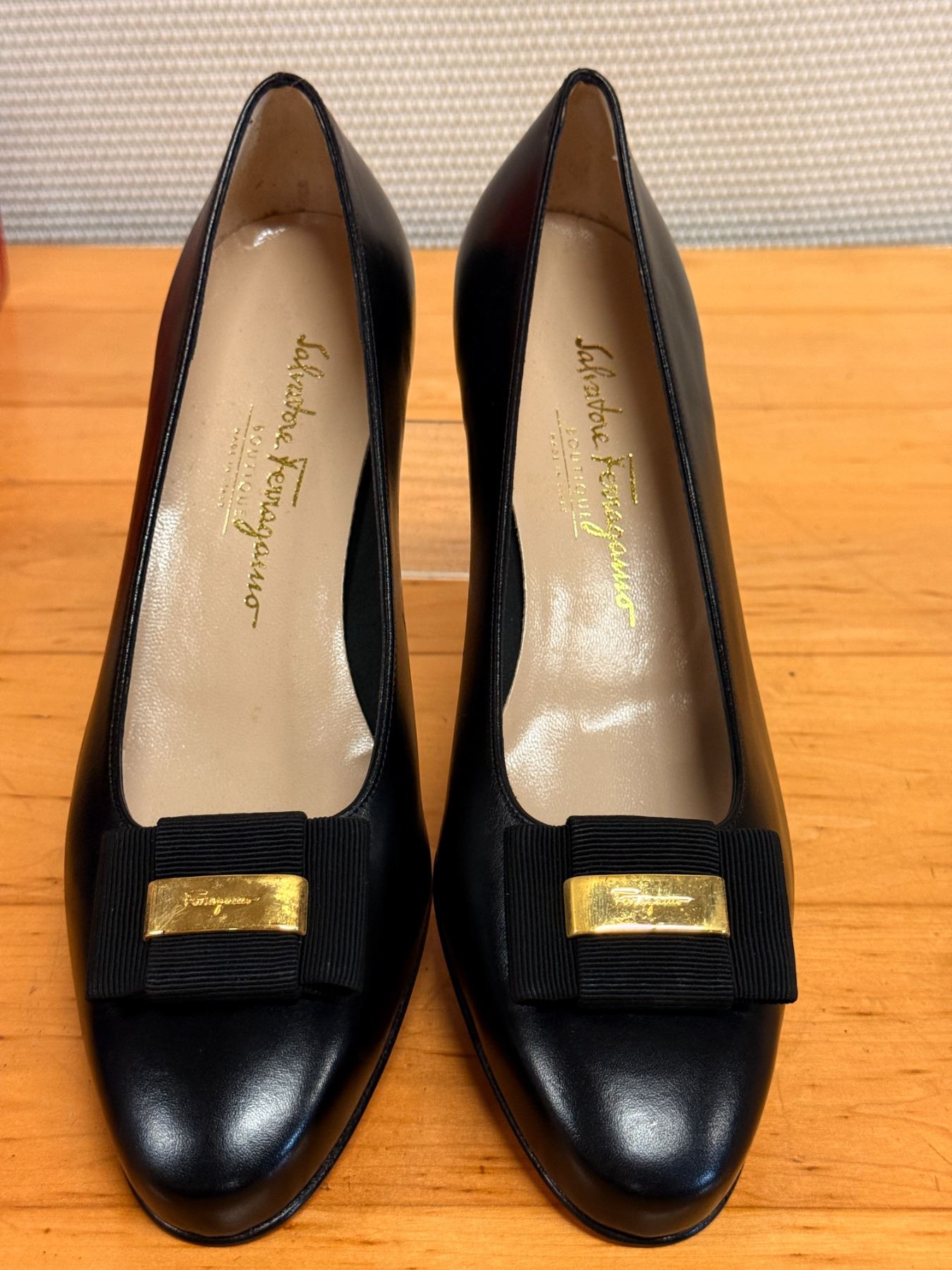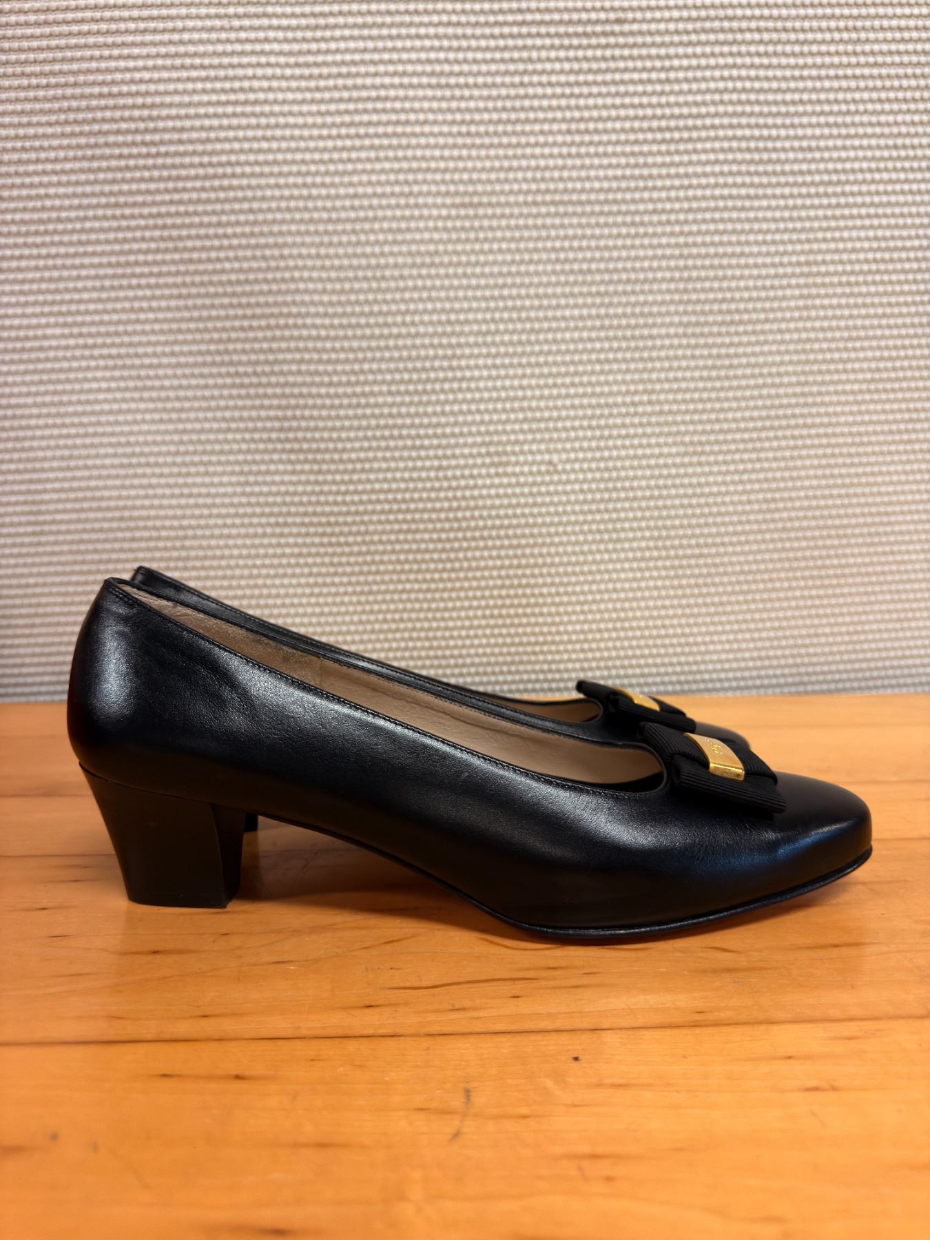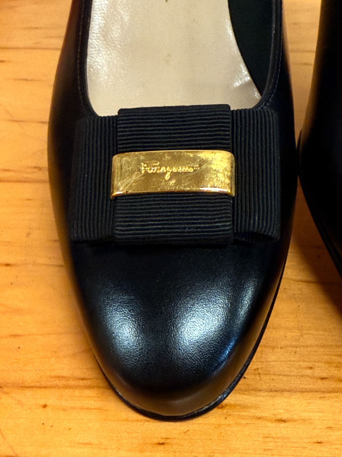Signature Salvatore Ferragamo Vara pumps in smooth black leather with classic grosgrain bows and gold logo hardware. Timeless, elegant, and crafted in Italy. New and unworn, stored for years; heels have some signs of compromise due to storage wear.