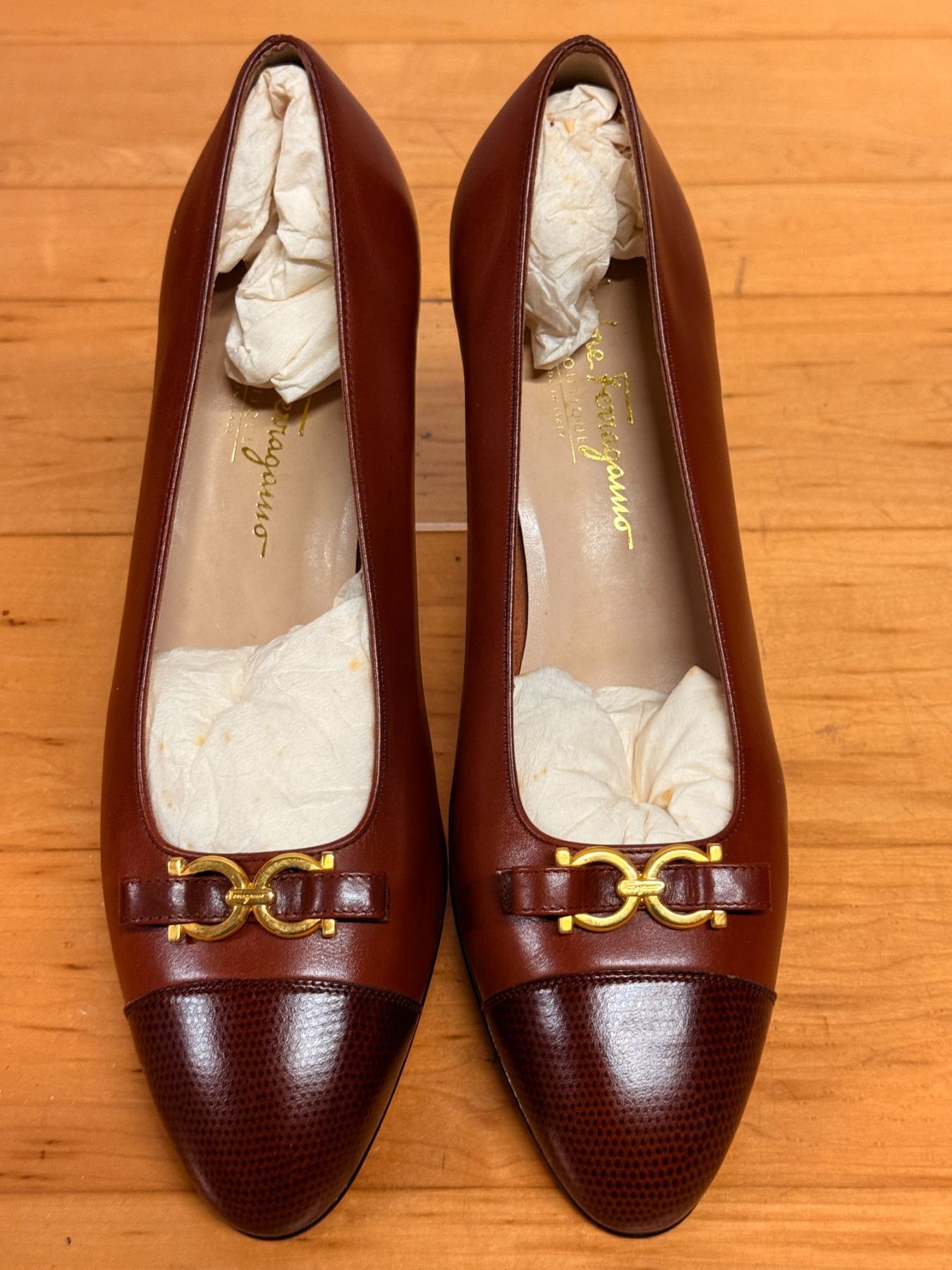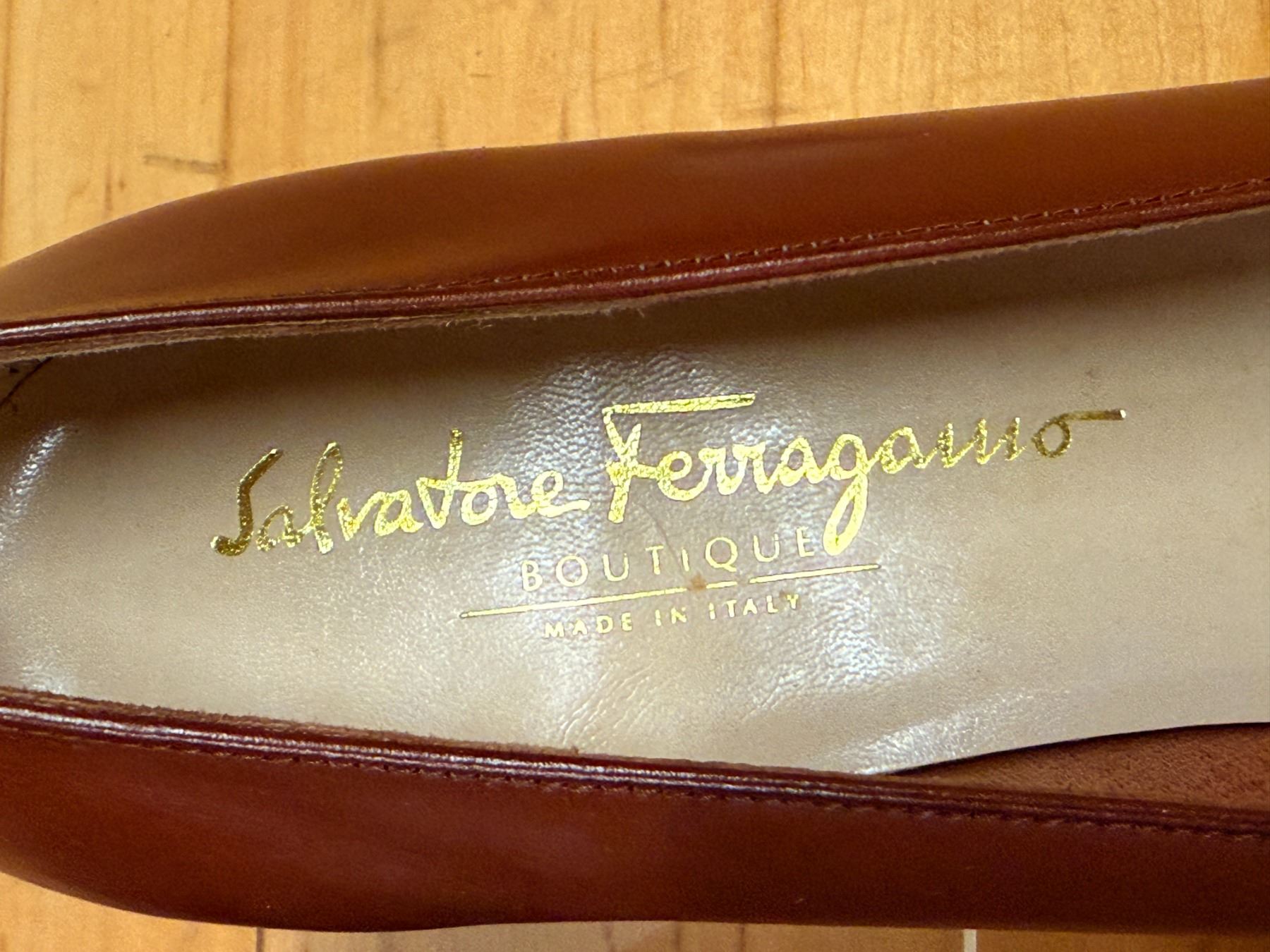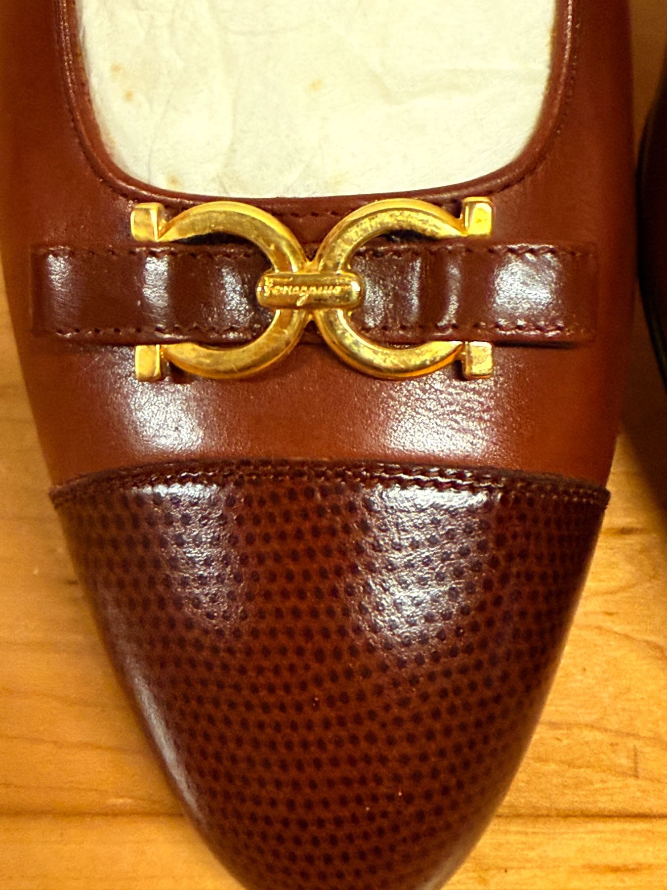 Vintage Salvatore Ferragamo brown leather flats featuring a textured cap toe, gold Gancini hardware, and classic Italian craftsmanship. Elegant, comfortable, and beautifully preserved. New and unworn, stored for years; heel requires repair due to storage wear.