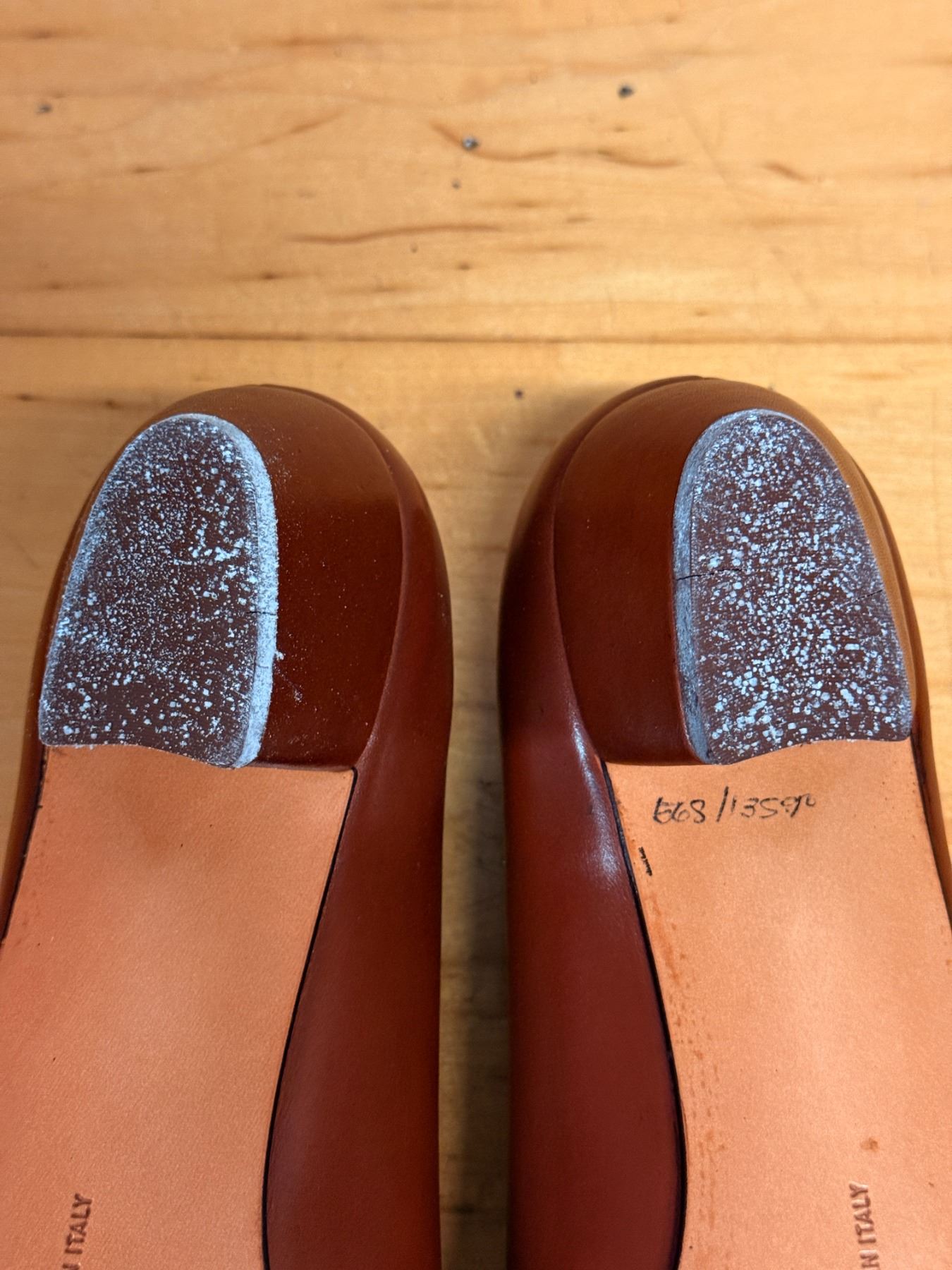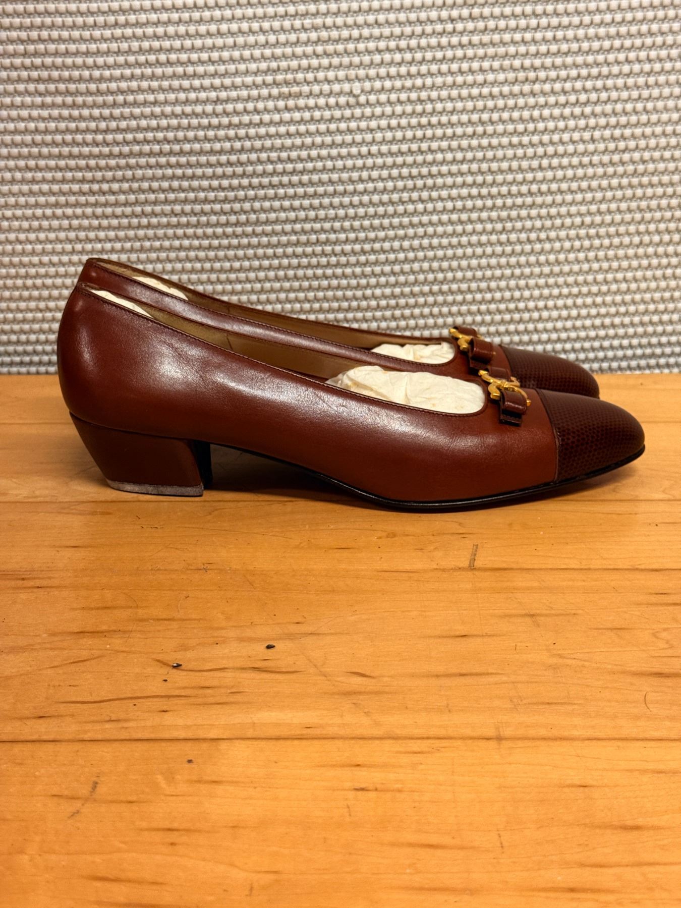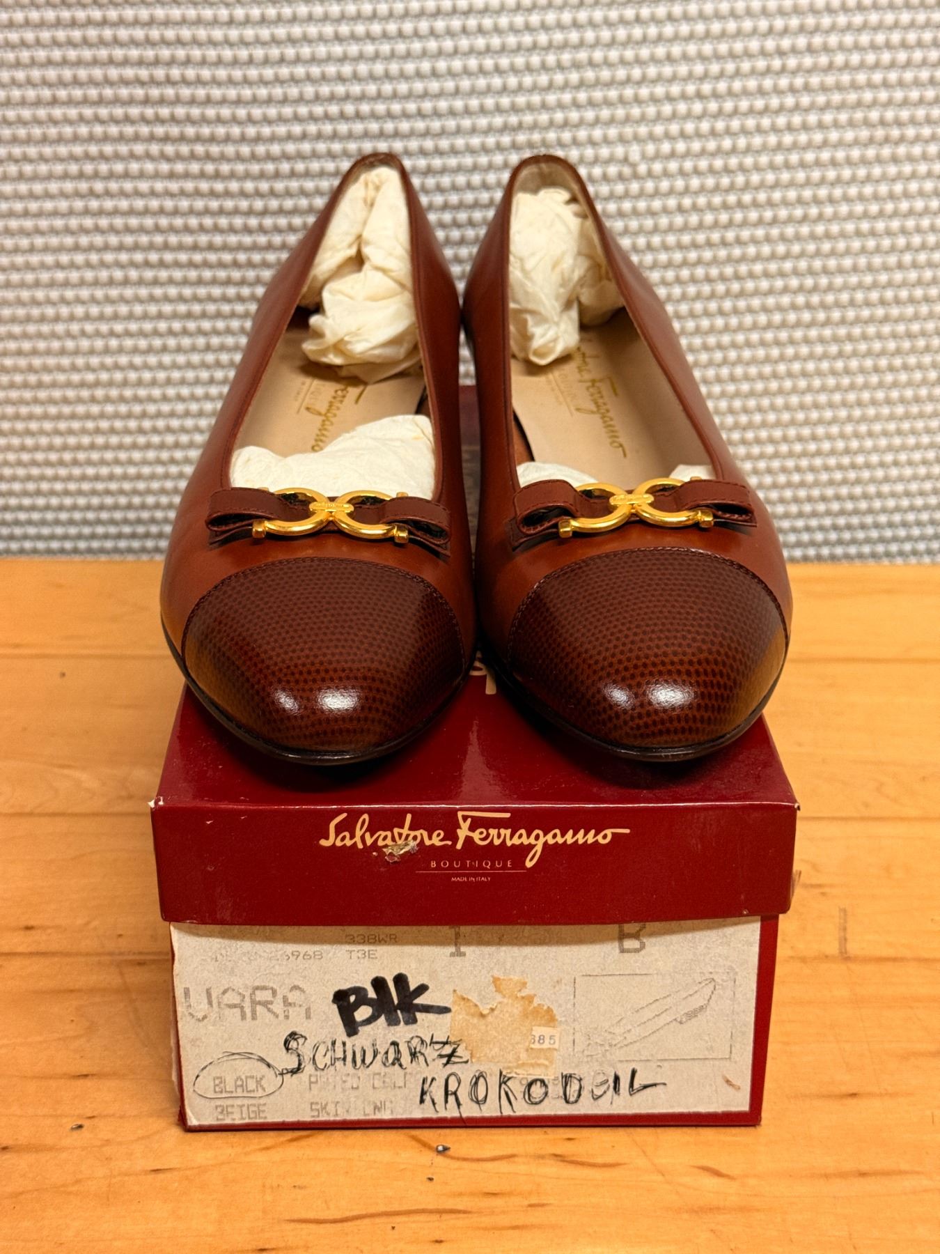 Vintage Salvatore Ferragamo brown leather flats featuring a textured cap toe, gold Gancini hardware, and classic Italian craftsmanship. Elegant, comfortable, and beautifully preserved. New and unworn, stored for years; heel requires repair due to storage wear.