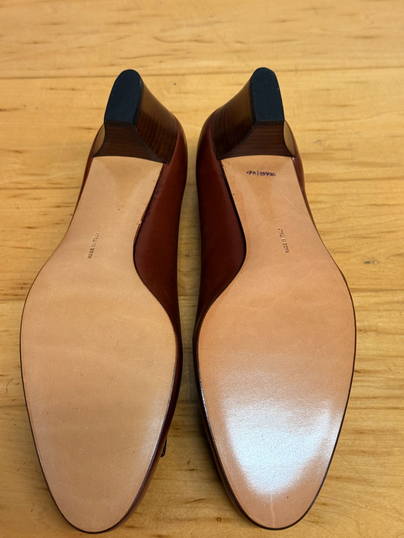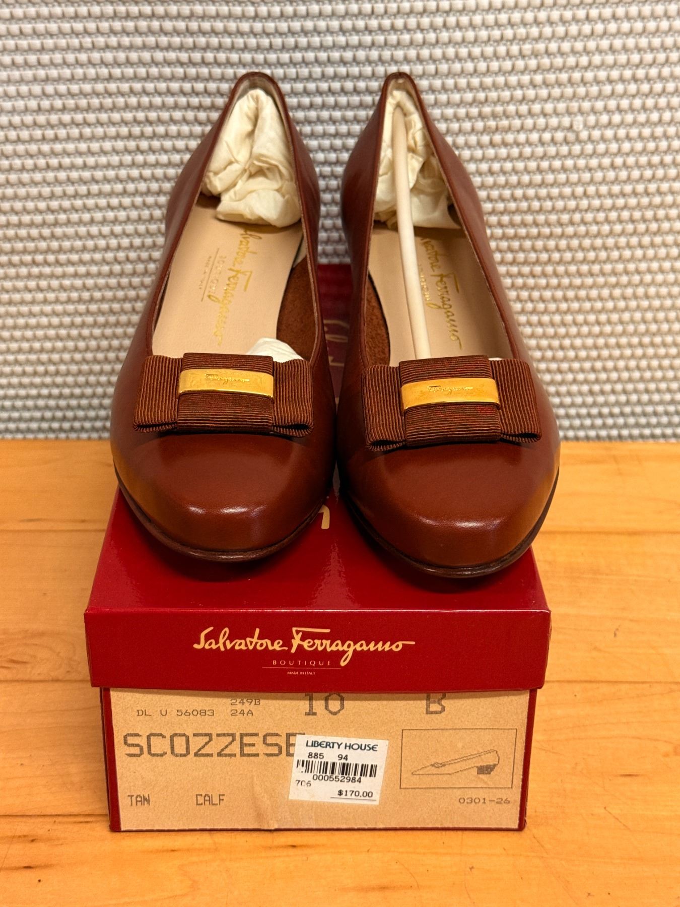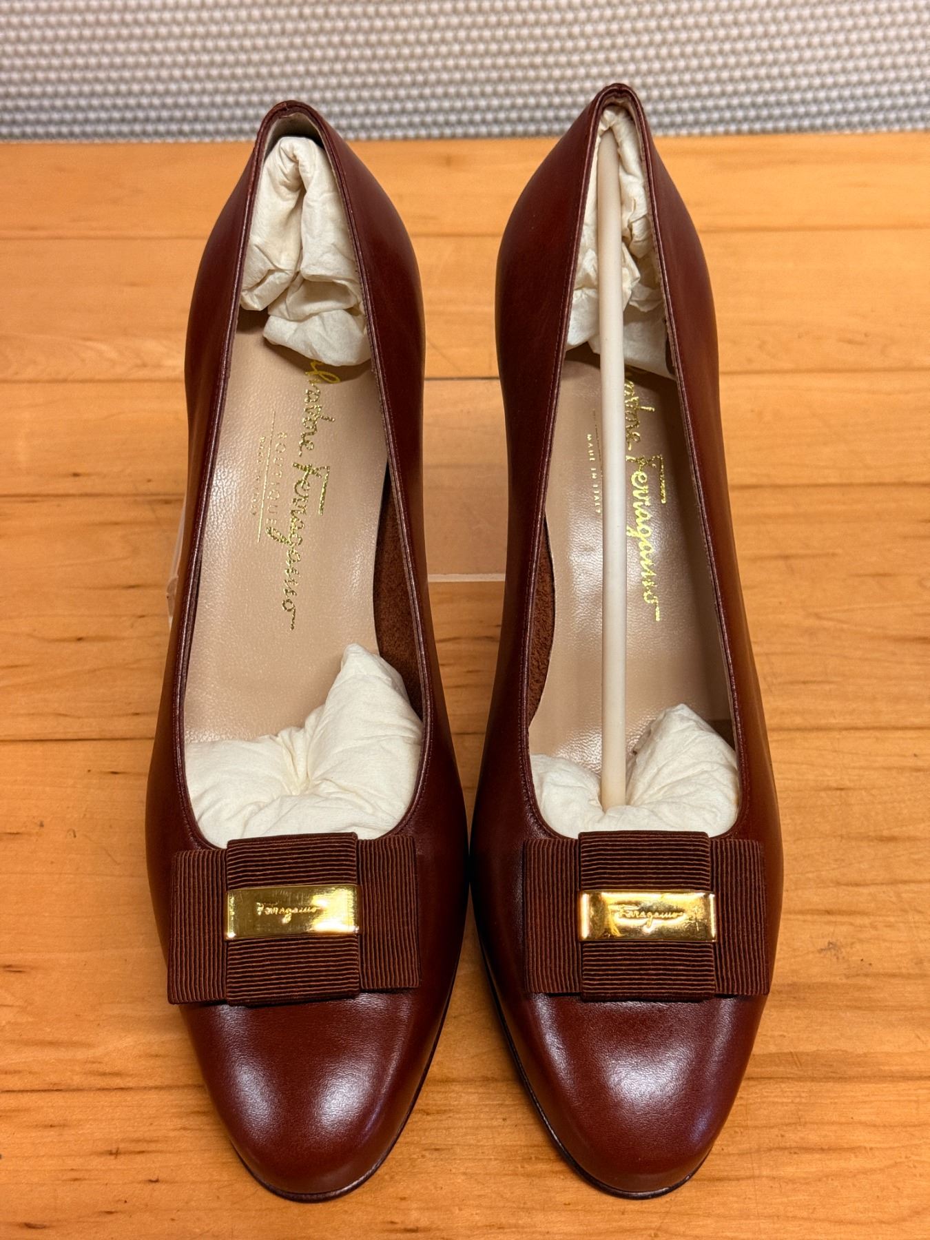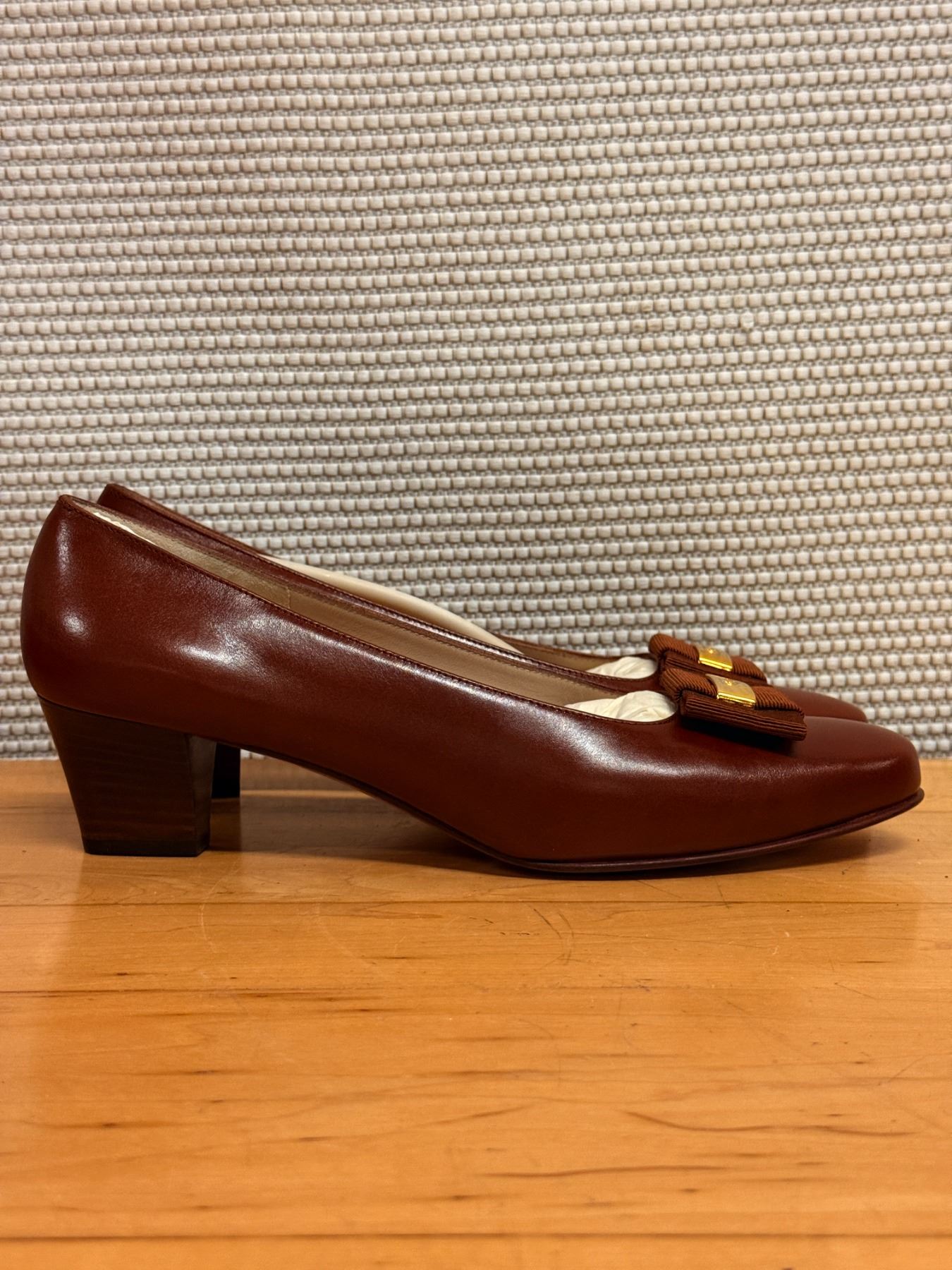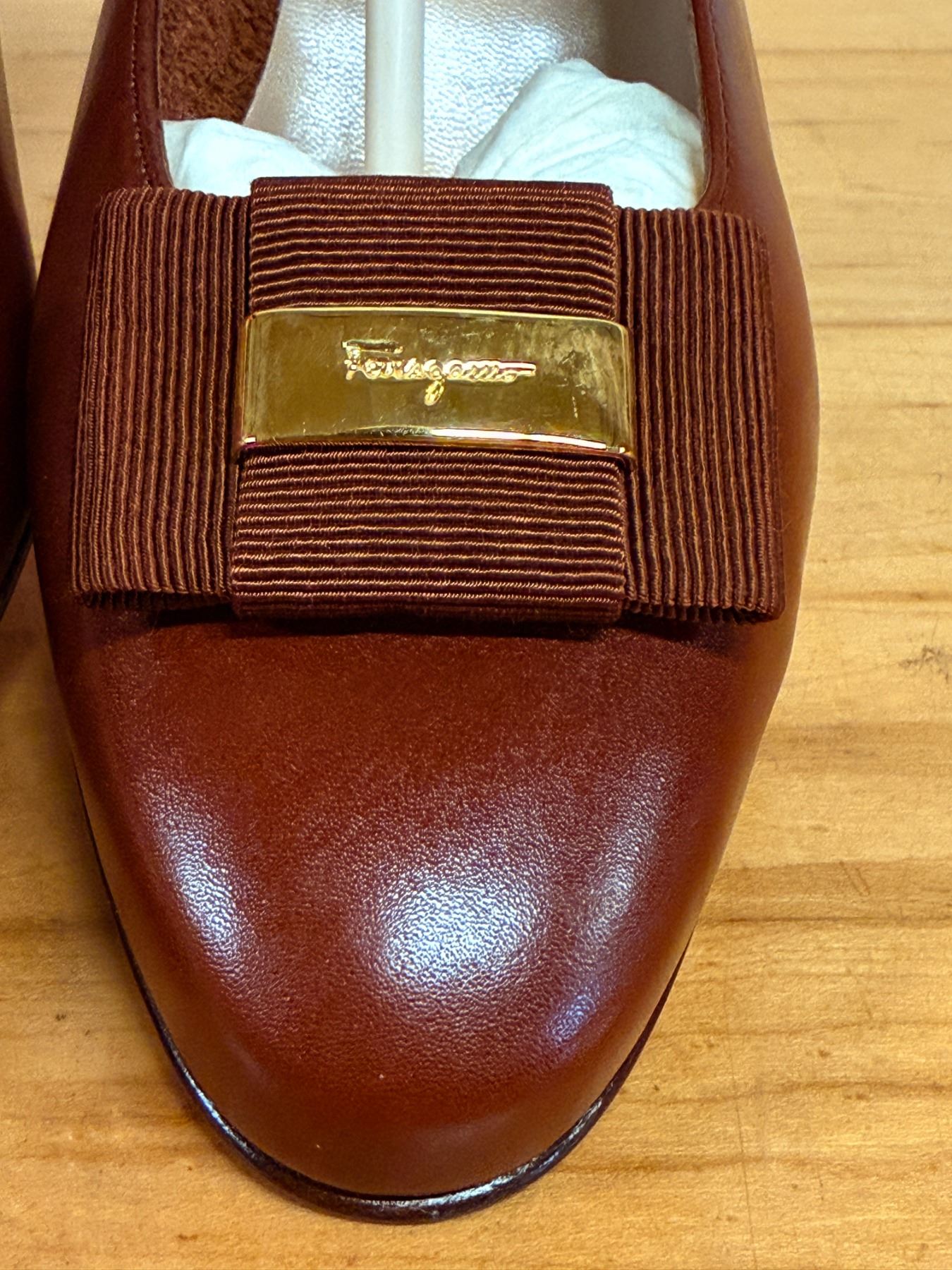 Vintage Salvatore Ferragamo brown leather Vara pumps featuring grosgrain bows, gold Vara hardware, and classic Italian craftsmanship. Elegant, timeless, and beautifully made. New and unworn, stored for years; heel requires repair due to storage wear.