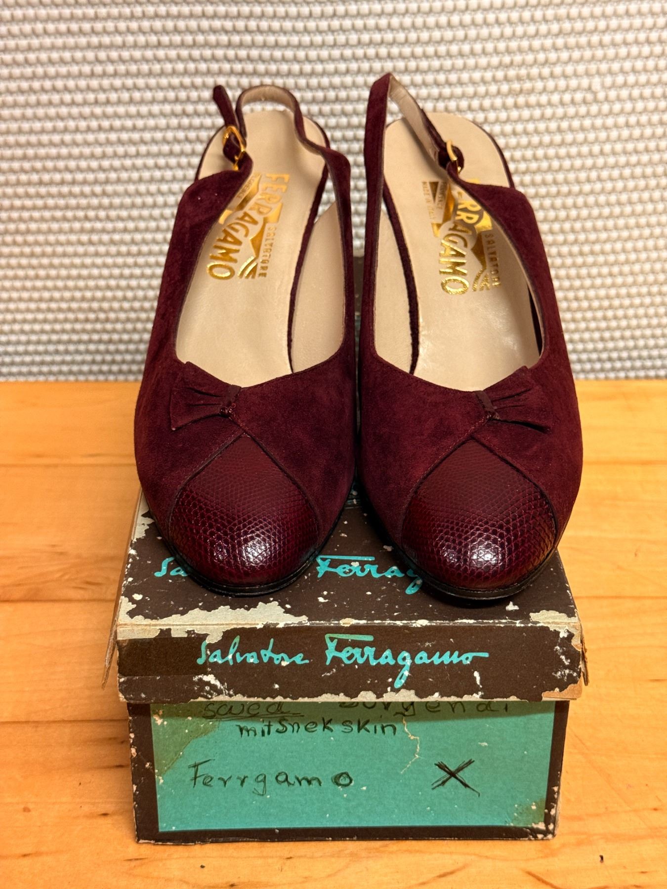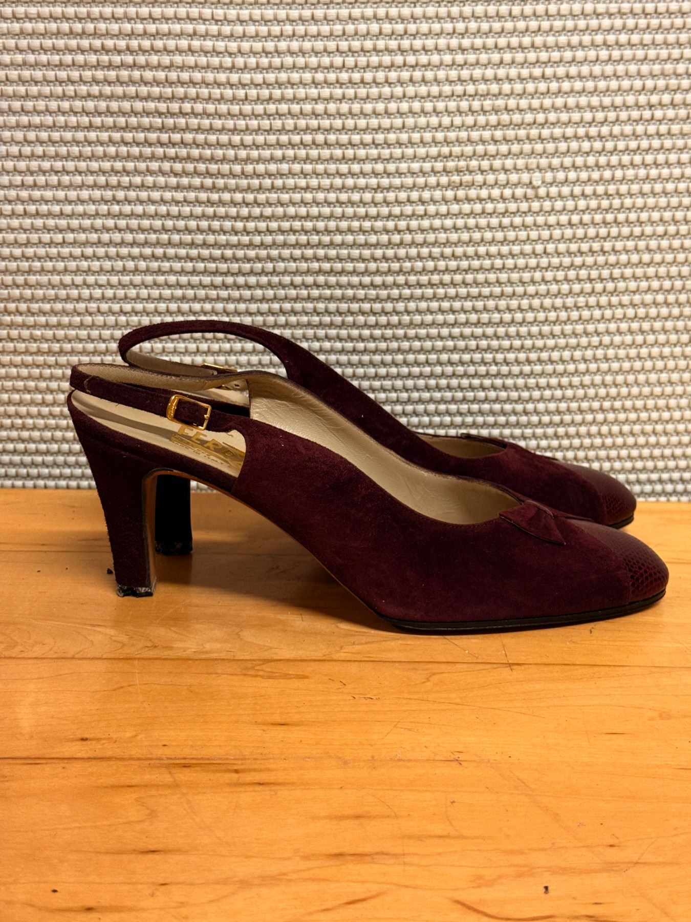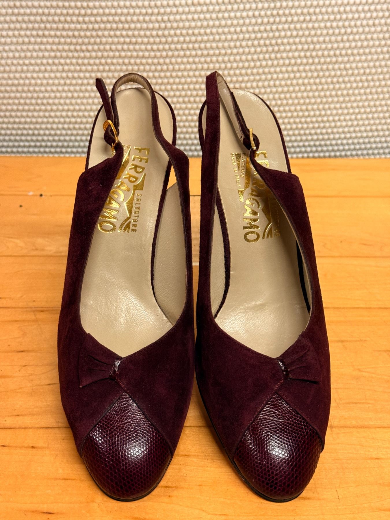 Vintage Salvatore Ferragamo burgundy suede slingback pumps with textured leather cap toes, petite bow accents, and elegant Italian craftsmanship. Rich color, classic design, and beautifully made. New and unworn, stored for years; heel requires repair due to storage wear.
