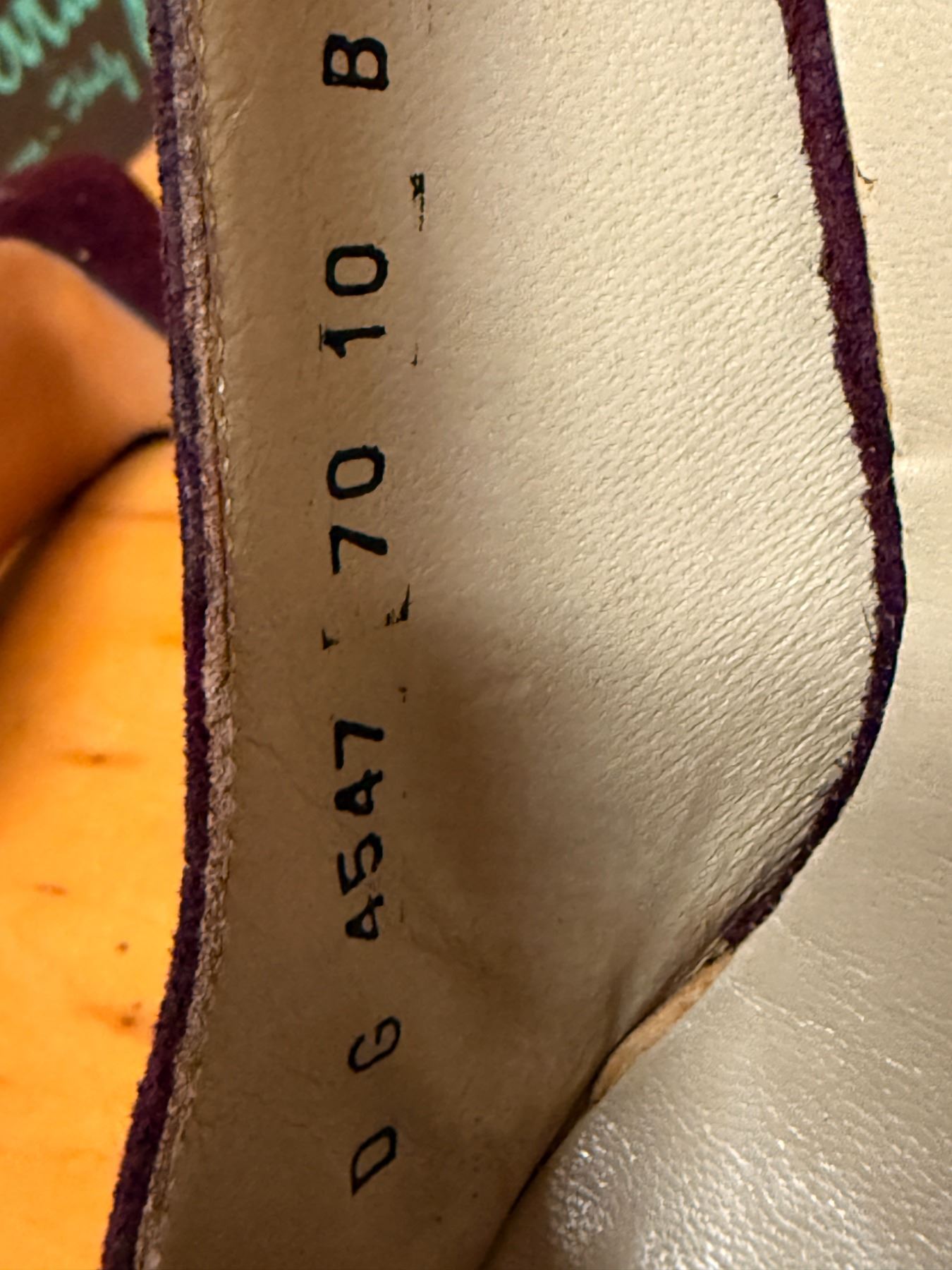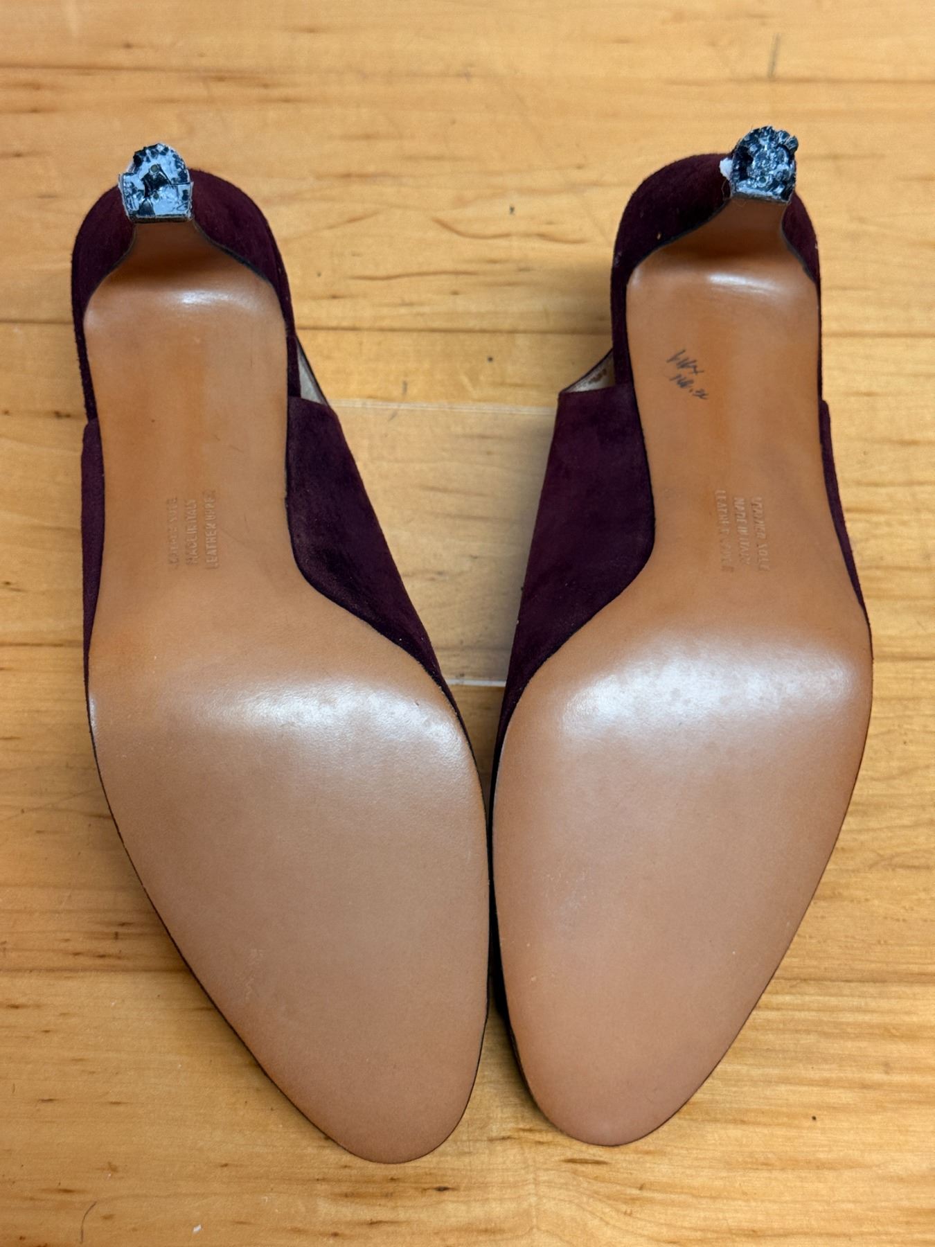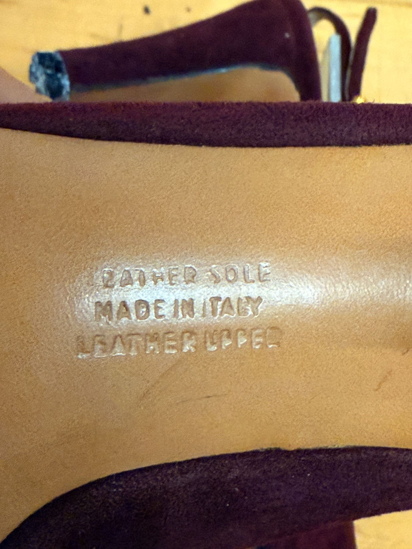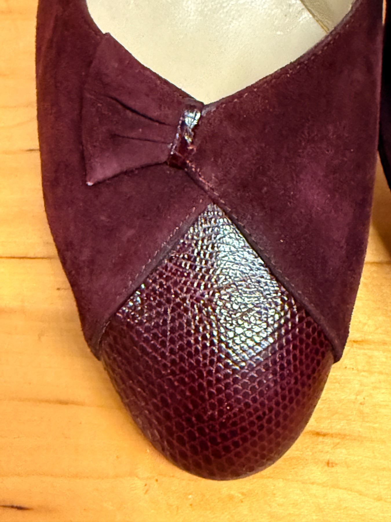 Vintage Salvatore Ferragamo burgundy suede slingback pumps with textured leather cap toes, petite bow accents, and elegant Italian craftsmanship. Rich color, classic design, and beautifully made. New and unworn, stored for years; heel requires repair due to storage wear.