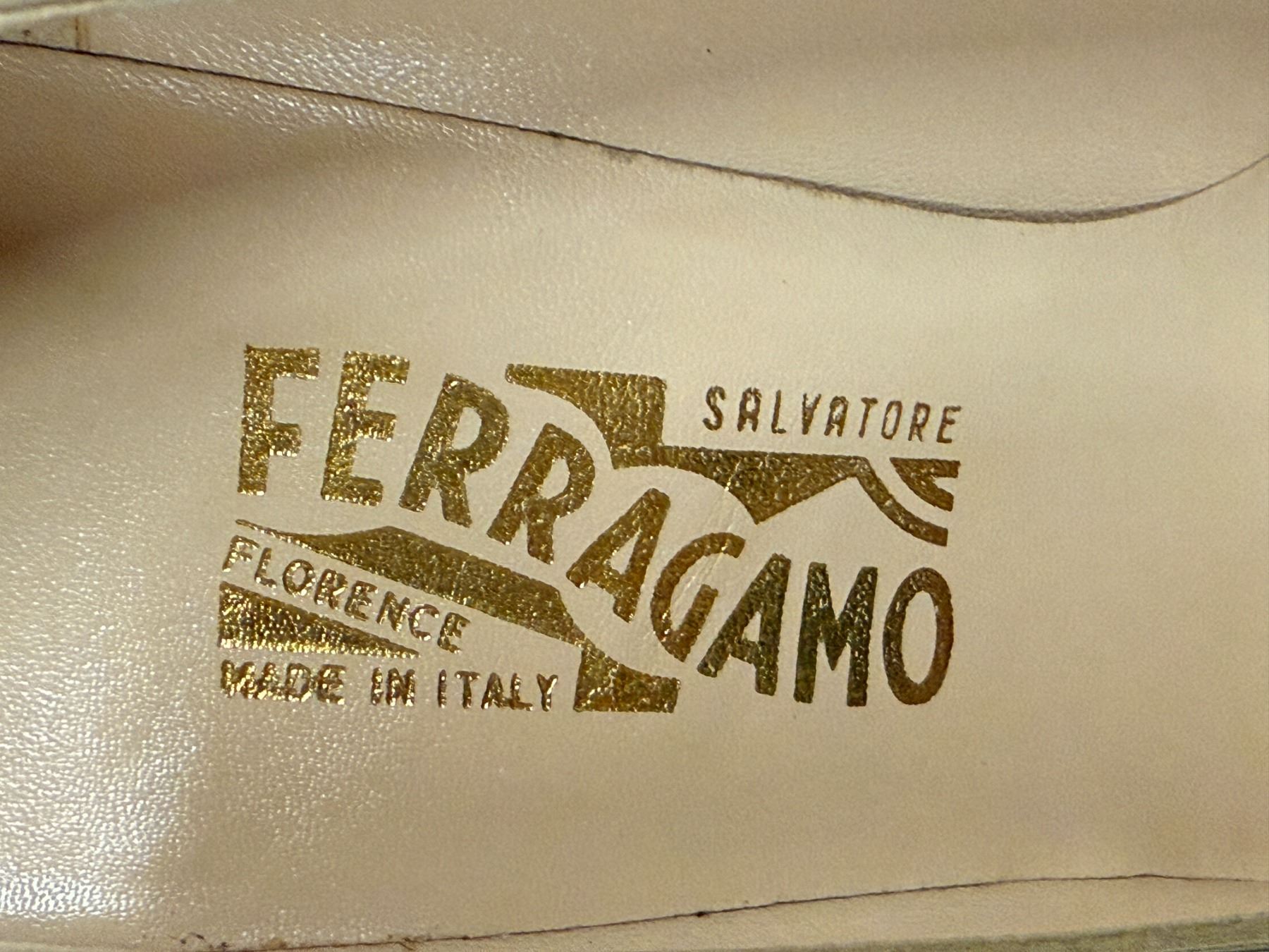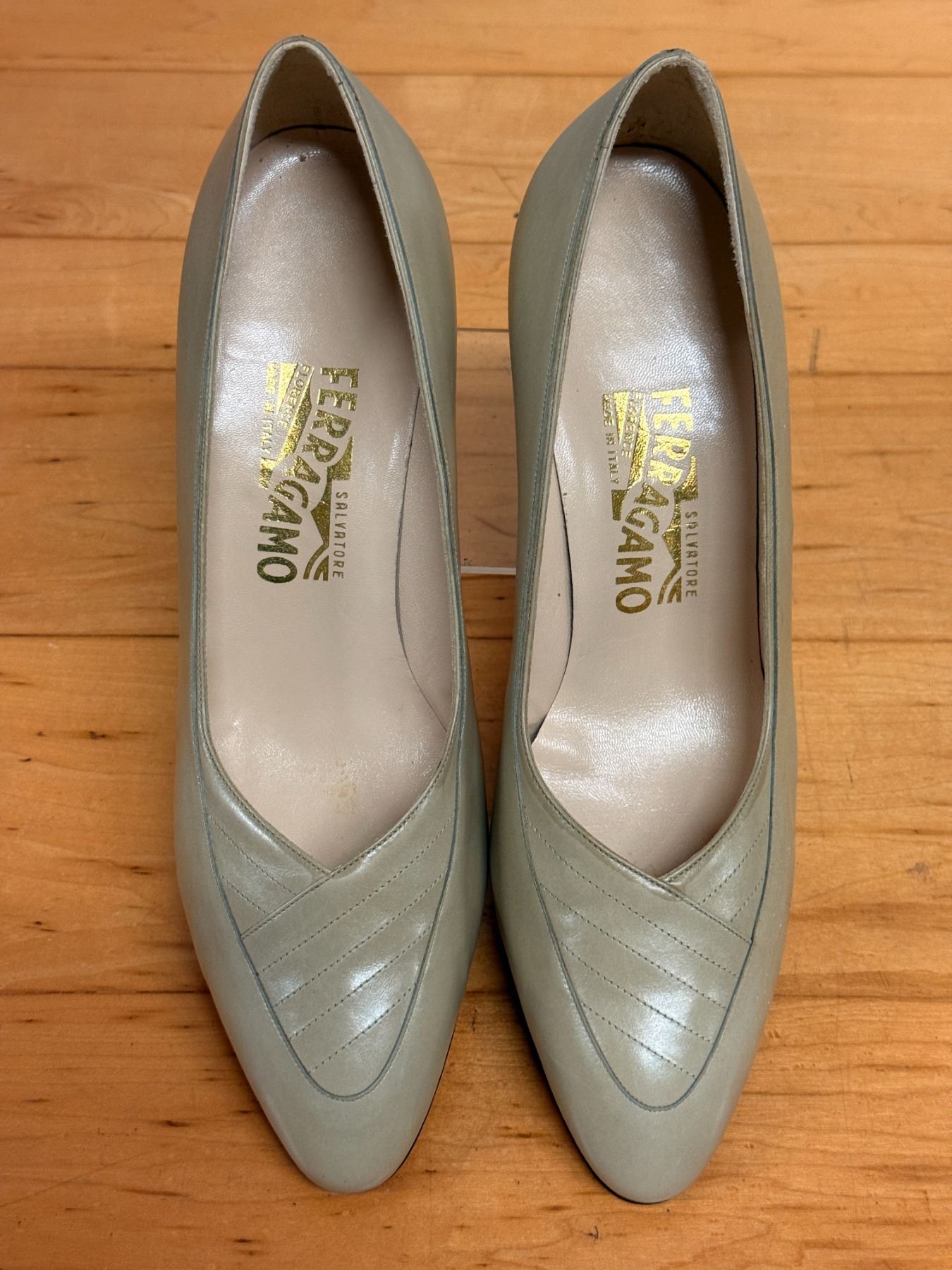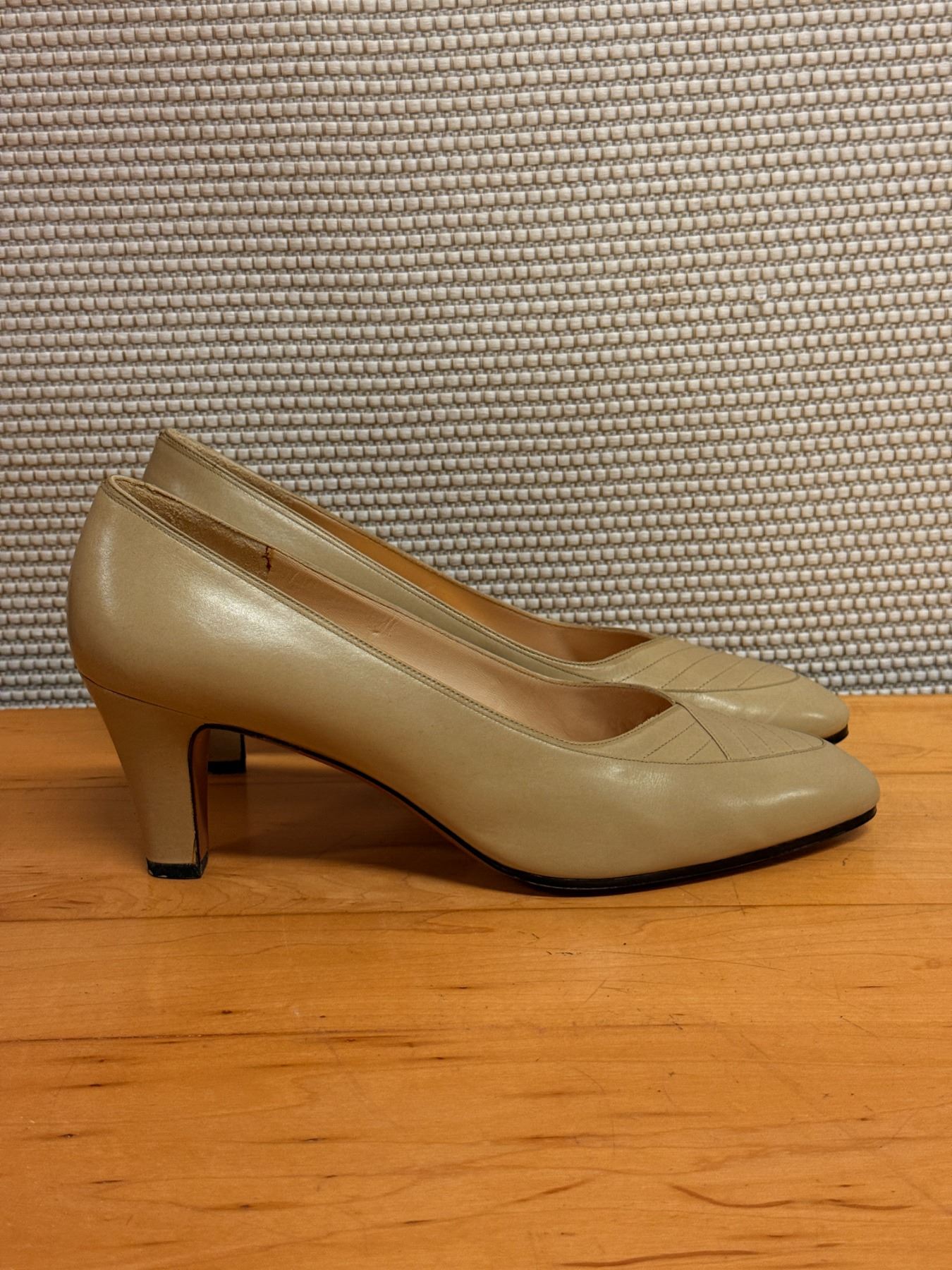 Vintage Salvatore Ferragamo cream leather almond-toe pumps featuring stitched detailing, smooth leather uppers, and classic Italian craftsmanship. Elegant, versatile, and timeless. New and unworn, stored for years; heel requires repair due to storage wear.