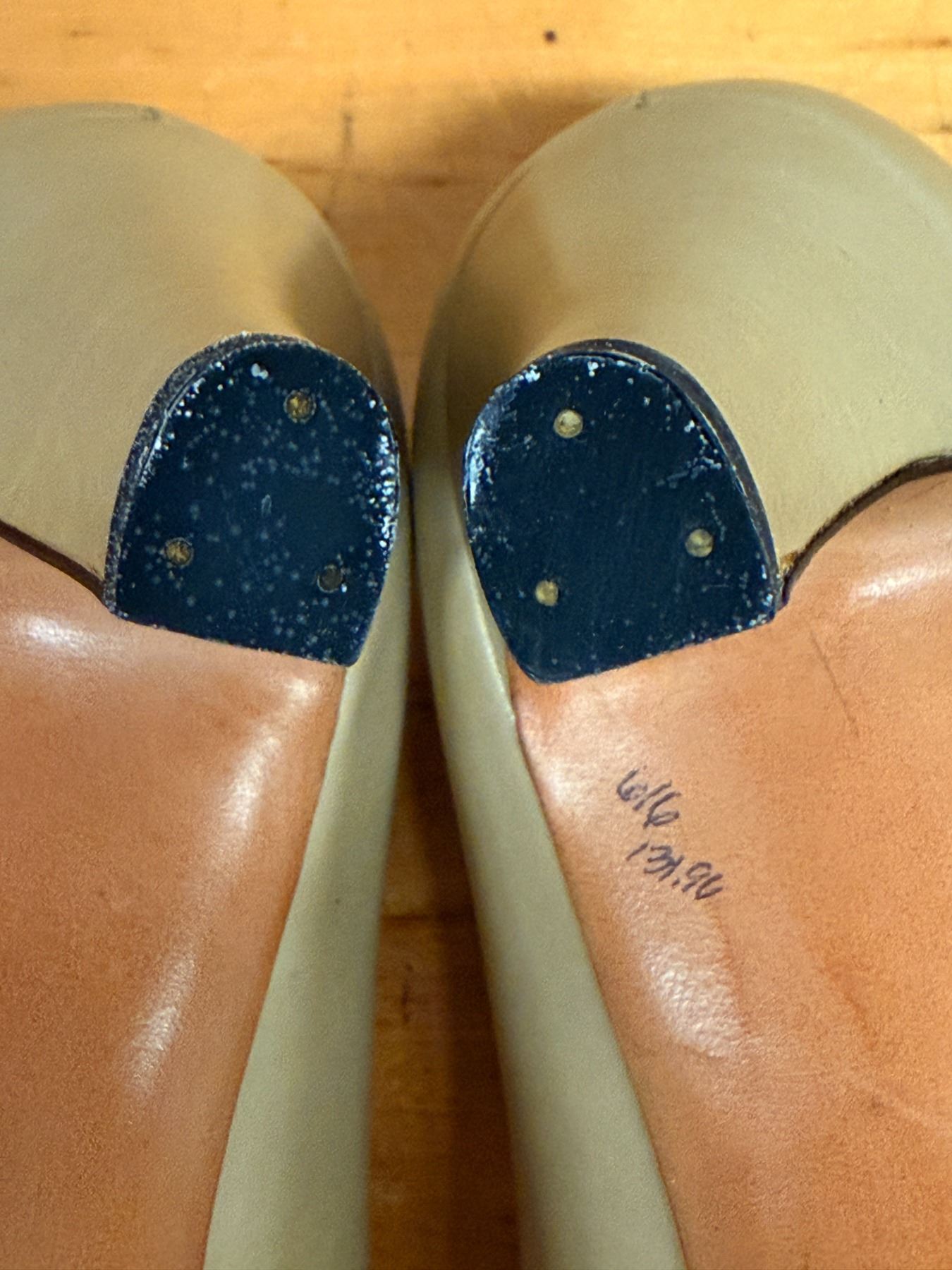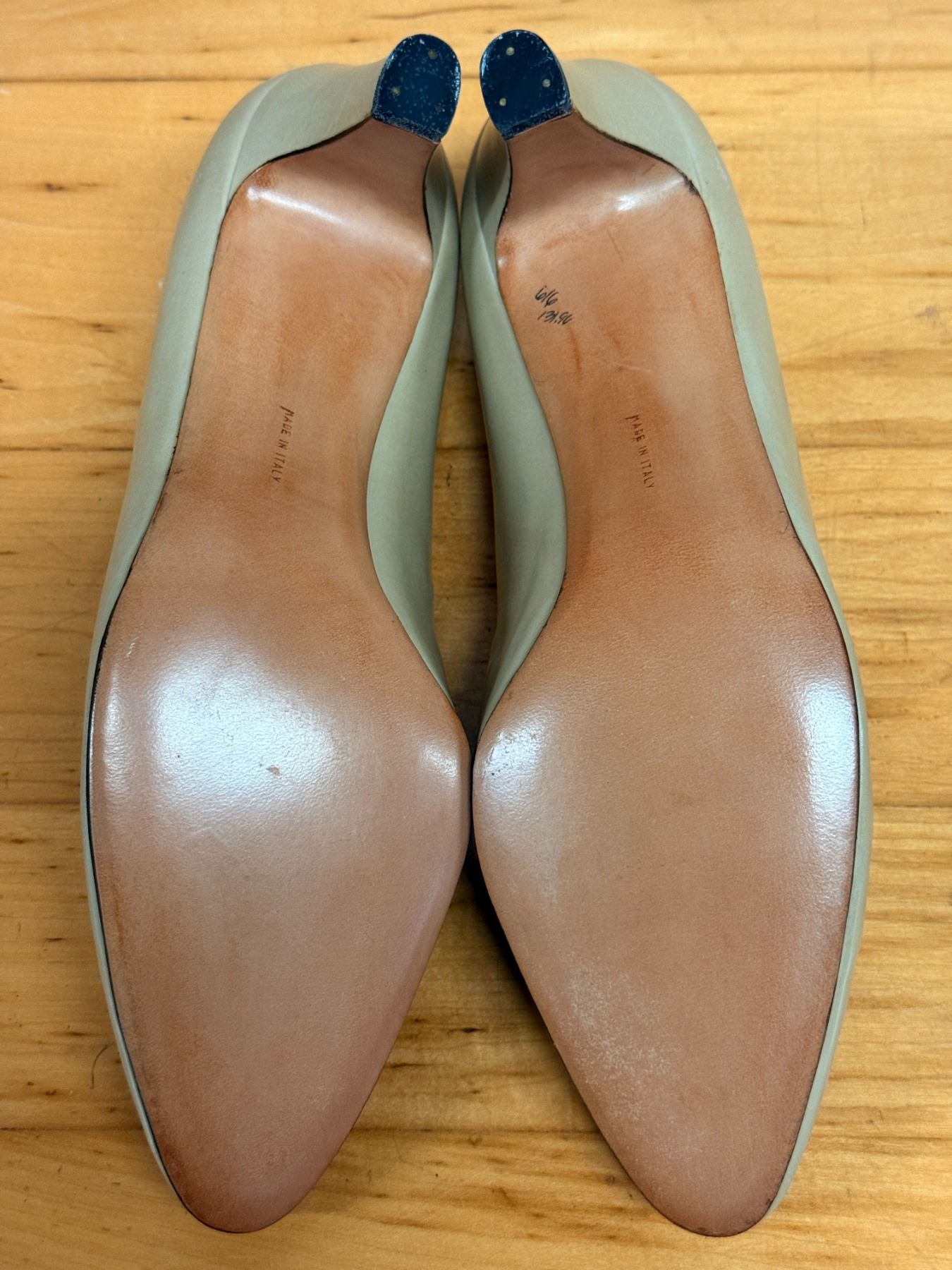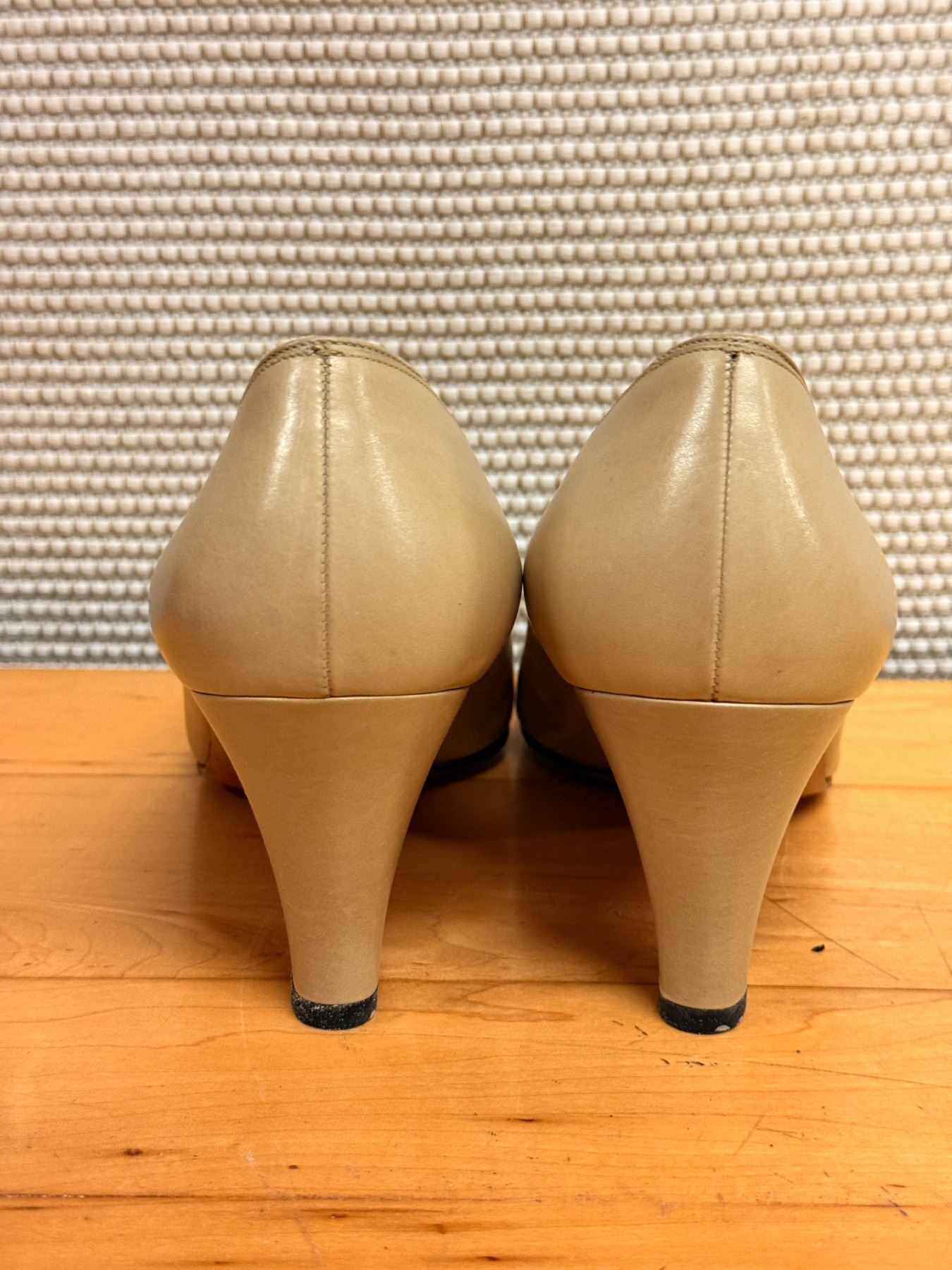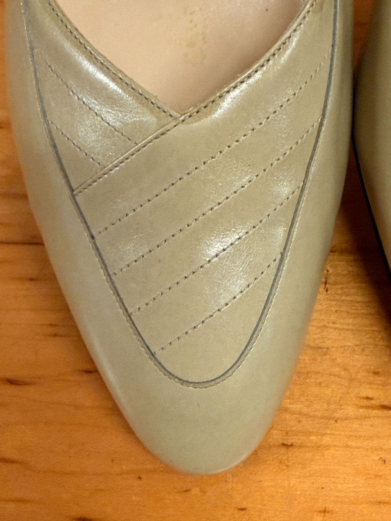 Vintage Salvatore Ferragamo cream leather almond-toe pumps featuring stitched detailing, smooth leather uppers, and classic Italian craftsmanship. Elegant, versatile, and timeless. New and unworn, stored for years; heel requires repair due to storage wear.