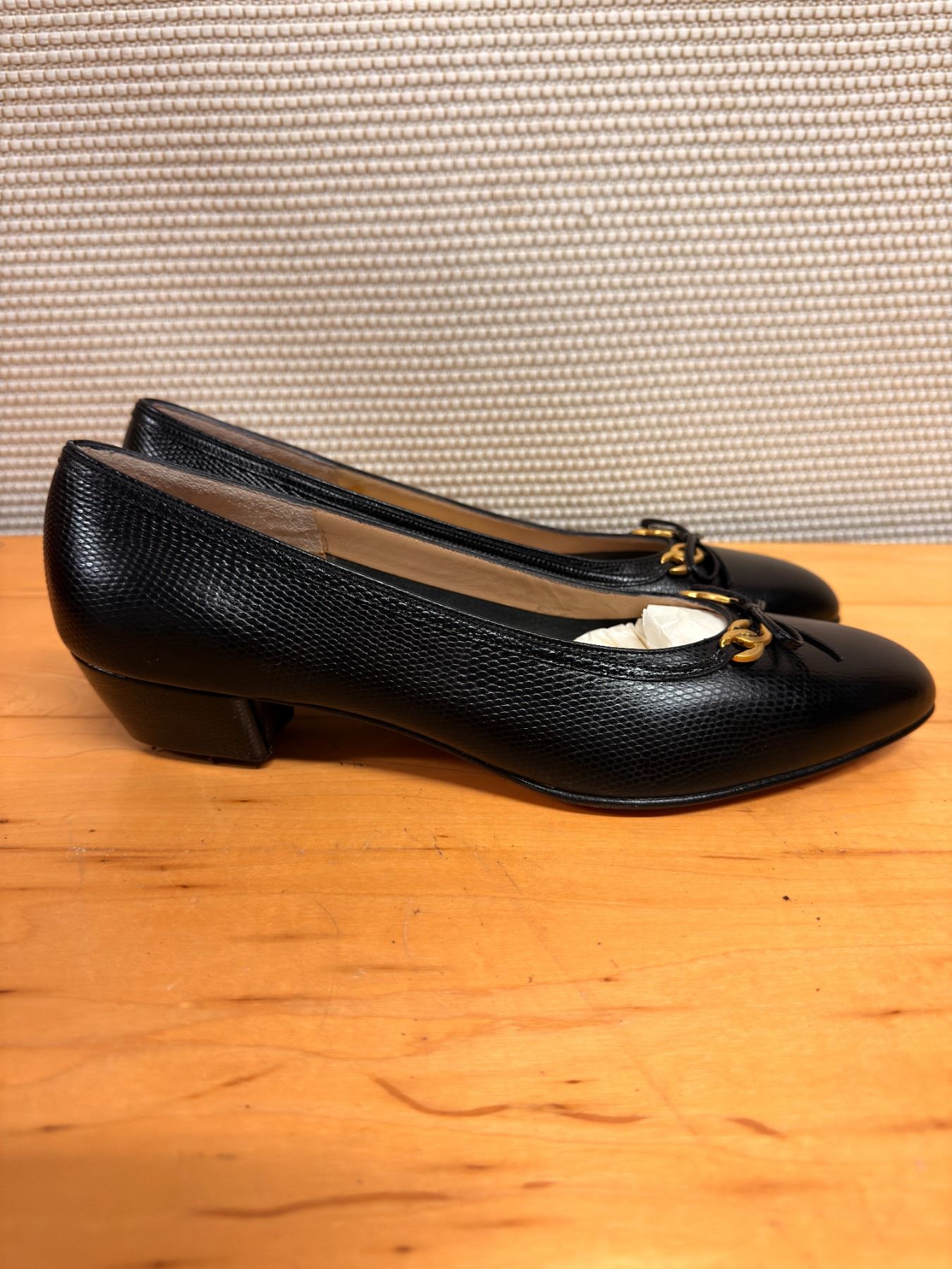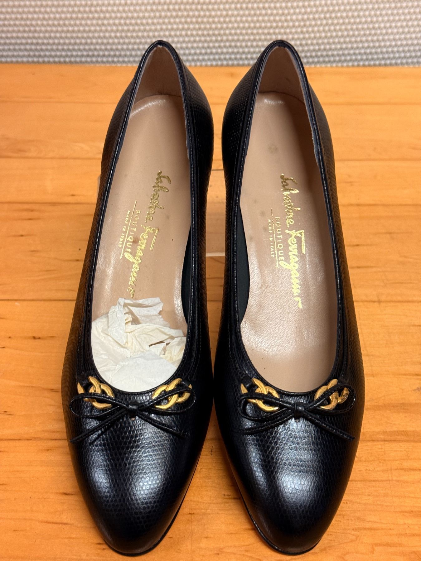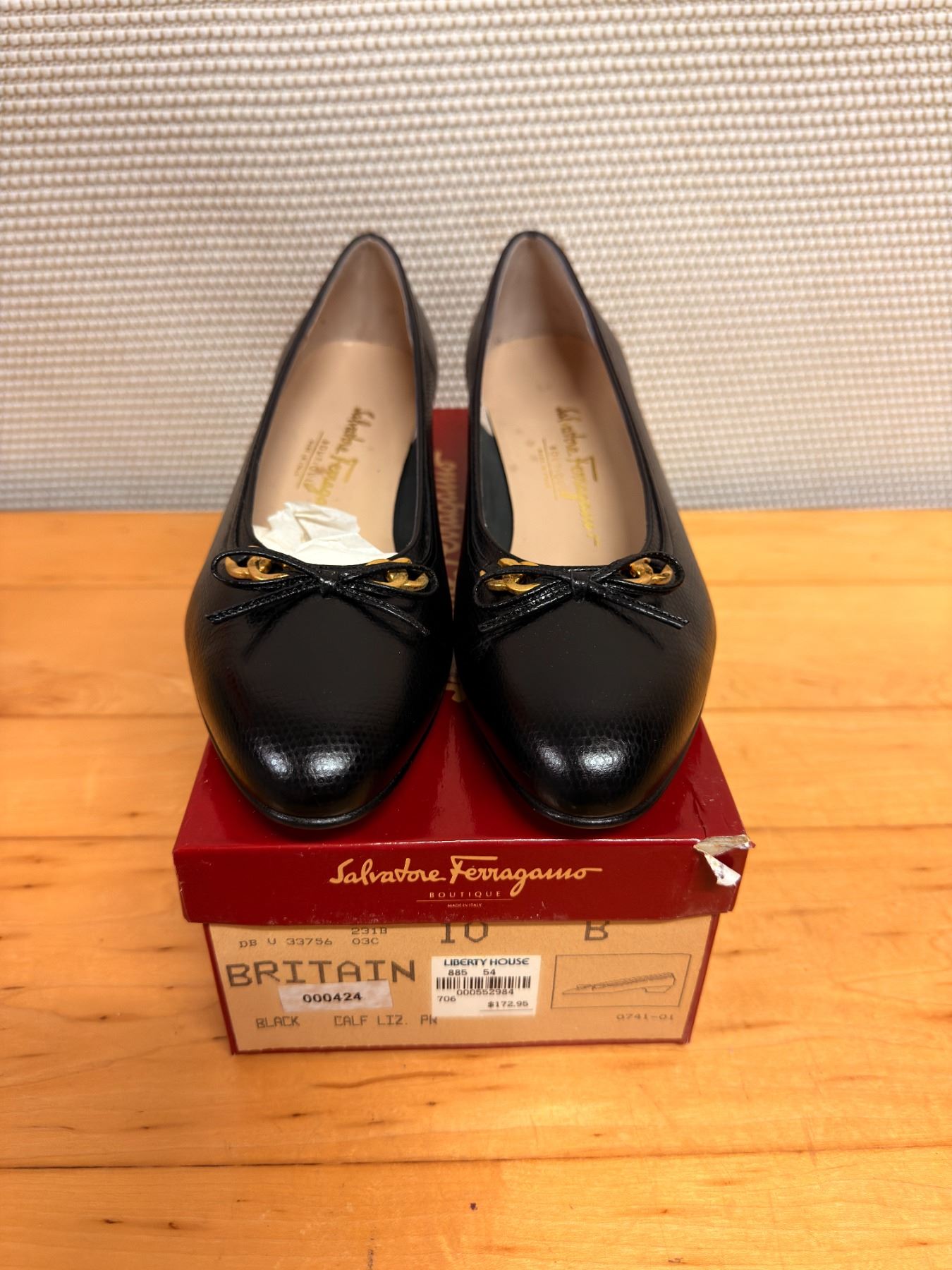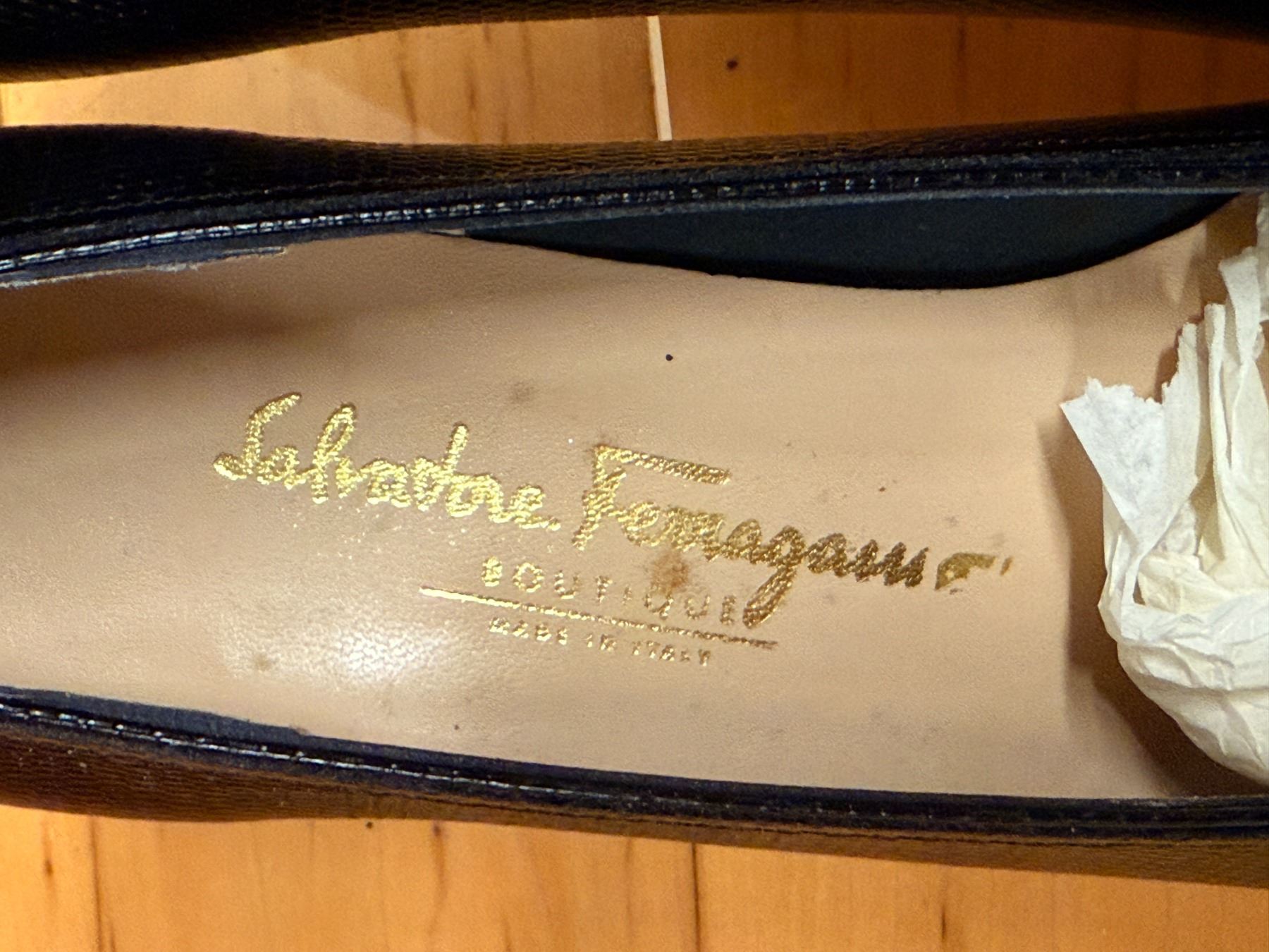 Salvatore Ferragamo shoes with a Gancini buckle and bow are an iconic style from the brand. New and unworn, stored for years; heel requires repair due to storage wear.