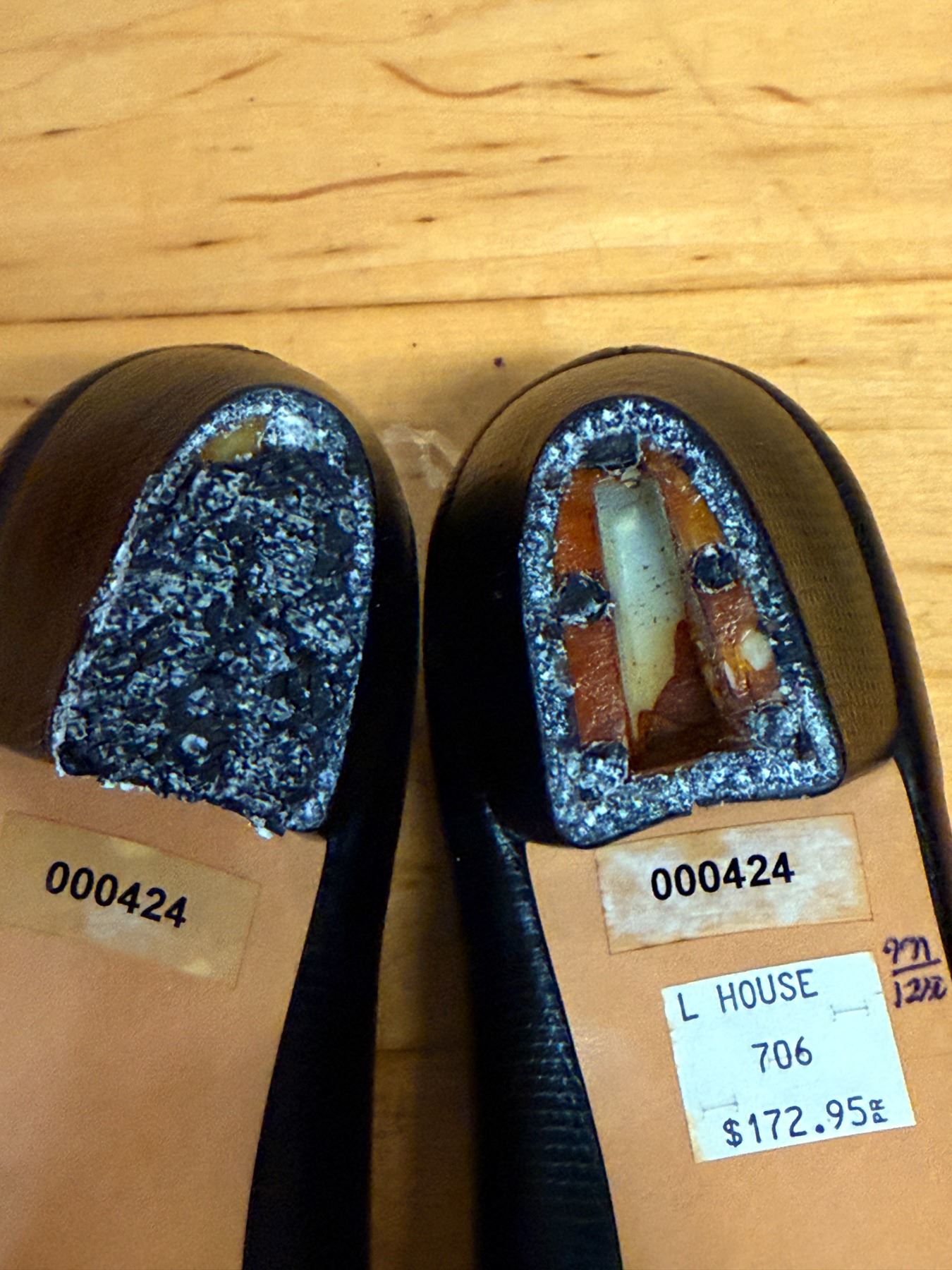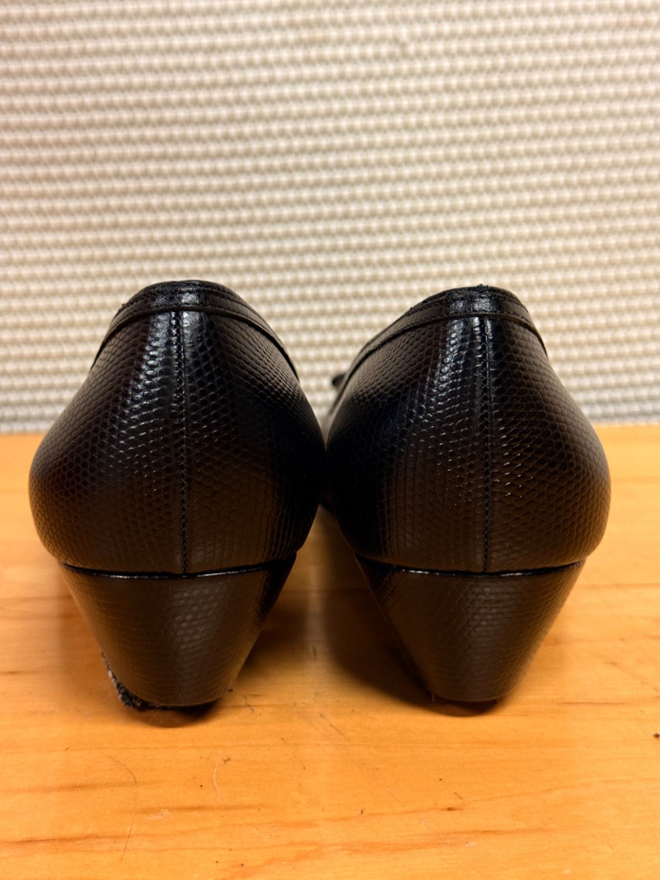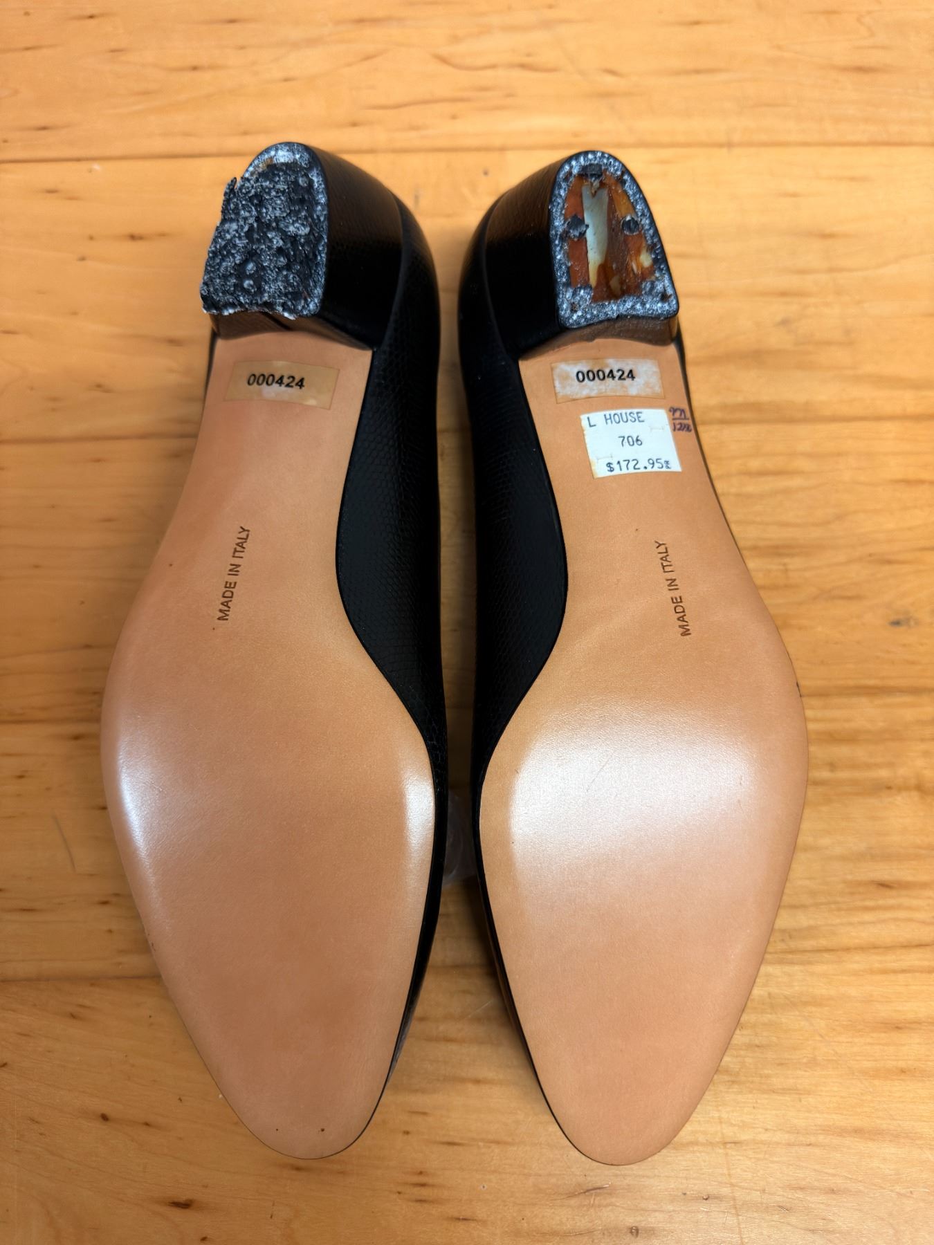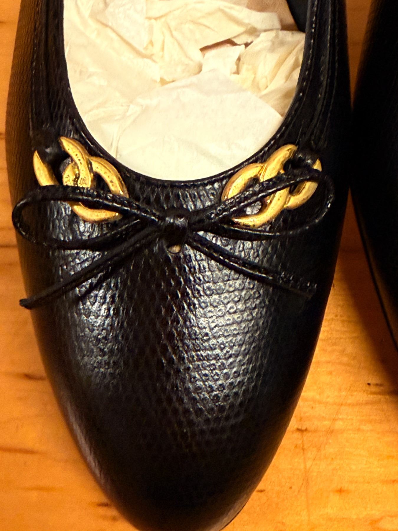 Salvatore Ferragamo shoes with a Gancini buckle and bow are an iconic style from the brand. New and unworn, stored for years; heel requires repair due to storage wear.