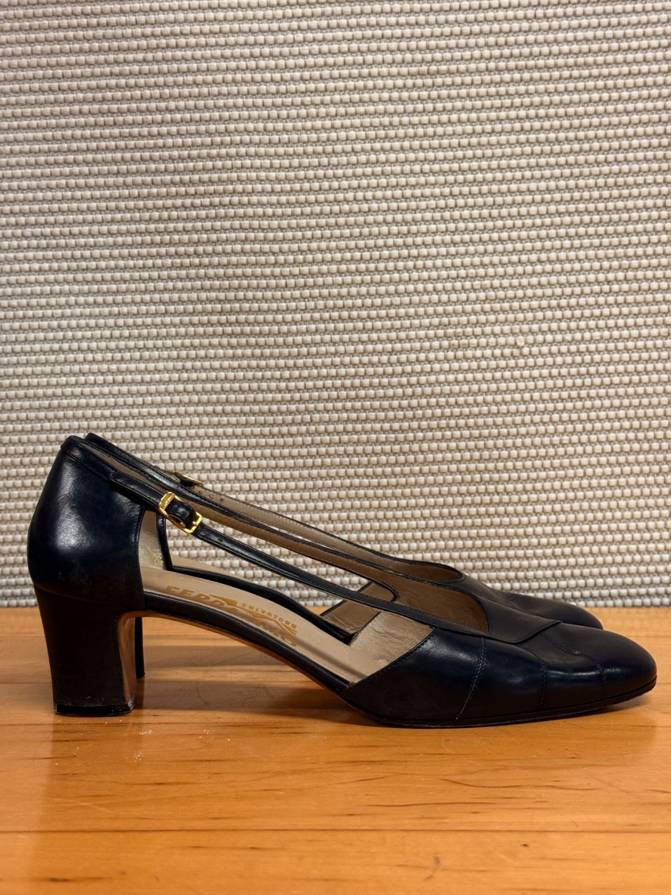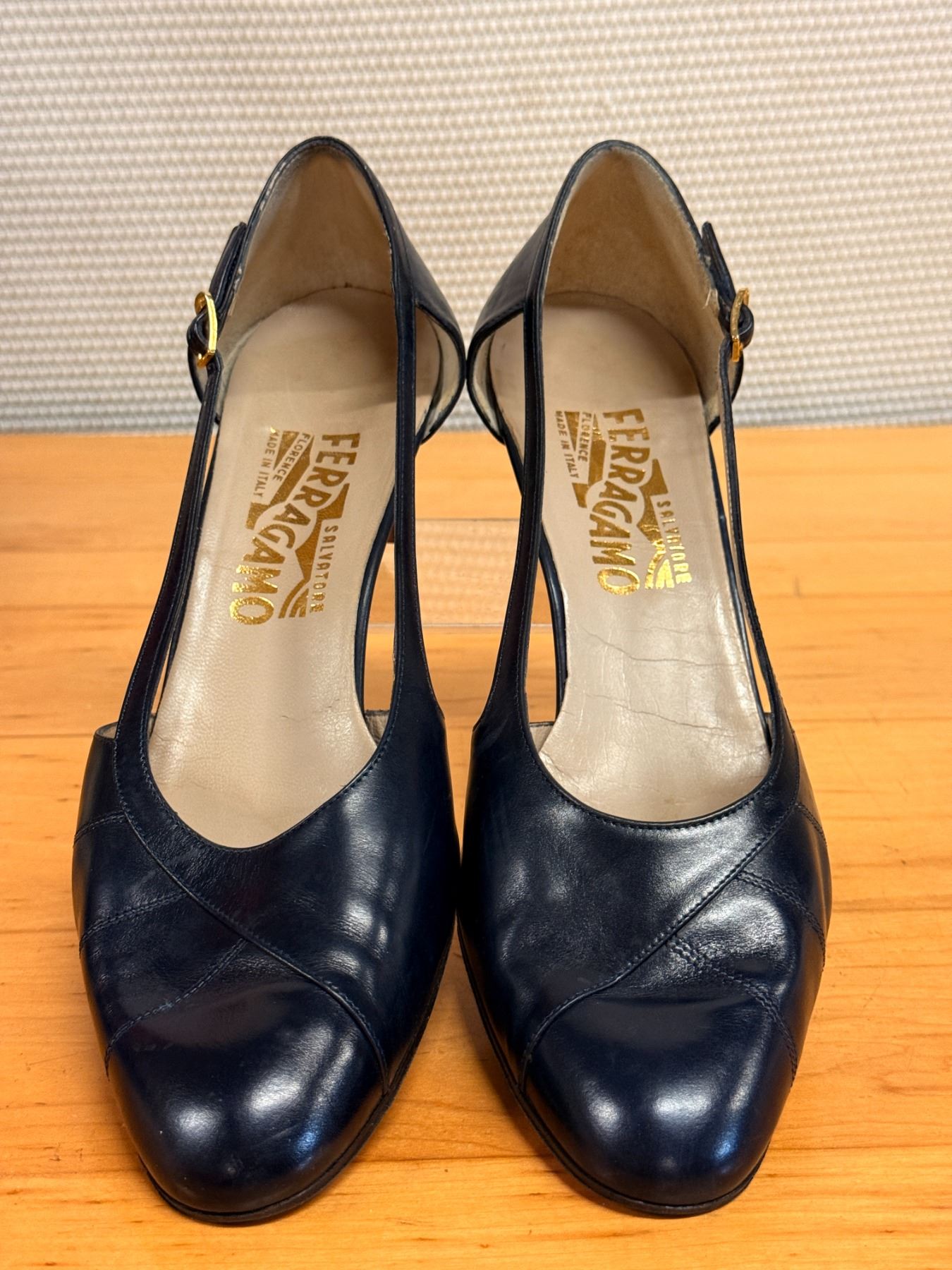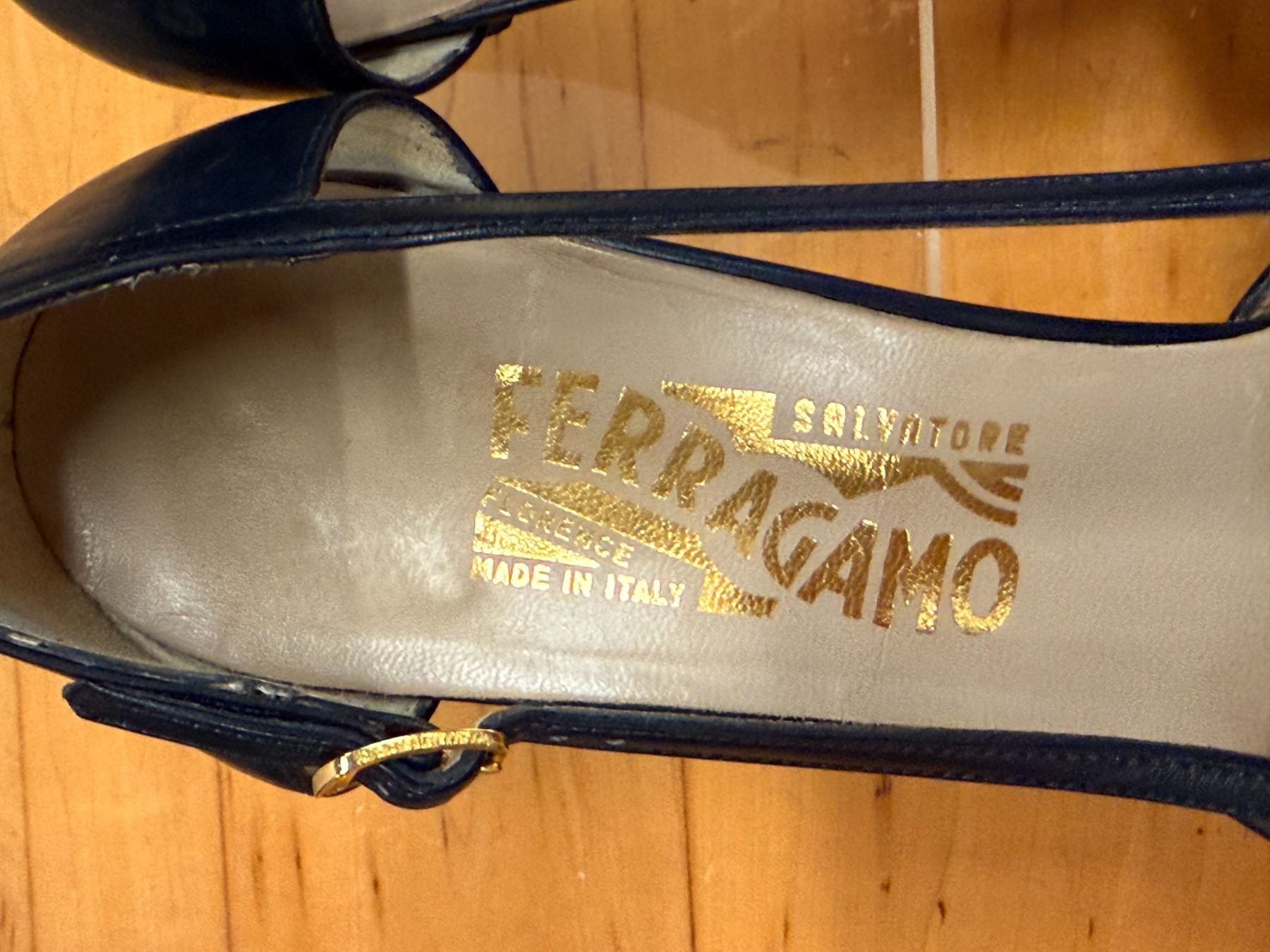 Classic navy Salvatore Ferragamo pumps featuring soft leather construction, elegant cross-stitched toe detailing, and adjustable gold buckle ankle straps. Timeless Italian craftsmanship with a comfortable, feminine fit. Used stored for years; heels and soles have some signs of wear due to storage wear.