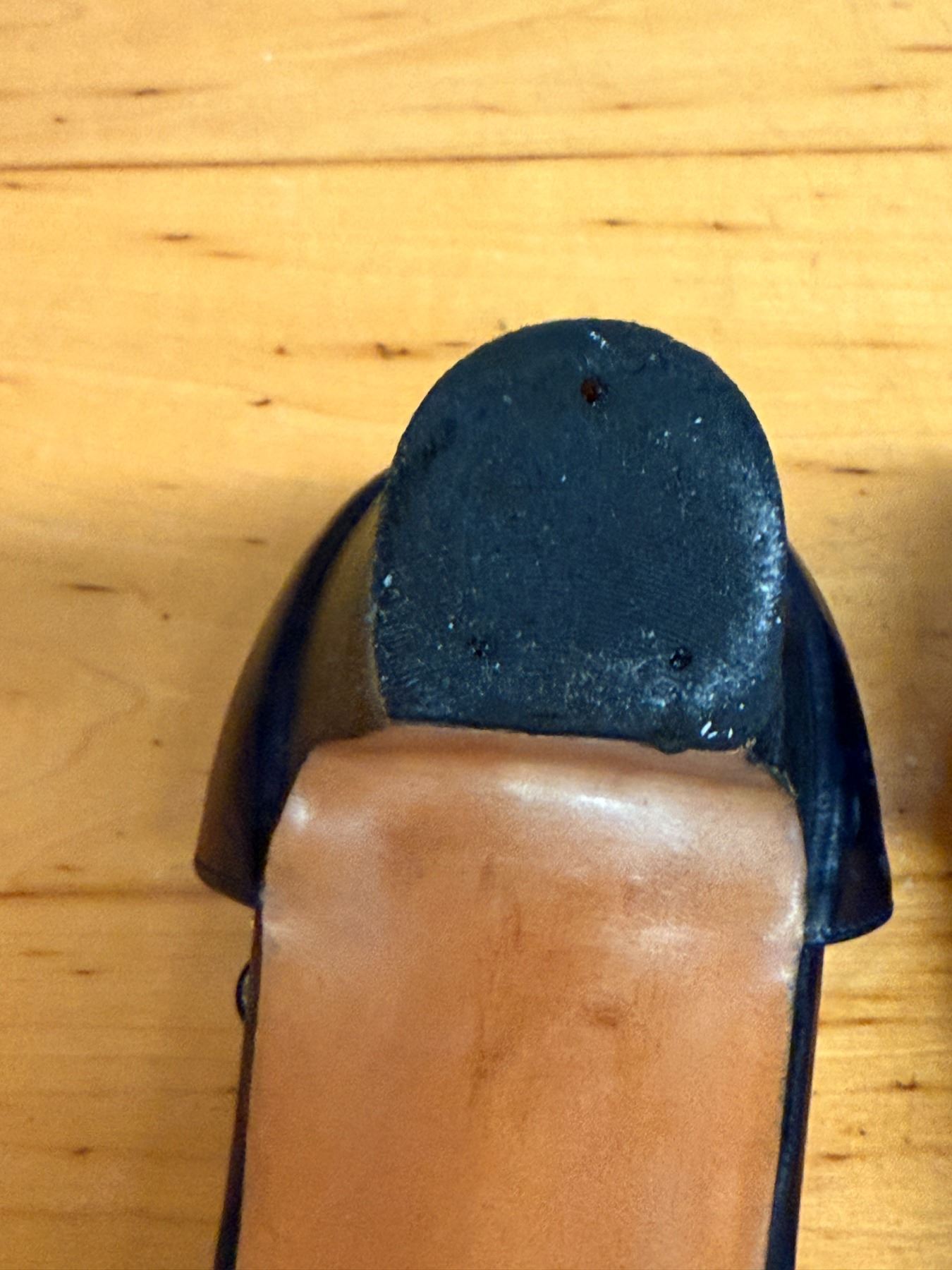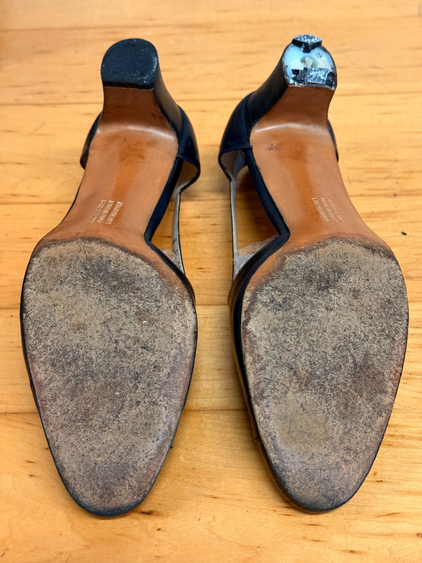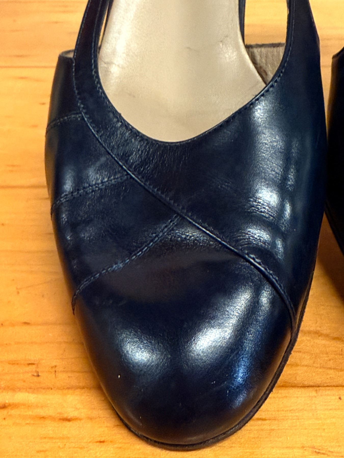 Classic navy Salvatore Ferragamo pumps featuring soft leather construction, elegant cross-stitched toe detailing, and adjustable gold buckle ankle straps. Timeless Italian craftsmanship with a comfortable, feminine fit. Used stored for years; heels and soles have some signs of wear due to storage wear.