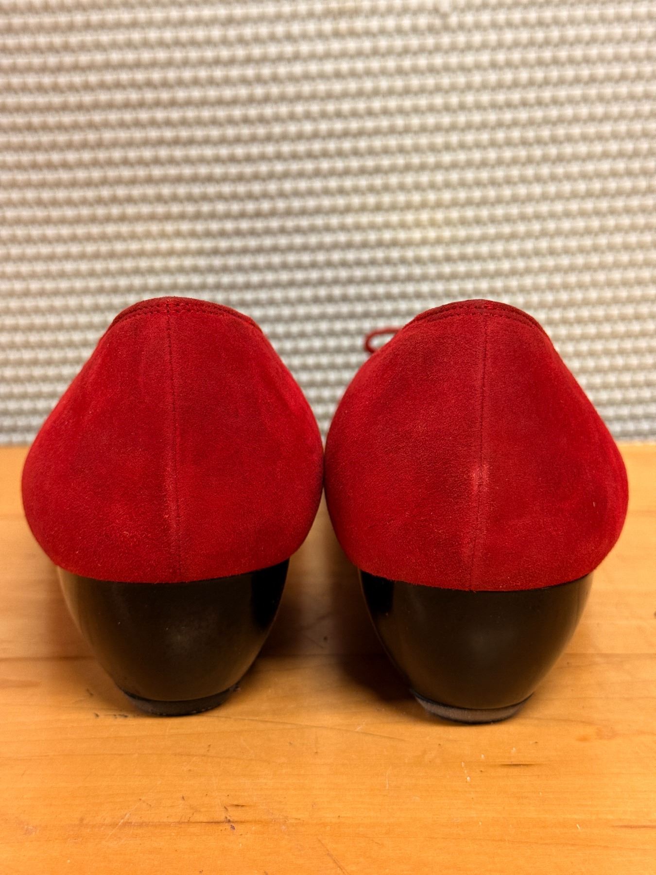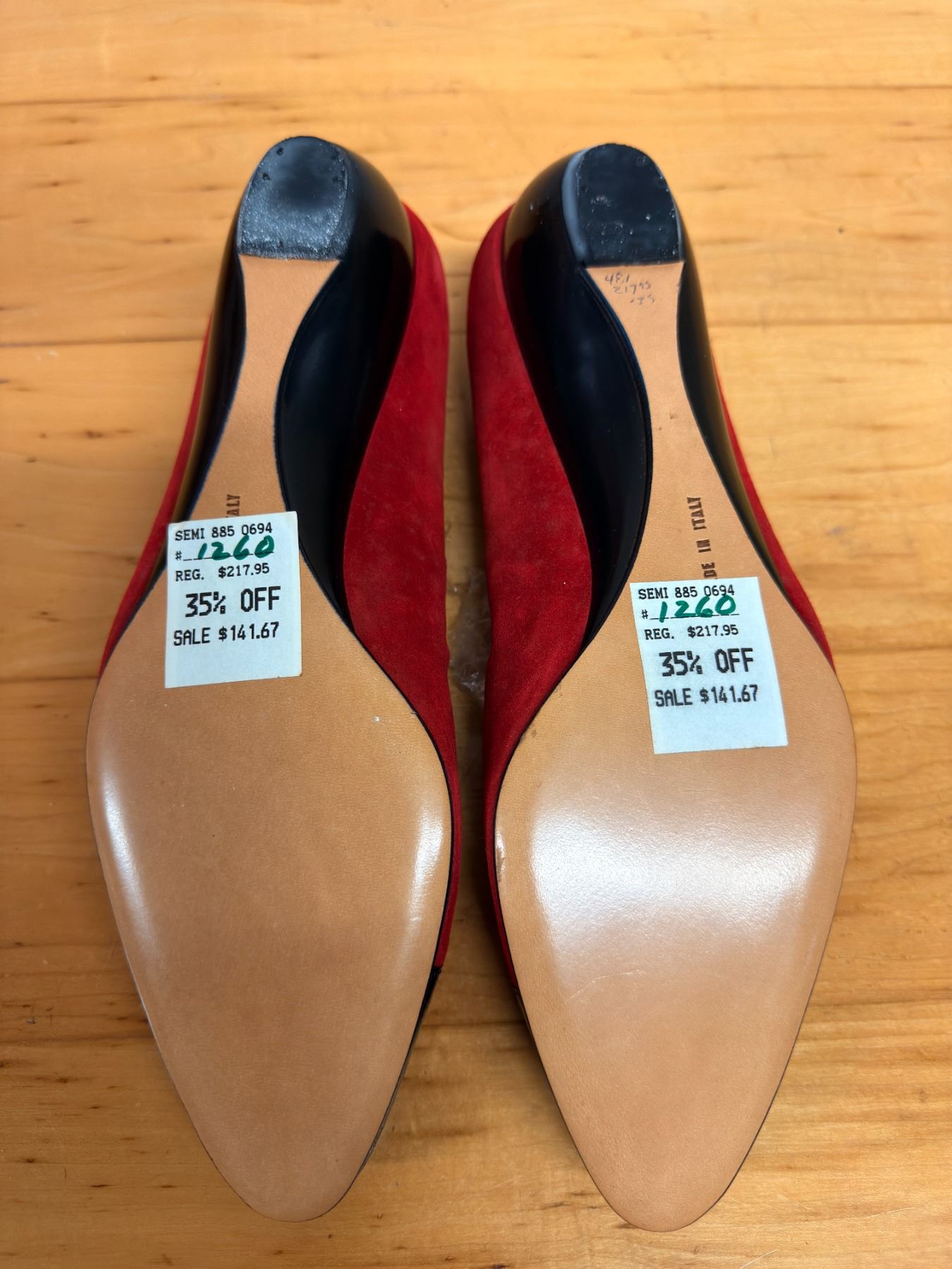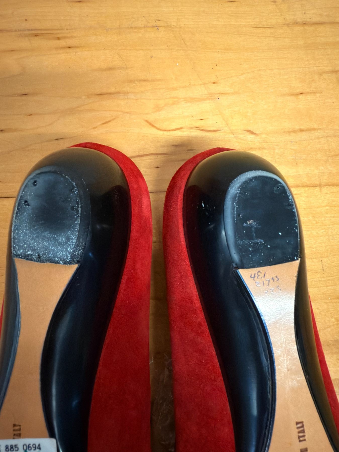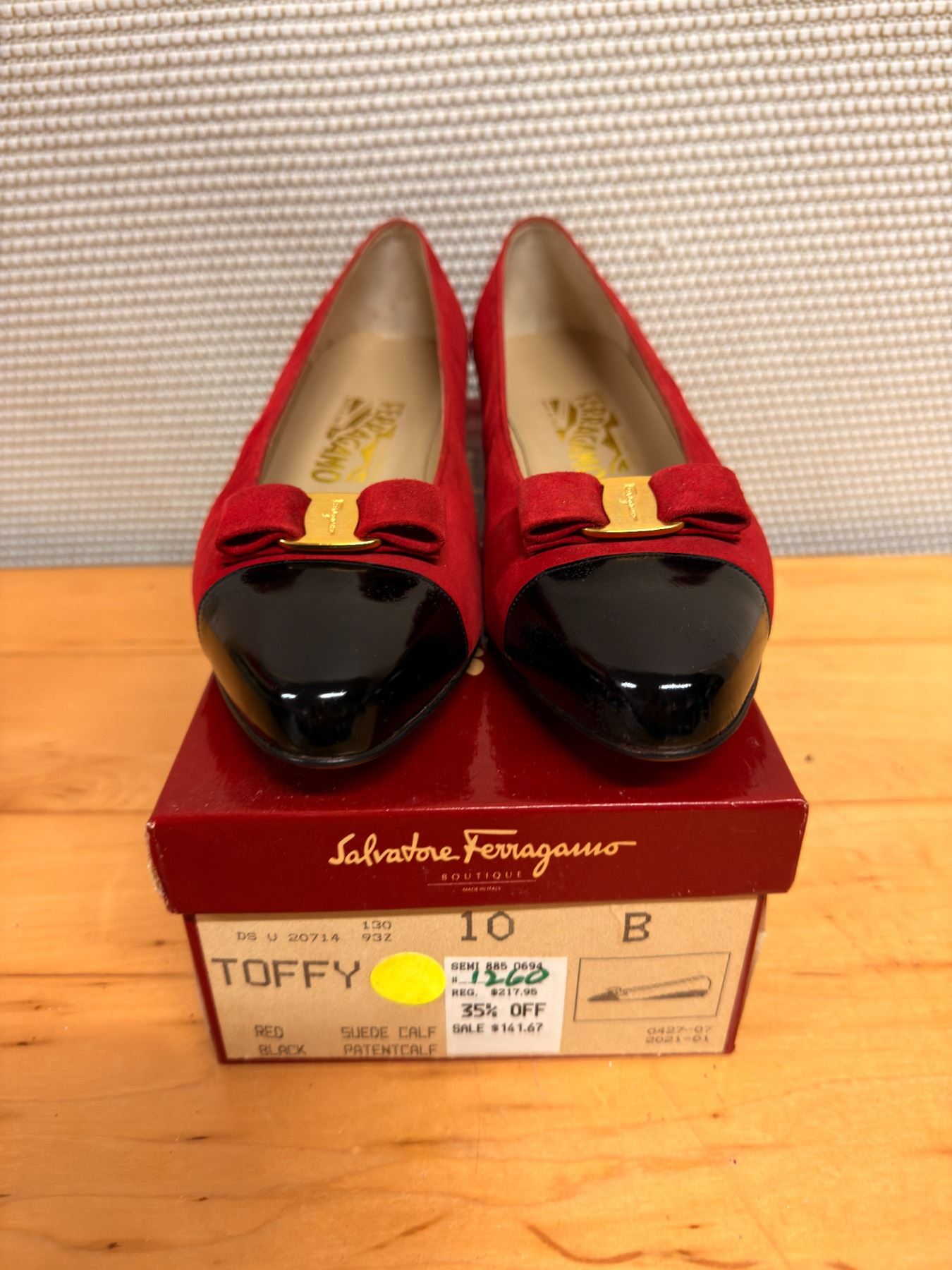 NEW Ferragamo Suede Patent Leather Flats, Red w/ Black, Sz 10B (heel needs repair)