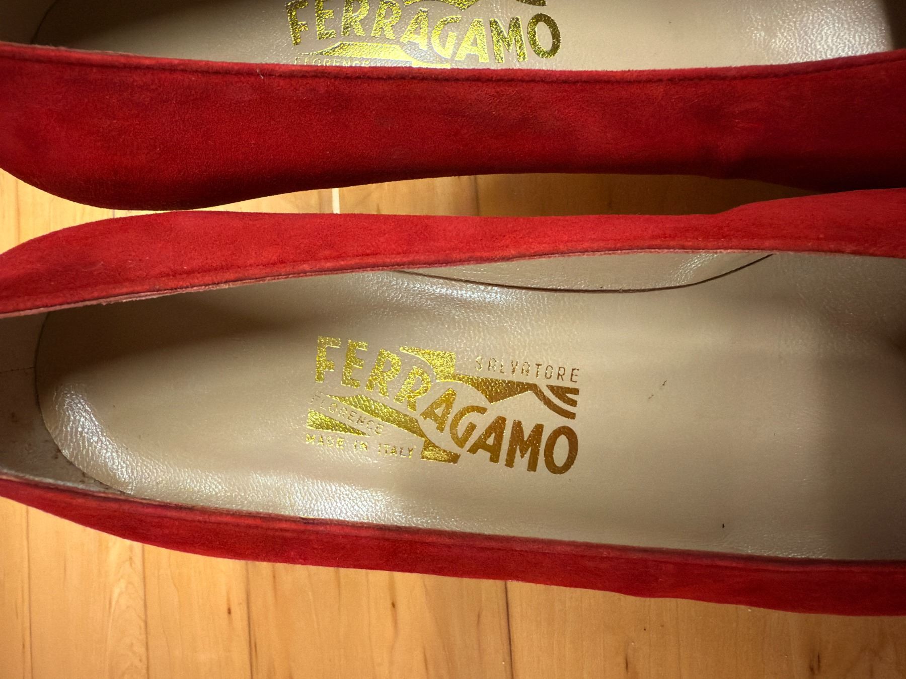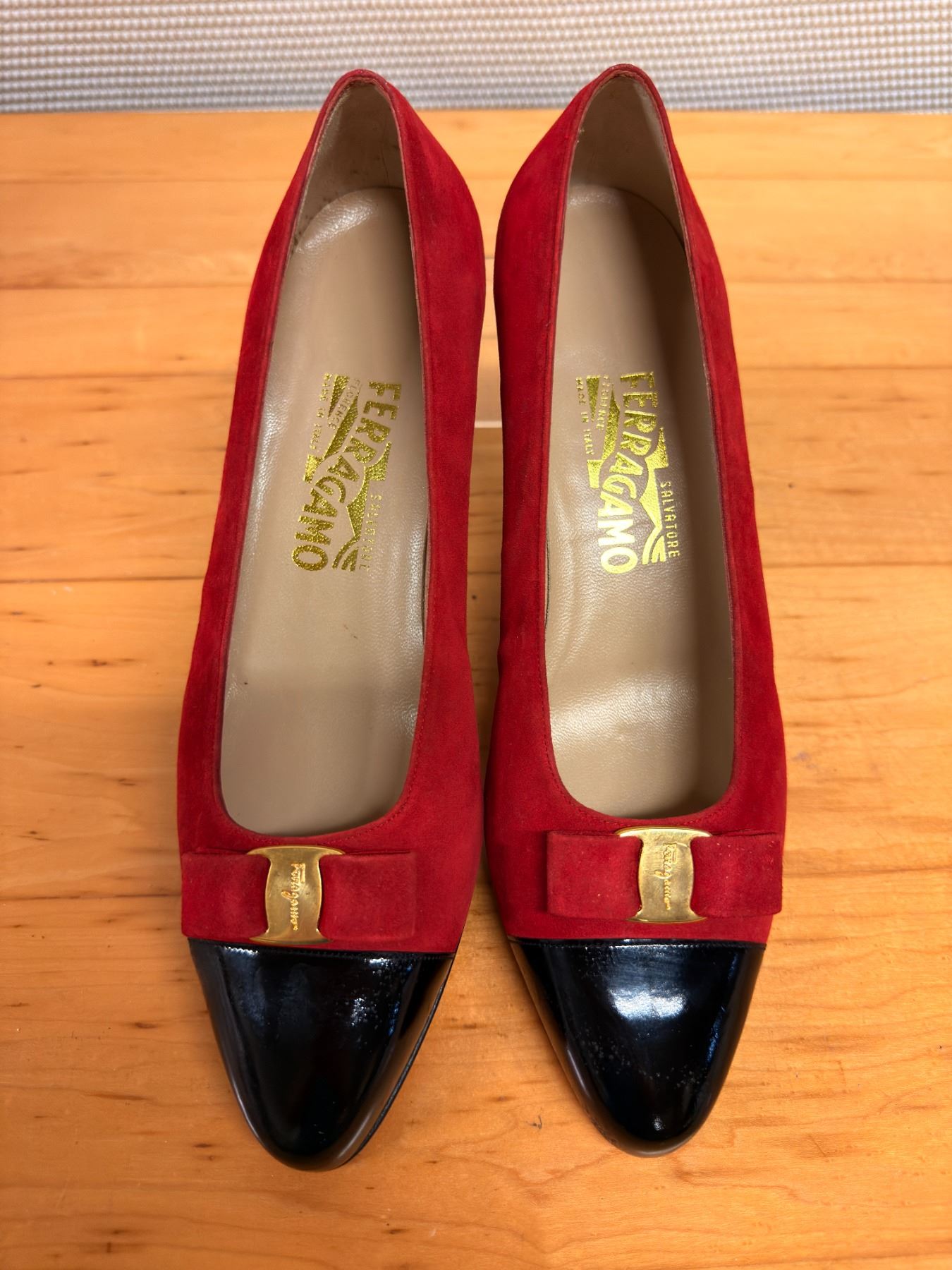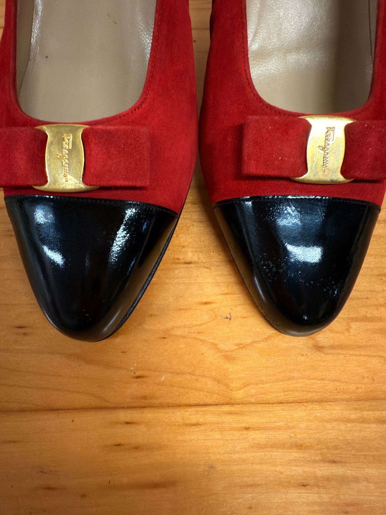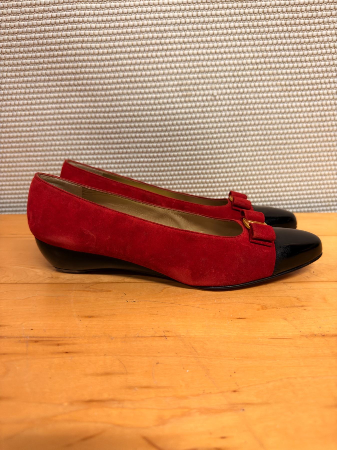 Salvatore Ferragamo Vara Suede Red Wedge flats These are women's shoes featuring a red suede upper, a black patent leather cap toe, and a bow with a gold-tone buckle. New and unworn, stored for years; heel requires repair due to storage wear.