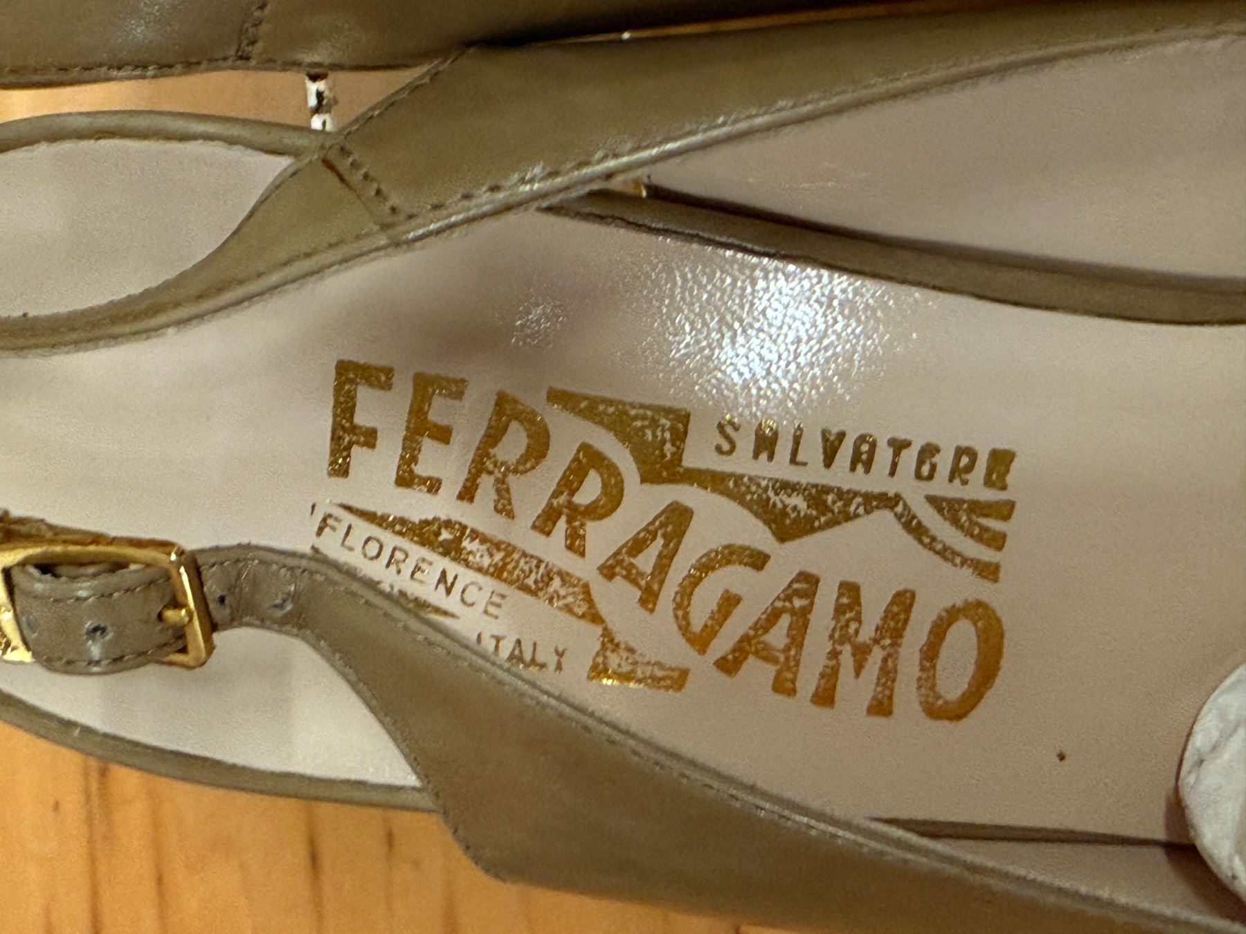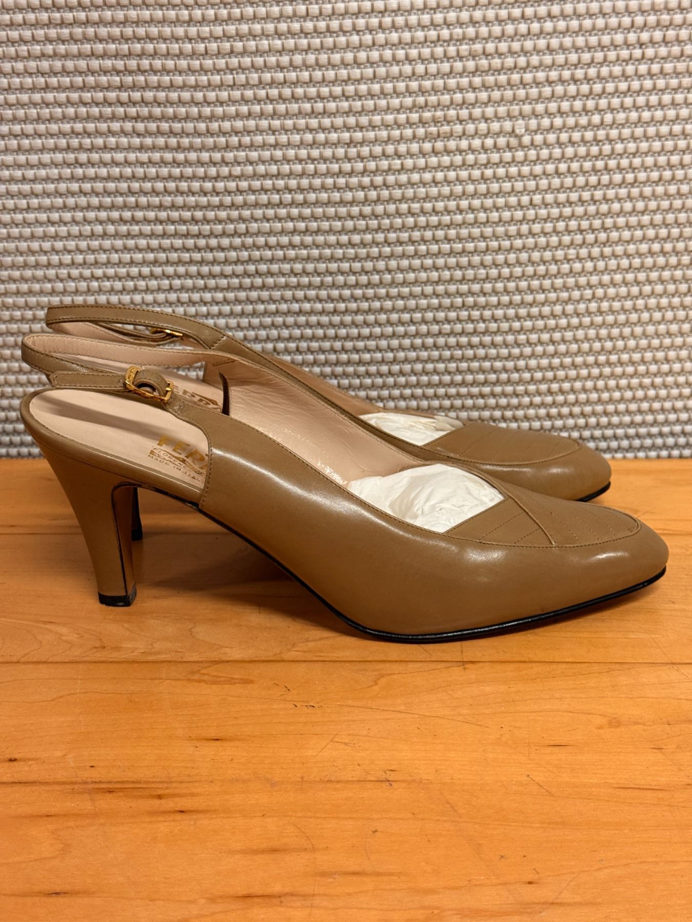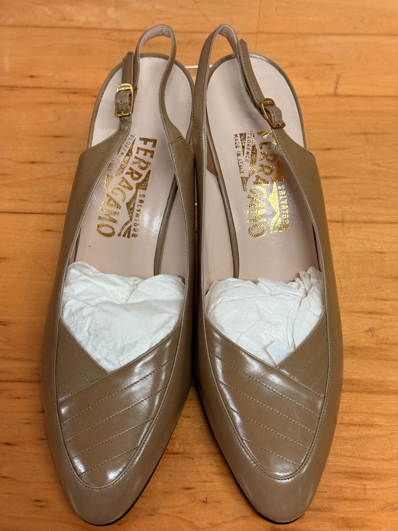 Vintage Salvatore Ferragamo taupe leather slingback pumps featuring stitched detailing, smooth leather uppers, and classic Italian craftsmanship. Elegant, versatile, and timeless. New and unworn, stored for years; heel requires repair due to storage wear.