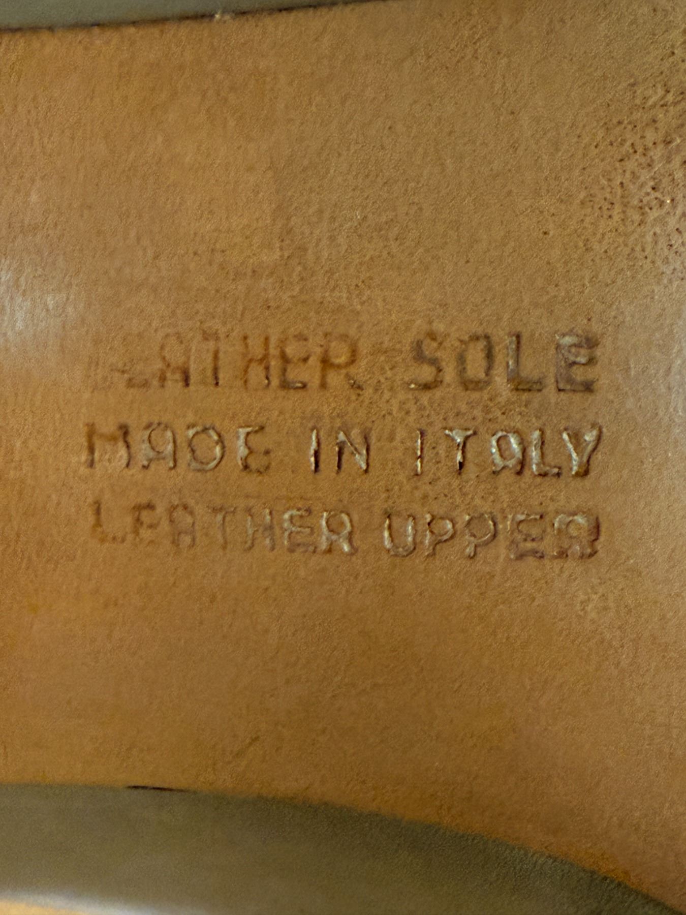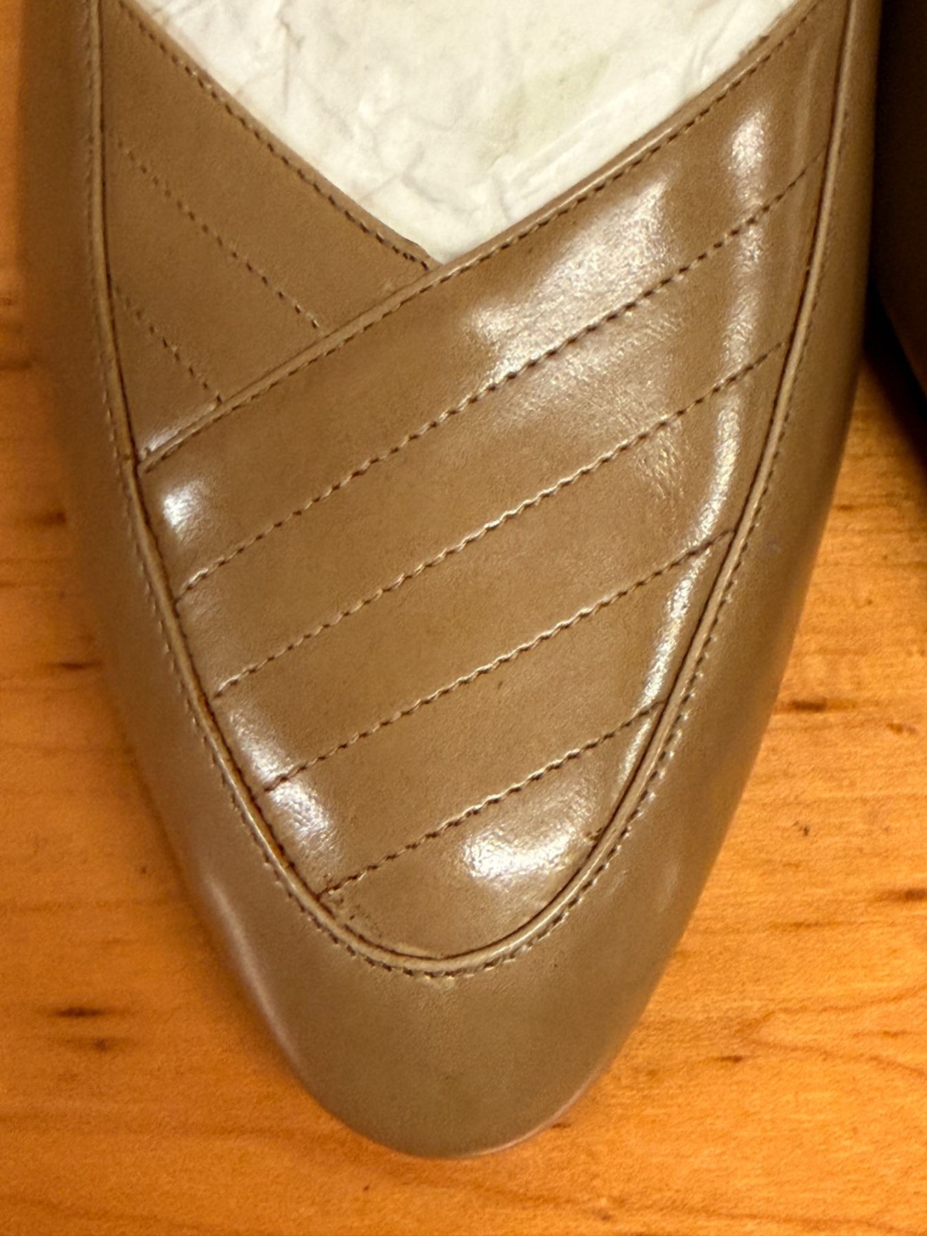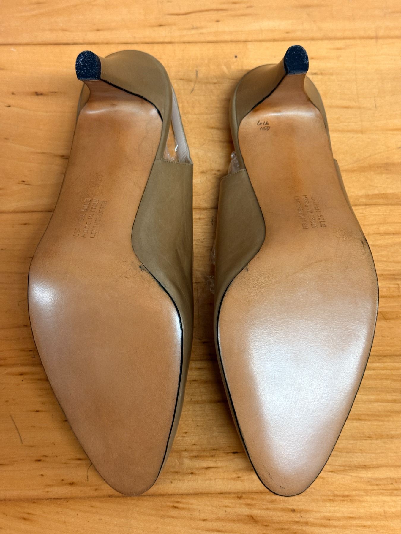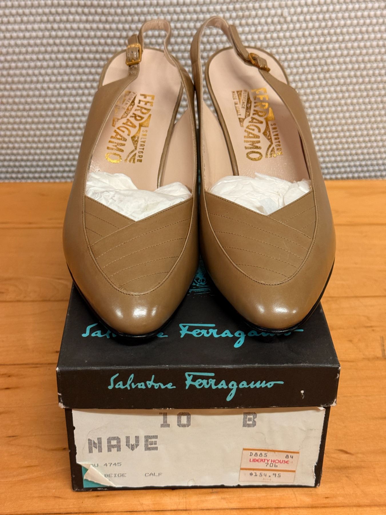 Vintage Salvatore Ferragamo taupe leather slingback pumps featuring stitched detailing, smooth leather uppers, and classic Italian craftsmanship. Elegant, versatile, and timeless. New and unworn, stored for years; heel requires repair due to storage wear.